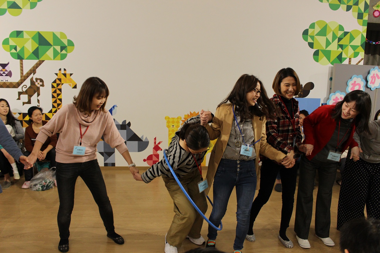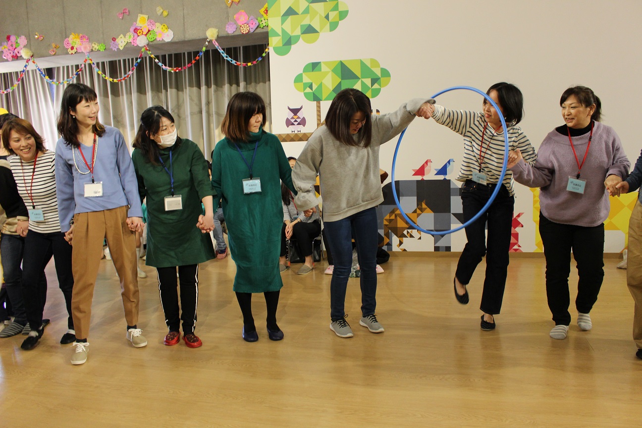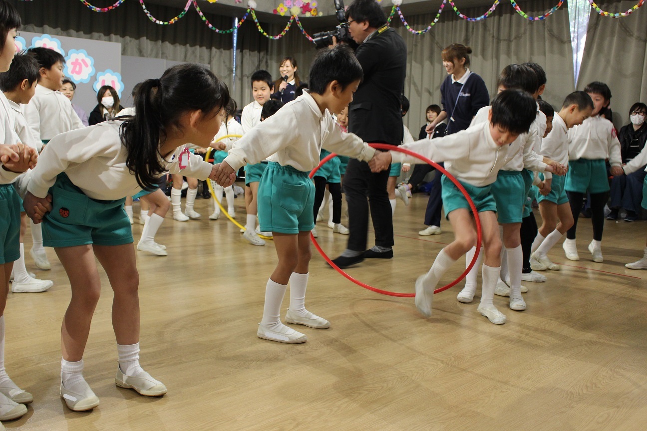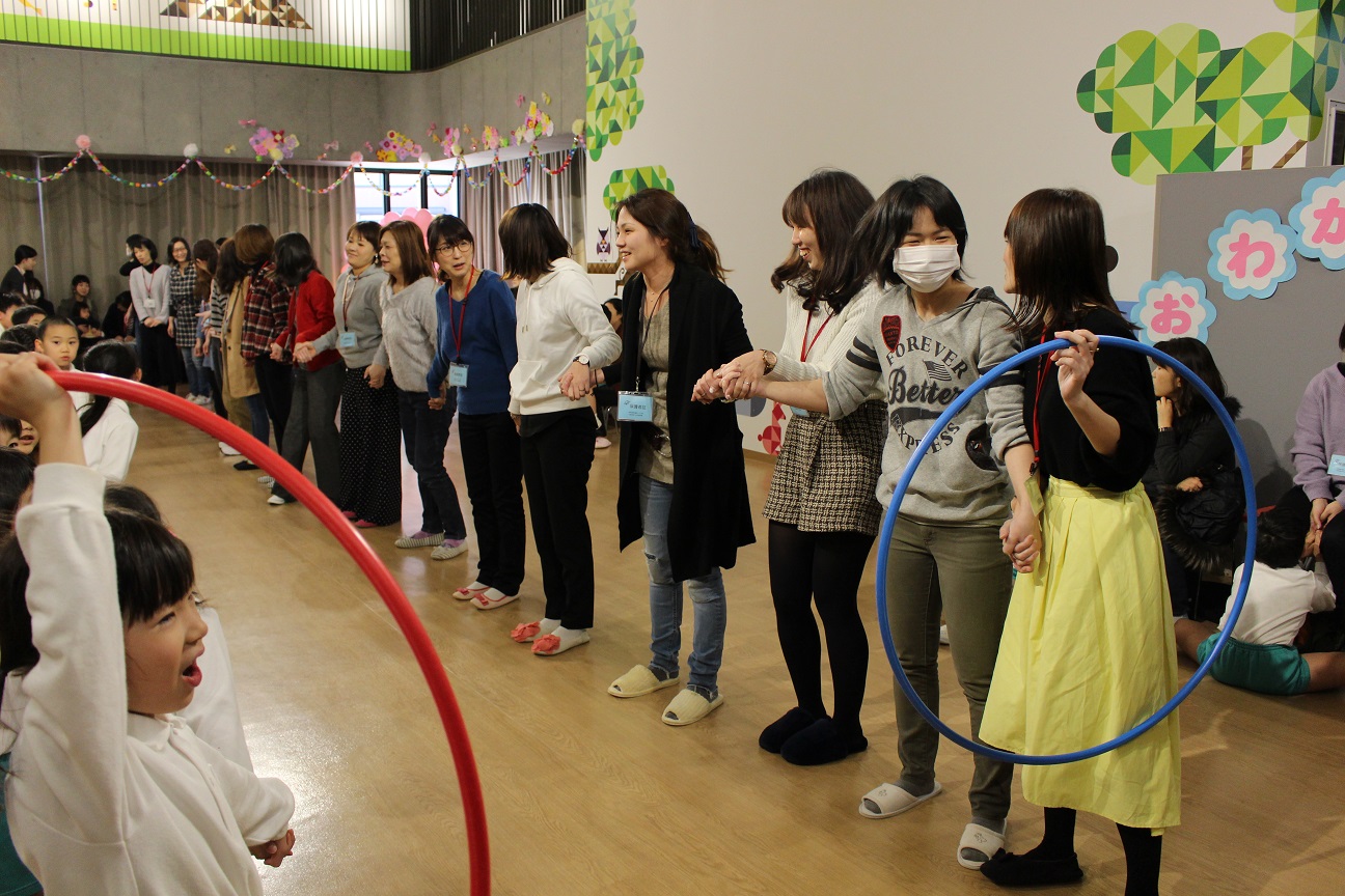 子どもたちvs保護者の方々でフープ早くぐり競争をしたり、