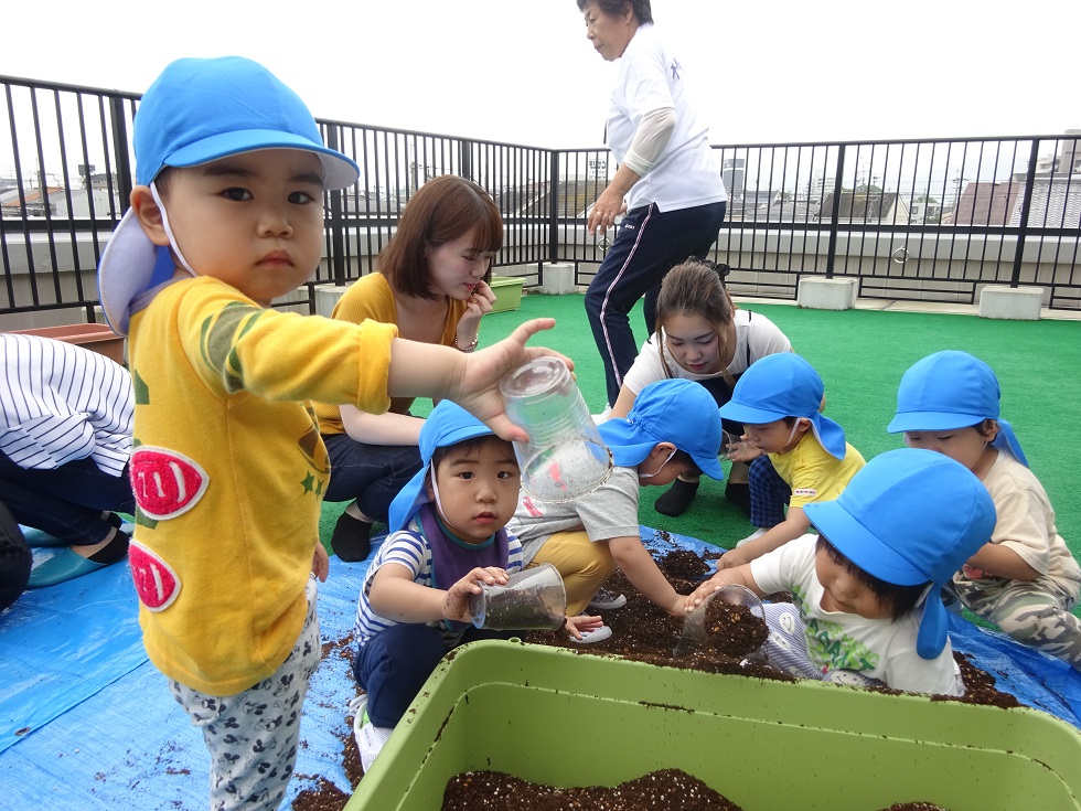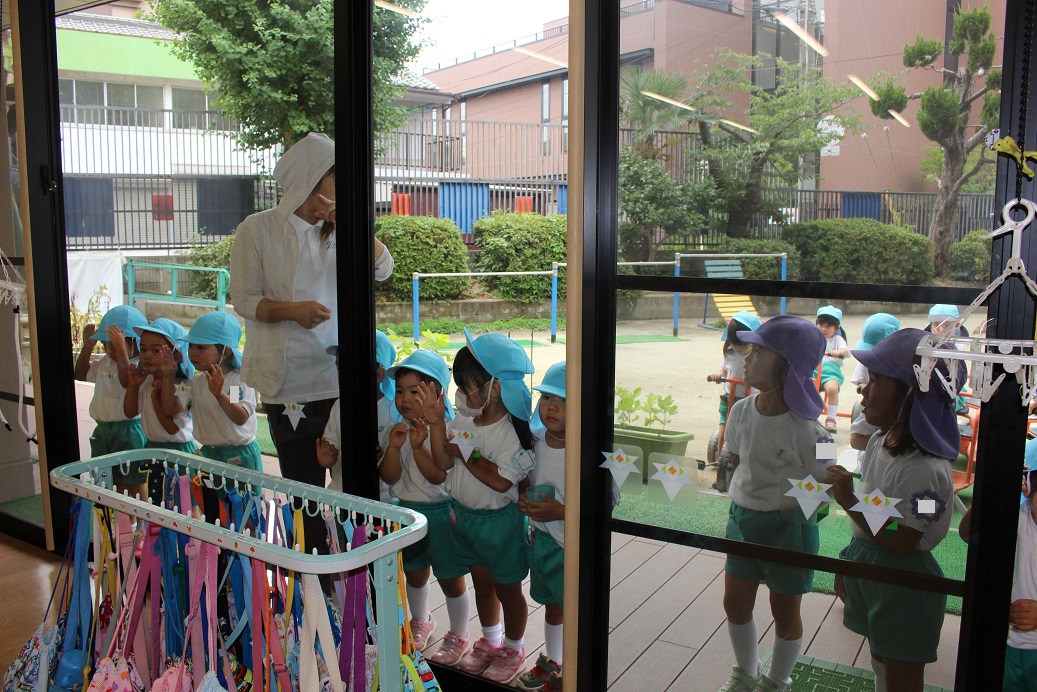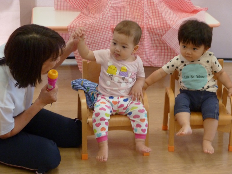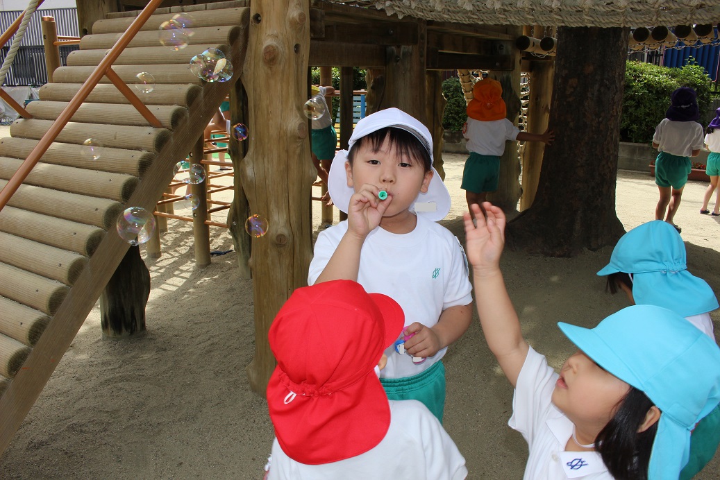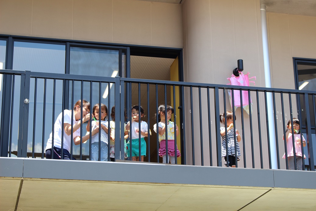 ひよこ組さんはテラスでしゃぼん玉♪かわいいですね♪
