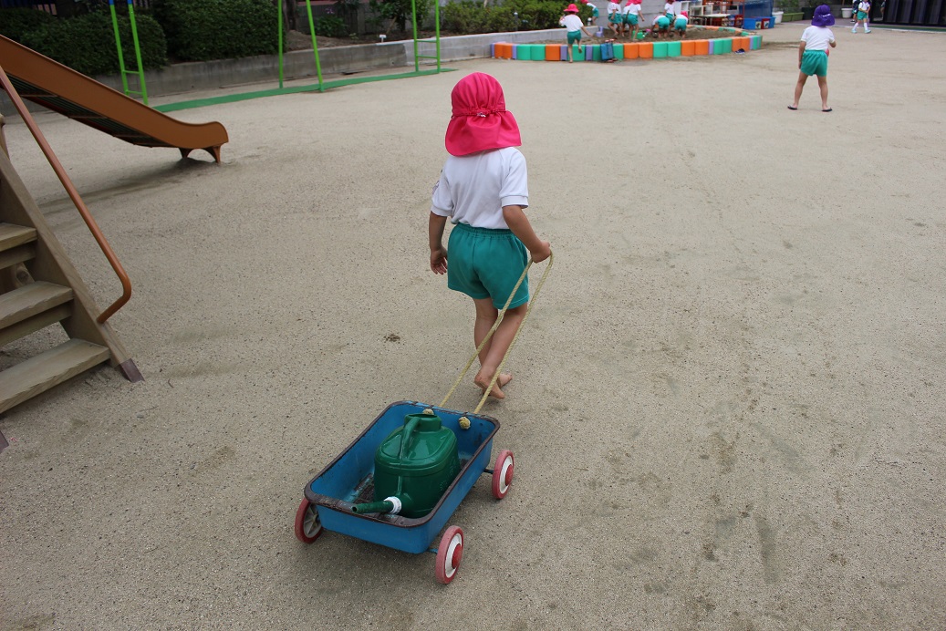 水道から砂場までじょうろを運ぶのは重たい・・・どうしよう(・_・?)