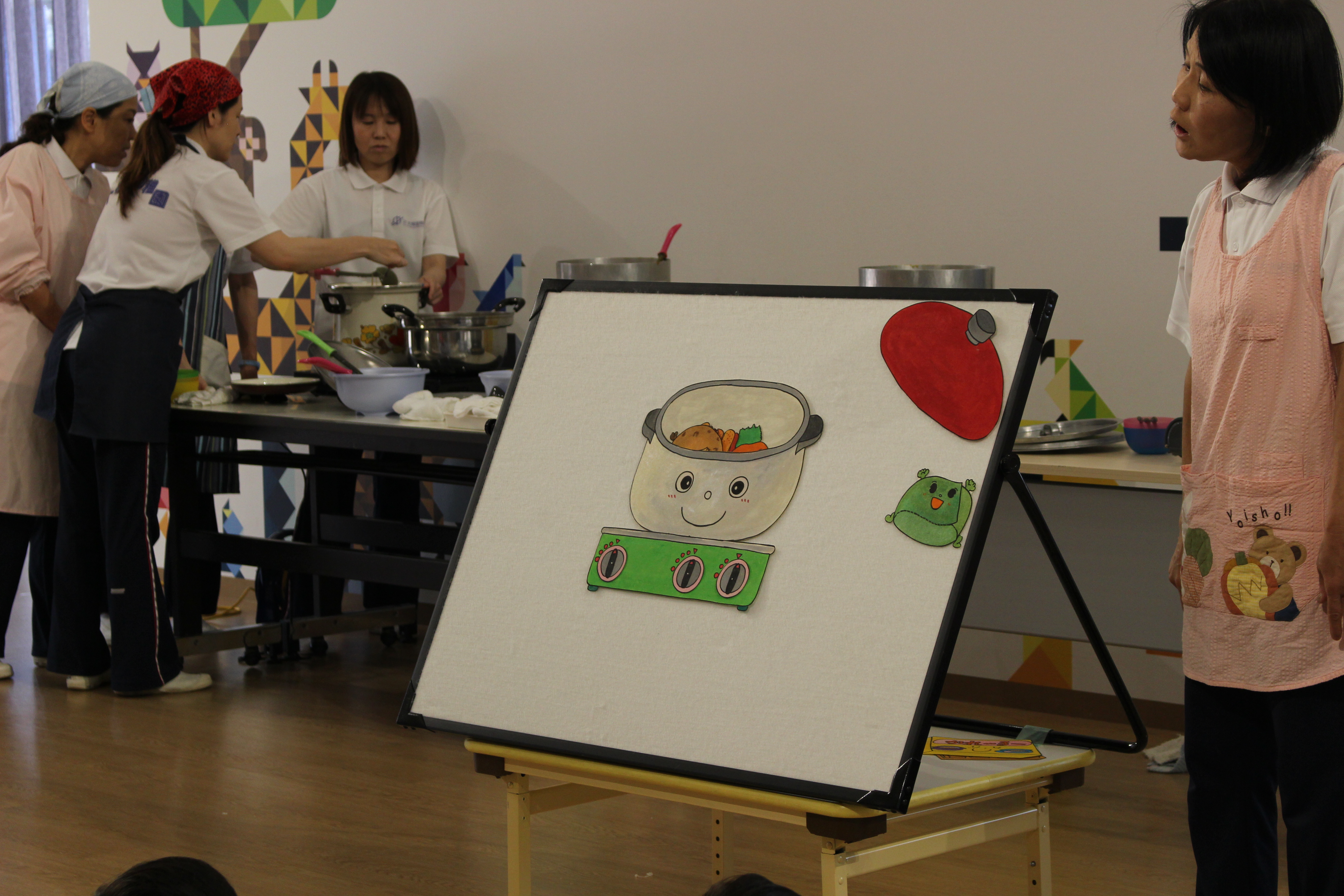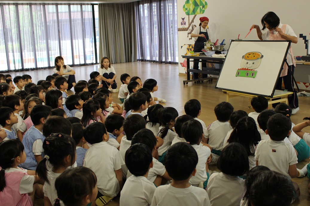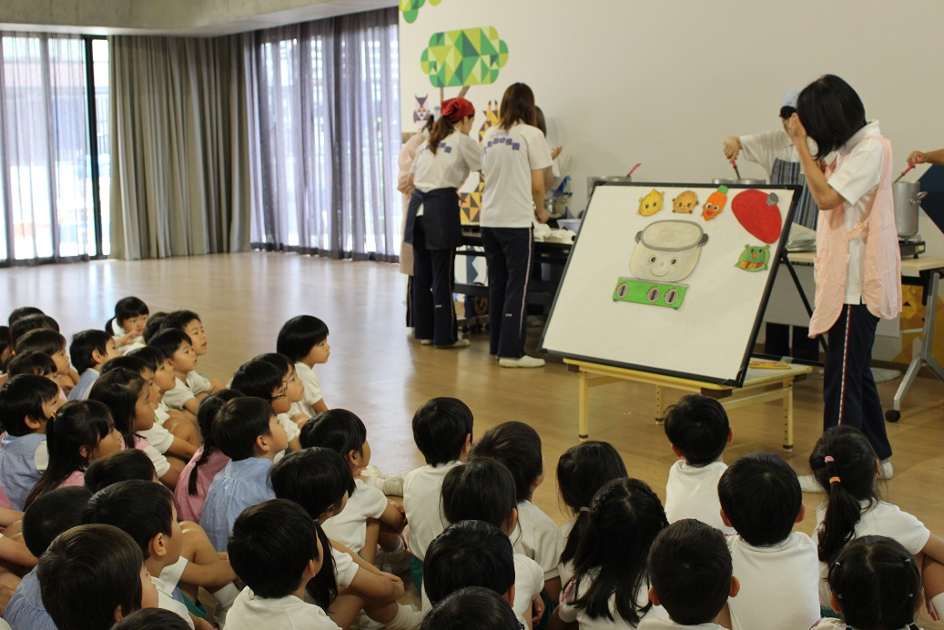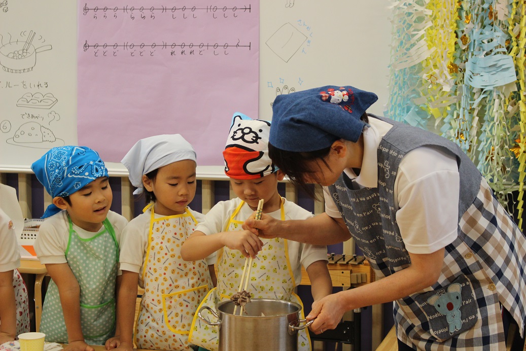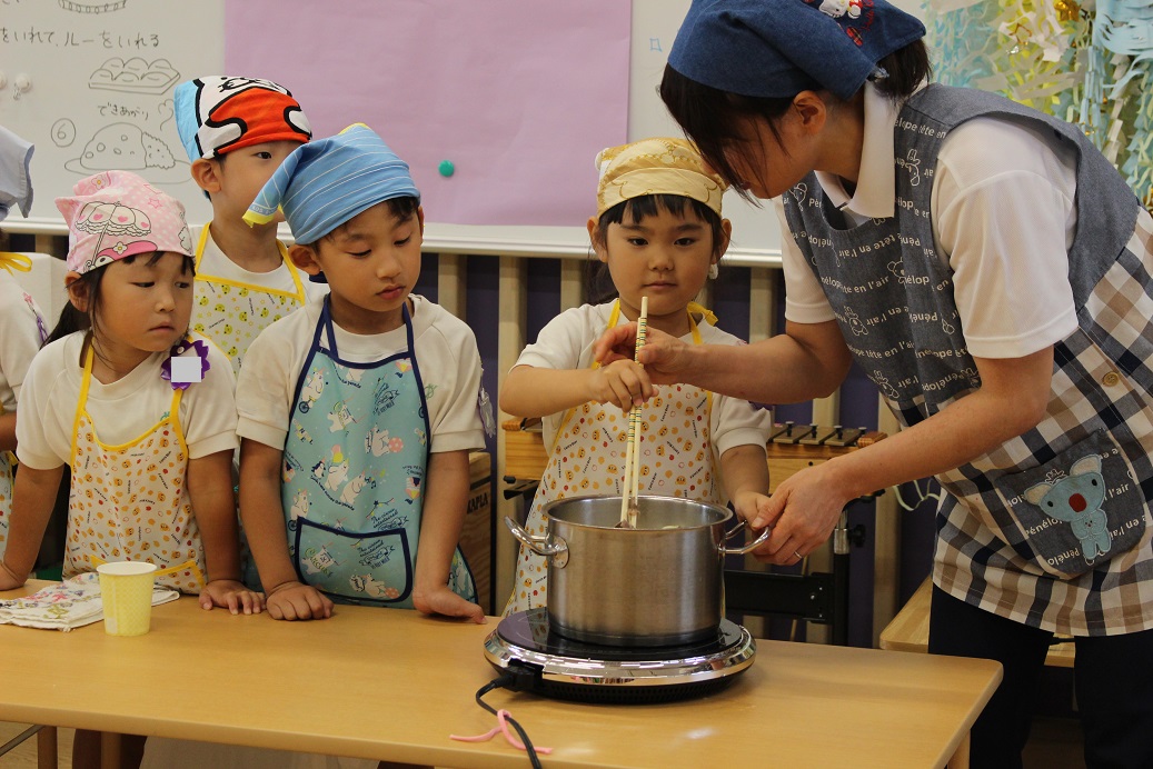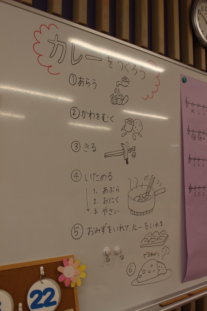 「カレーを作るには、鍋に何入れるかな?」と子どもたちに聞いてみると、