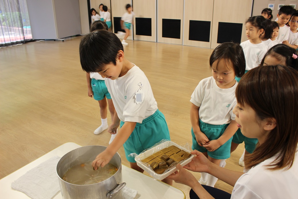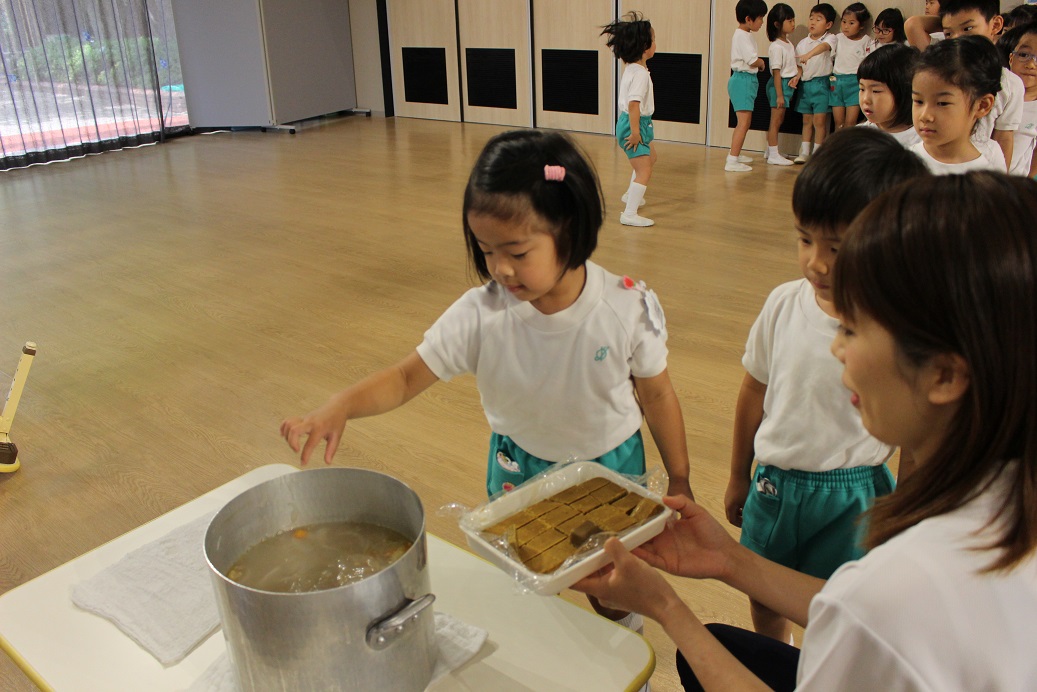 ひとり1つカレーのルーを持って、鍋に投入!