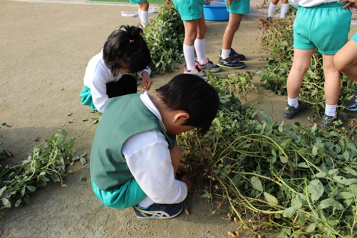 子どもたちは、たくさんの落花生に興味津々。