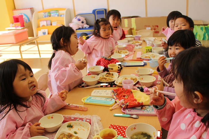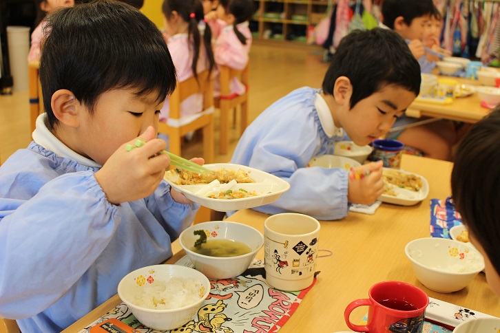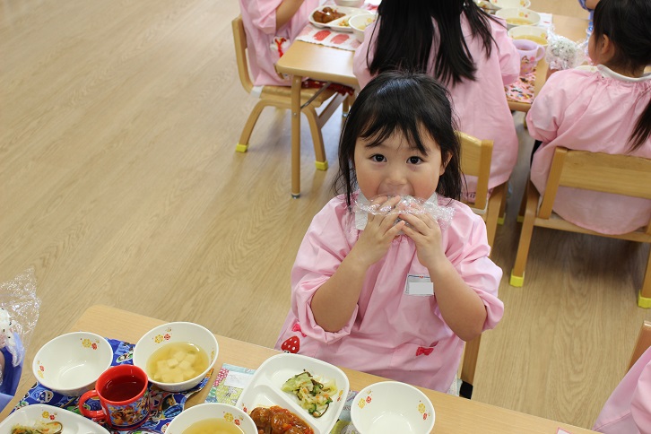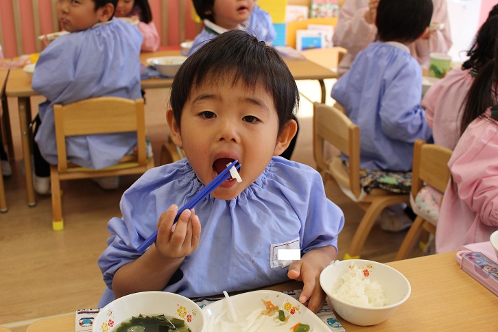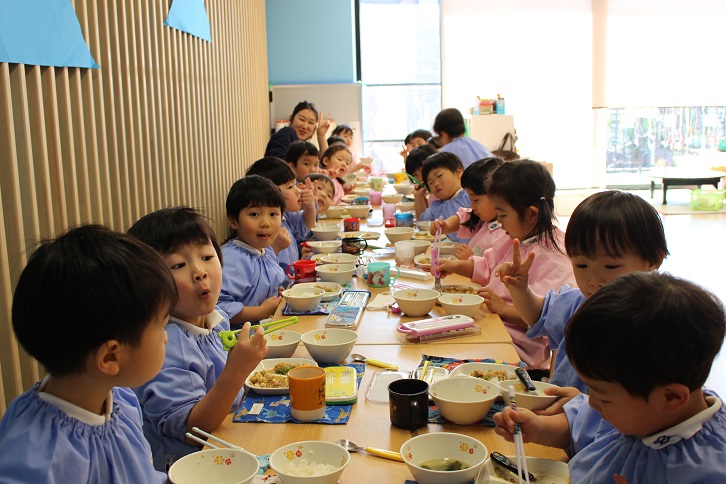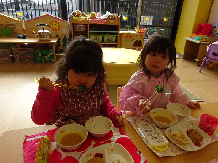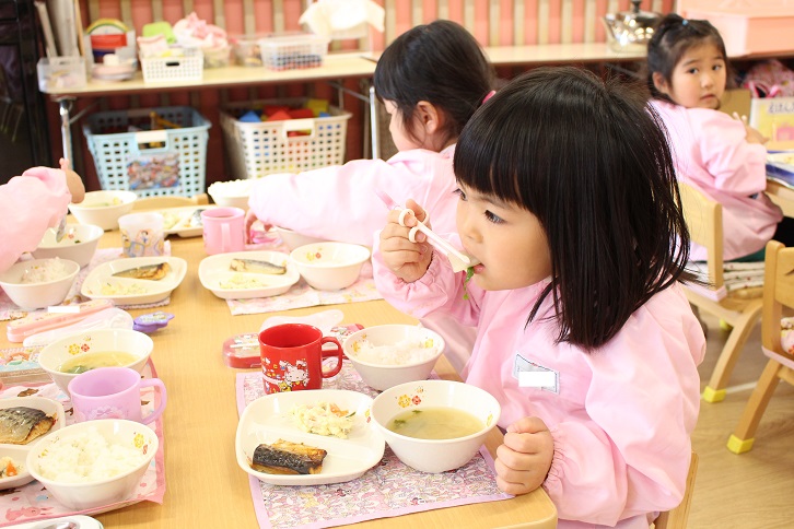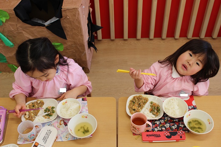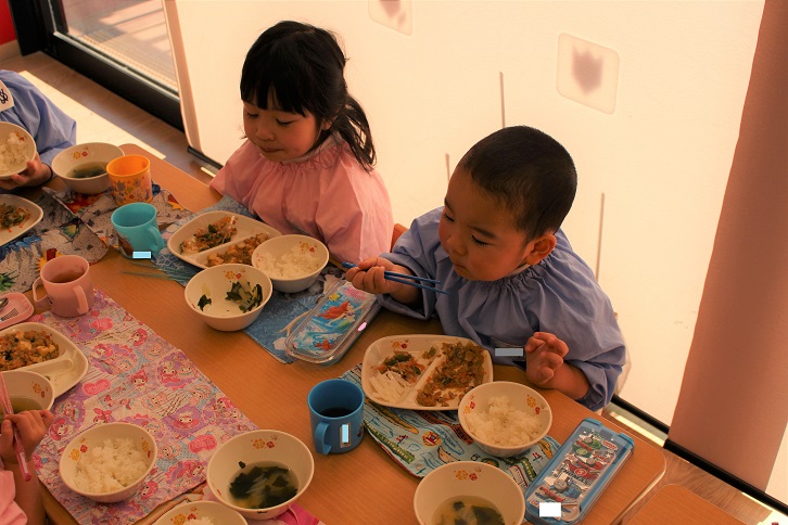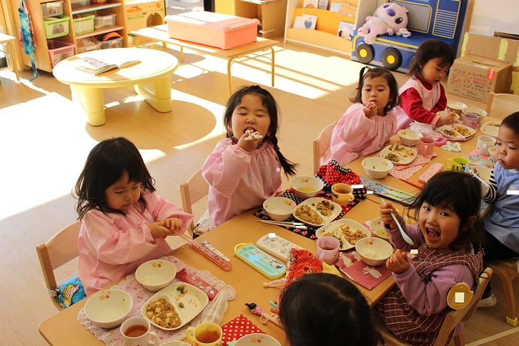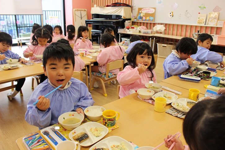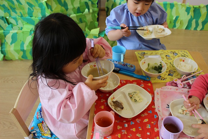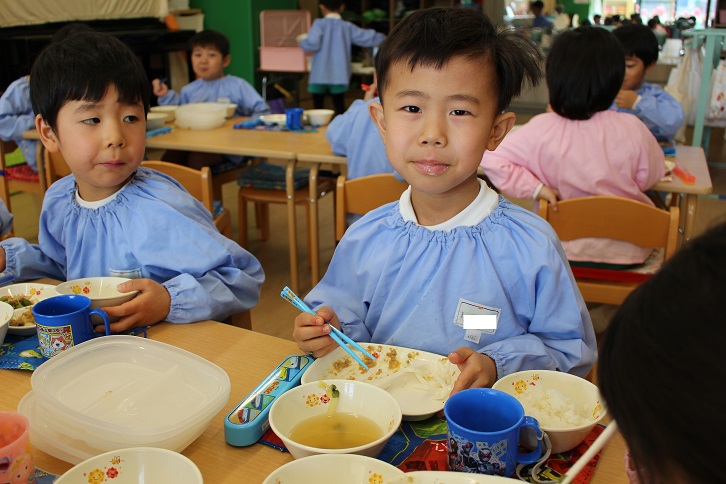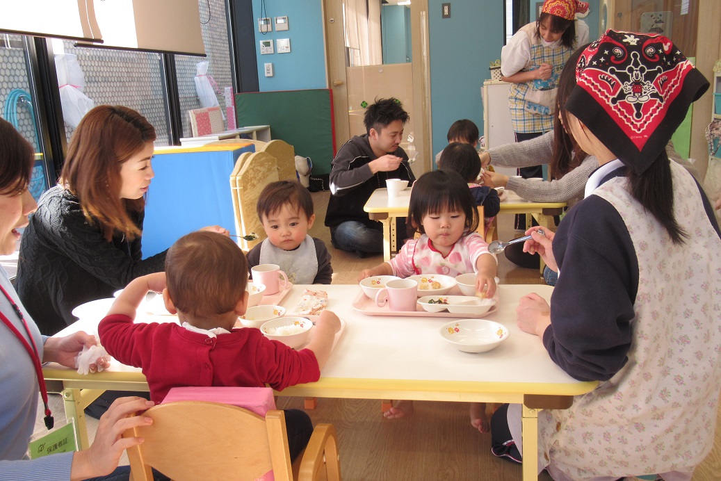 給食もお父さんやお母さんに食べさせてもらい嬉しそうな