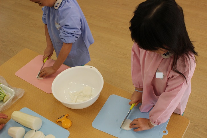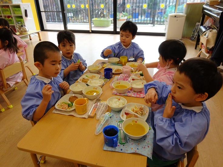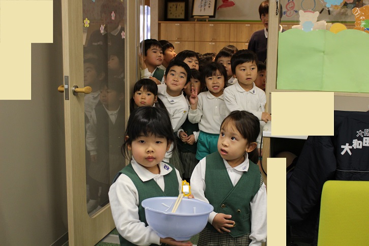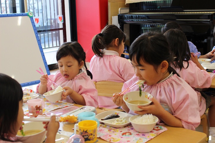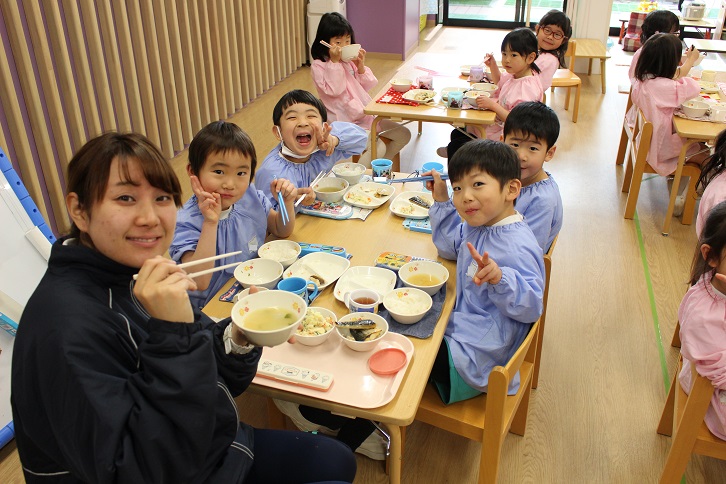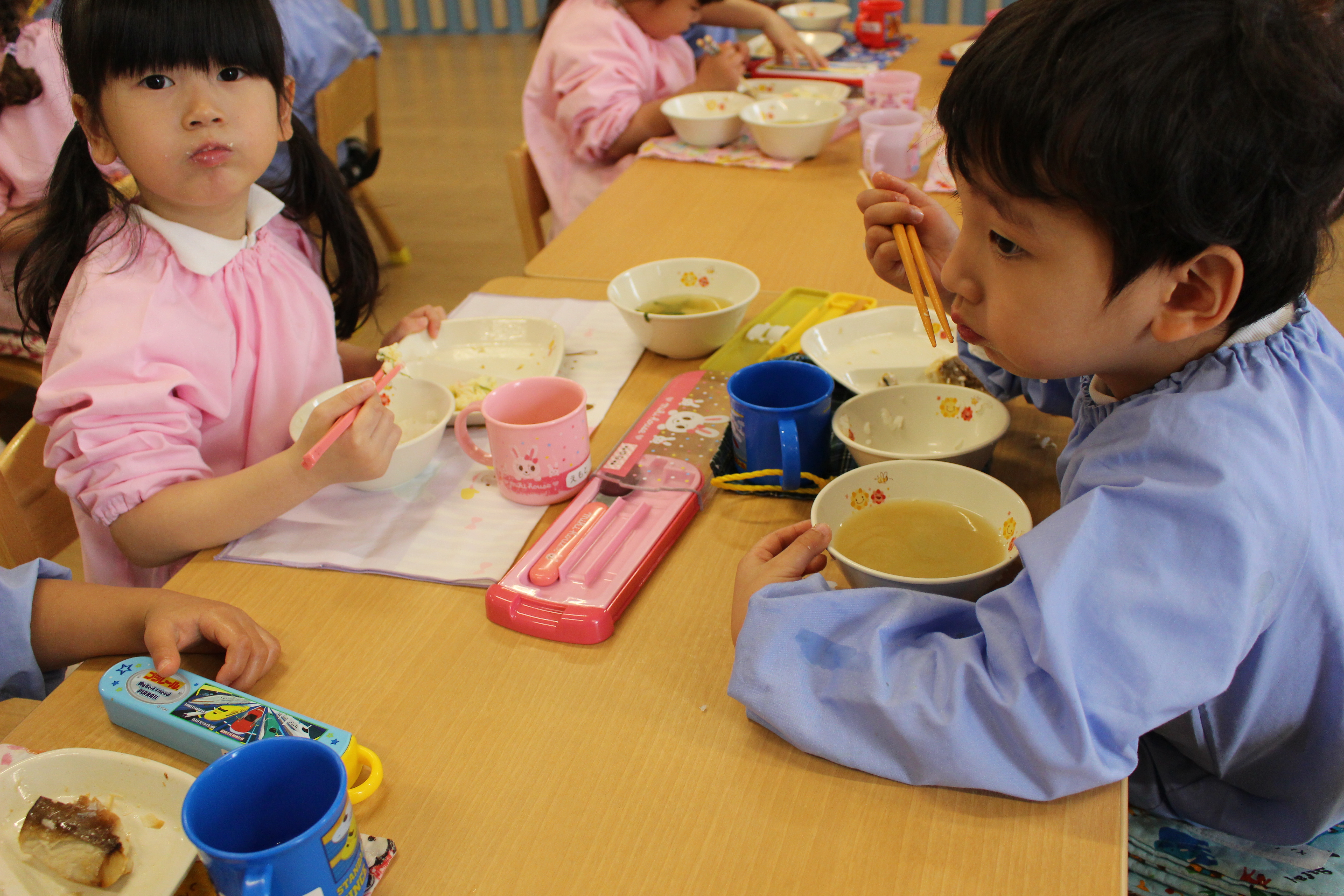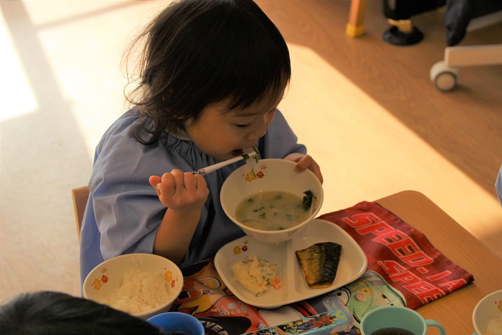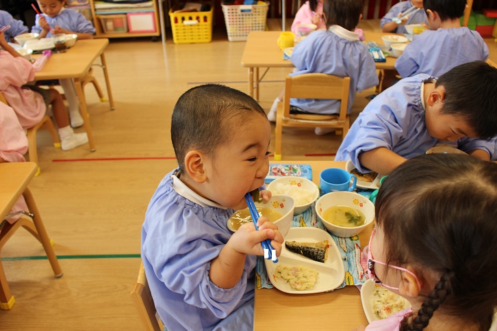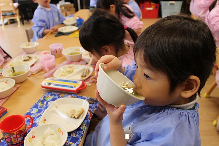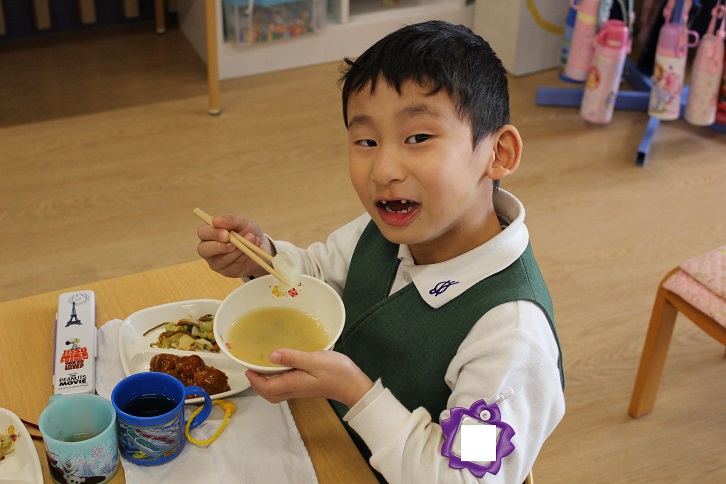 あやめ組、うめ組、ゆり組さんは、それぞれ子どもが一人ひとりみそ汁サイズに
