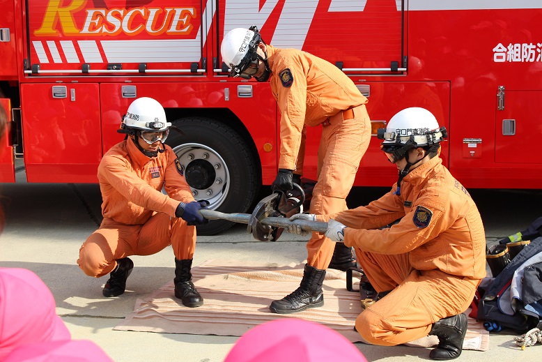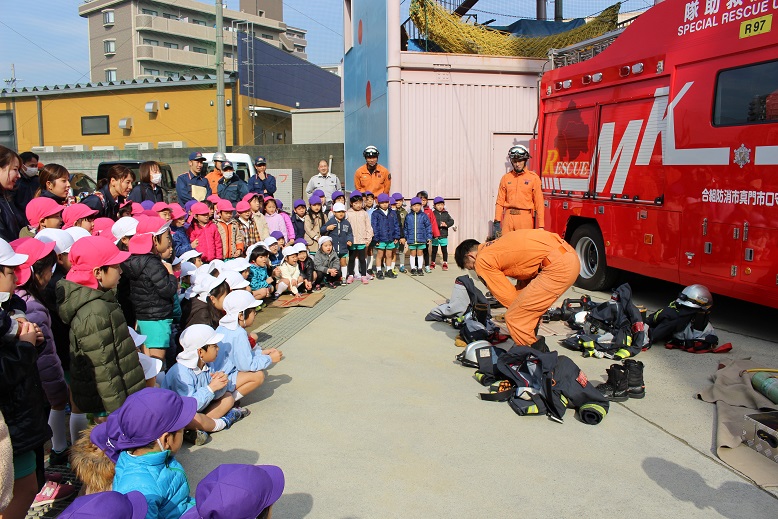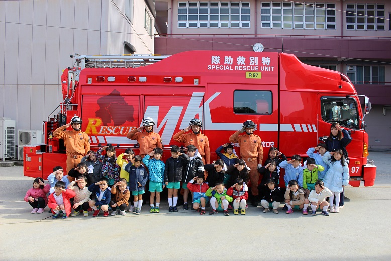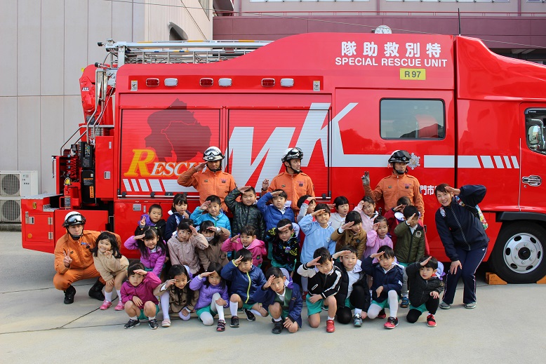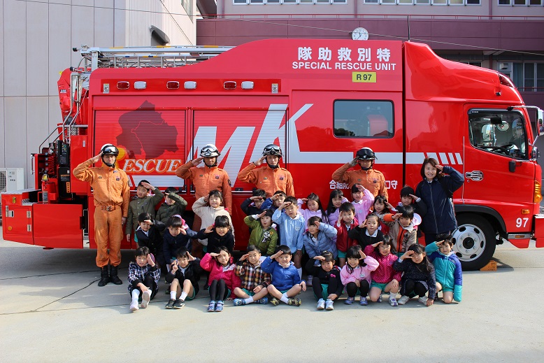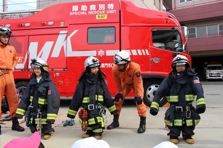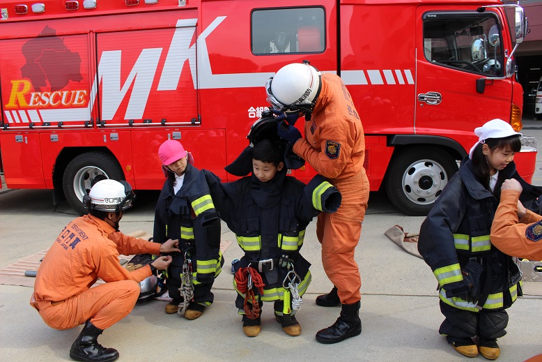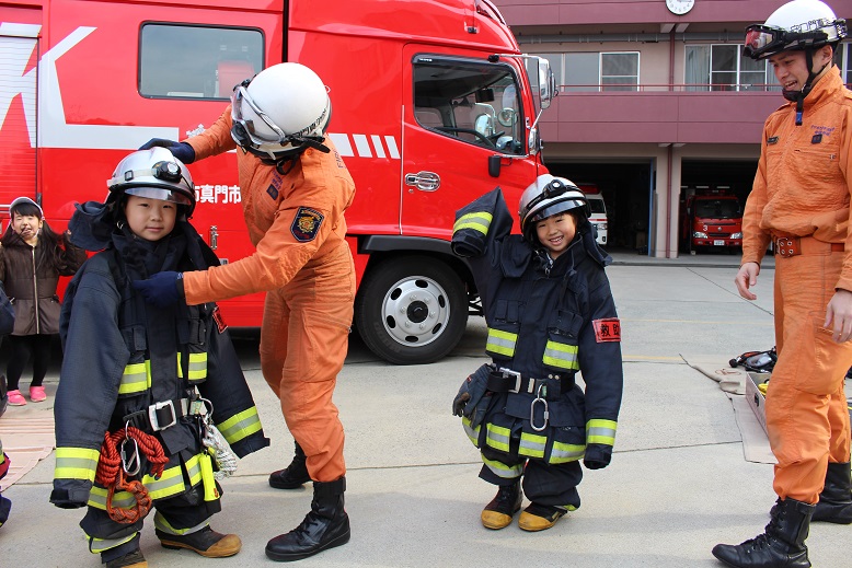今日は消防本部の見学に行き、防火服を着せていただいたり、