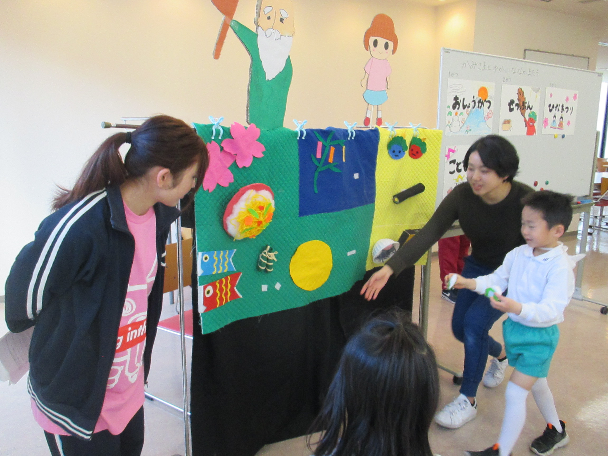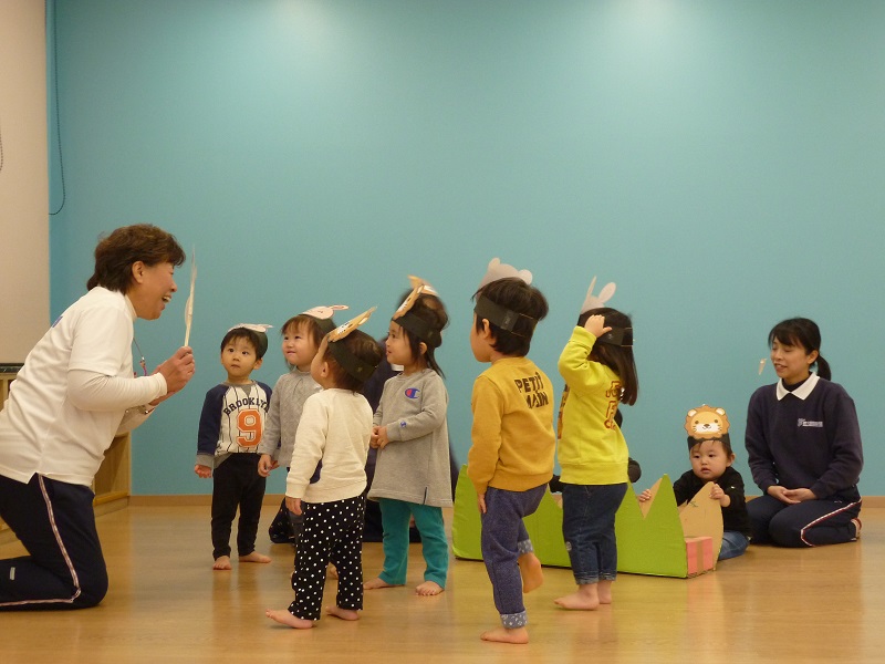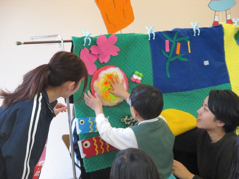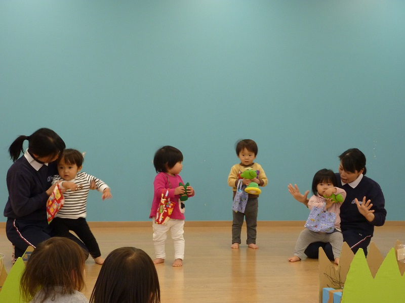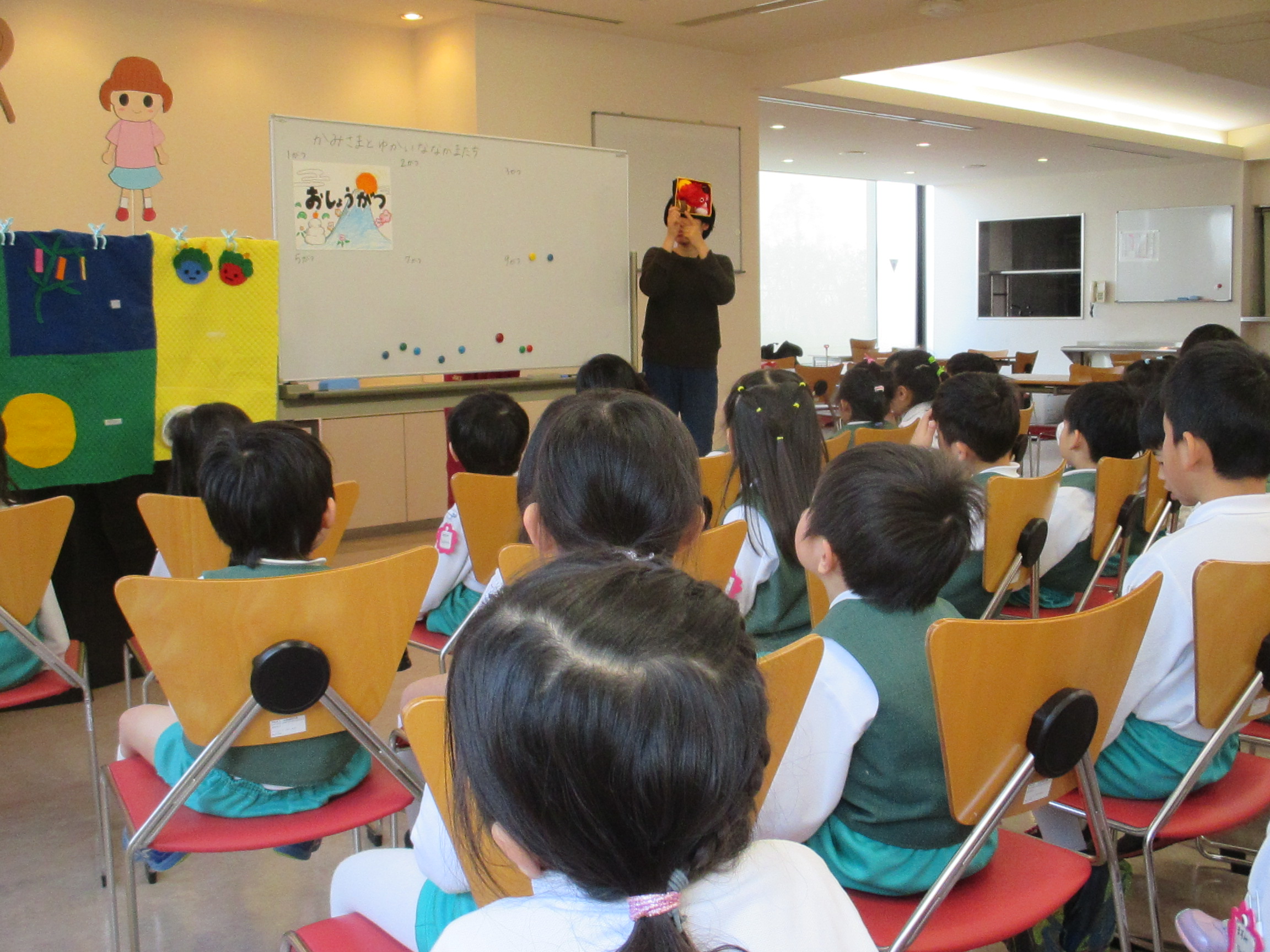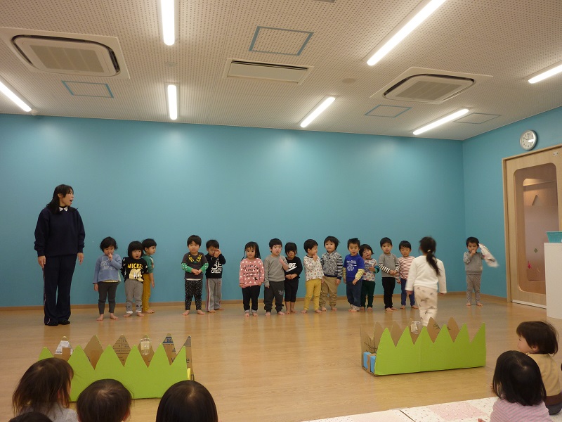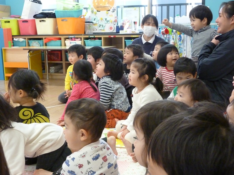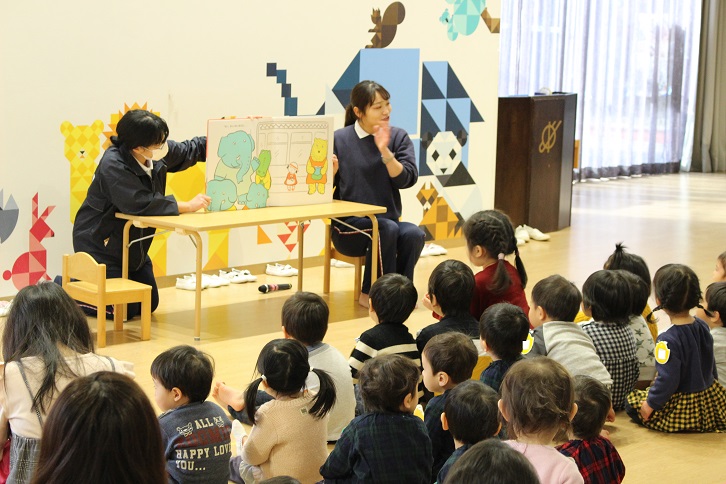 この日は、ひよこ組さんとぱんだ組さんと一緒に大型絵本の読み聞かせや