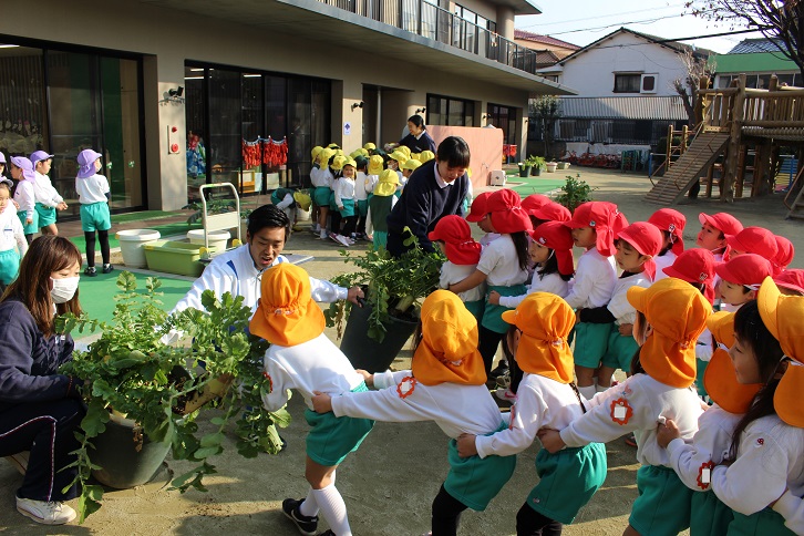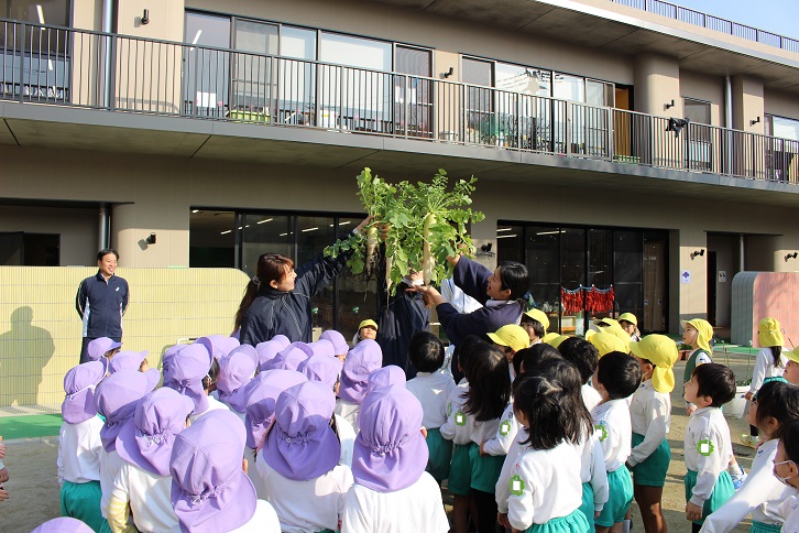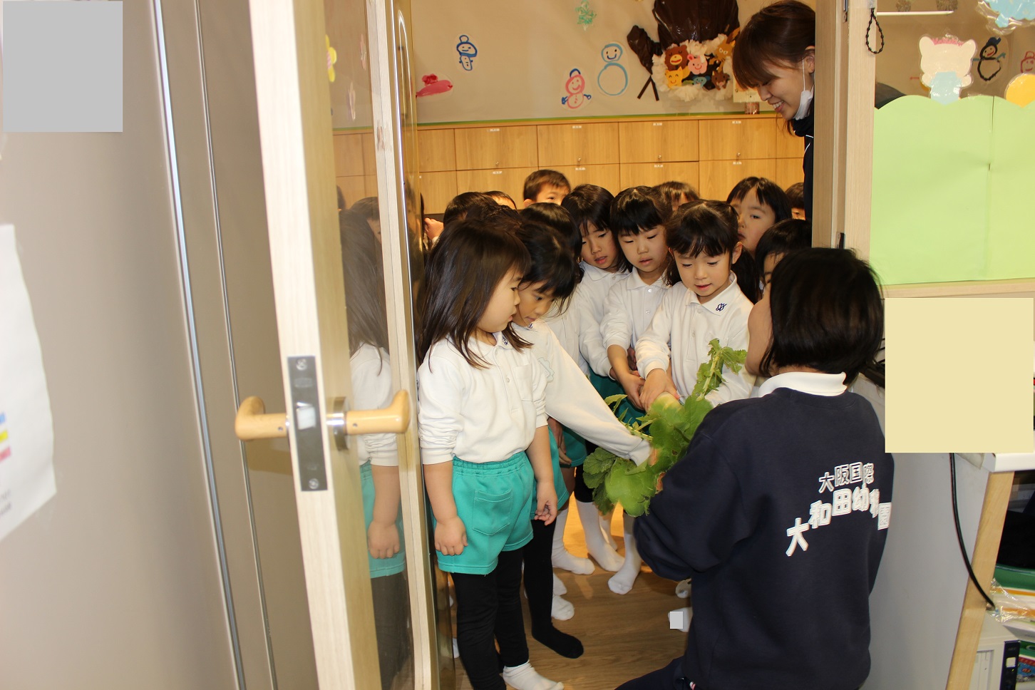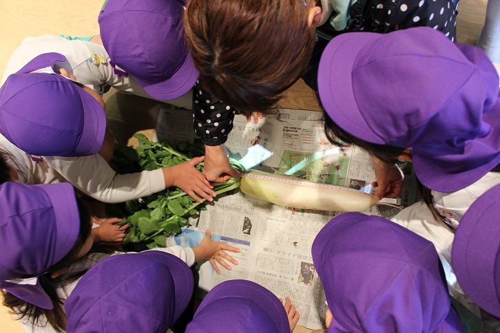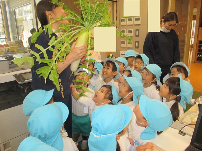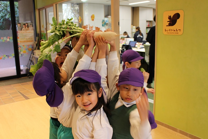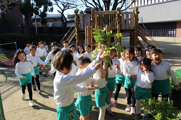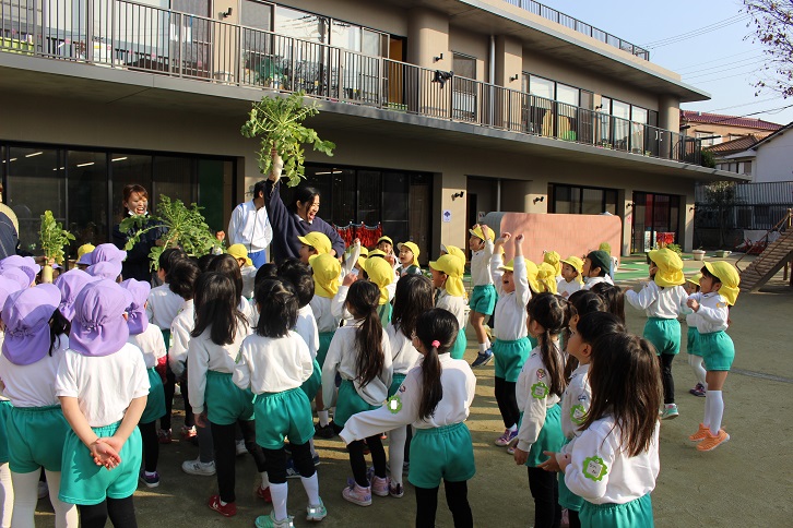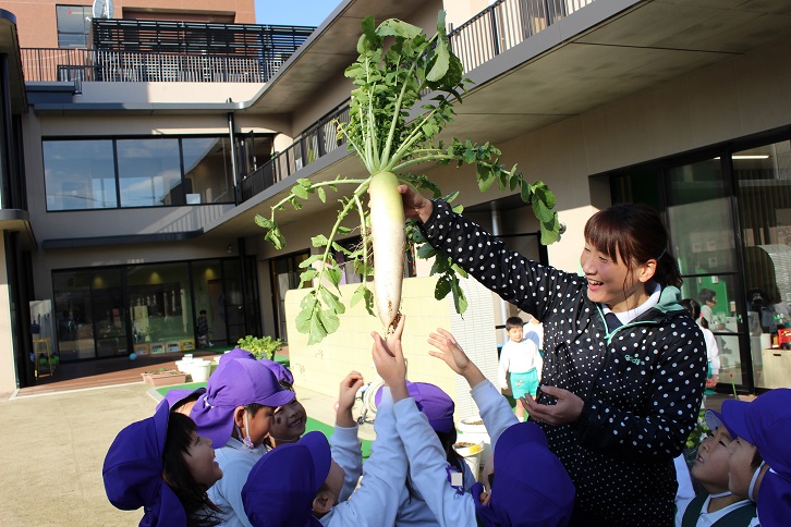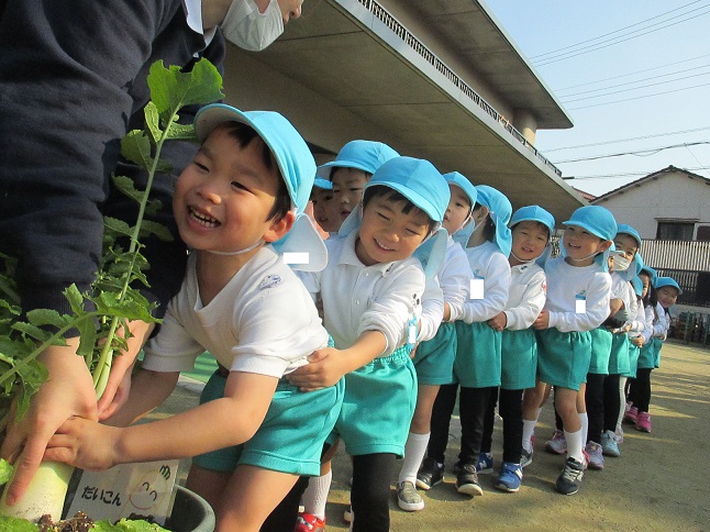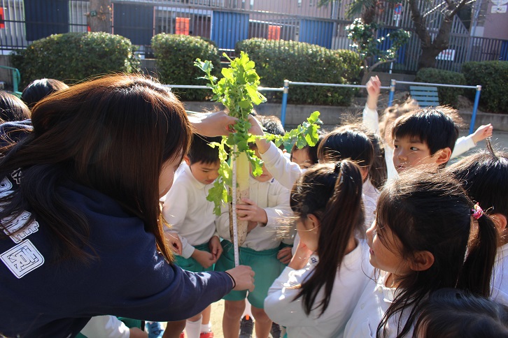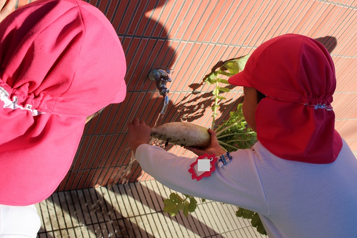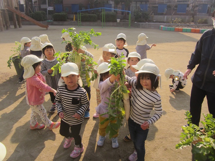 1月21日 あやめ組、うめ組、ゆり組さんは、各クラスで育てた大根を収穫しました!