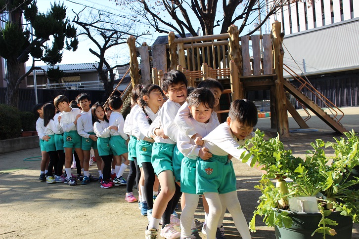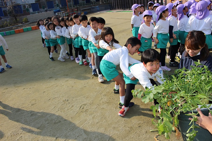先頭さんが大根を持ち、次から次へとつながりクラス全員で「うんとこどっこいしょ!」