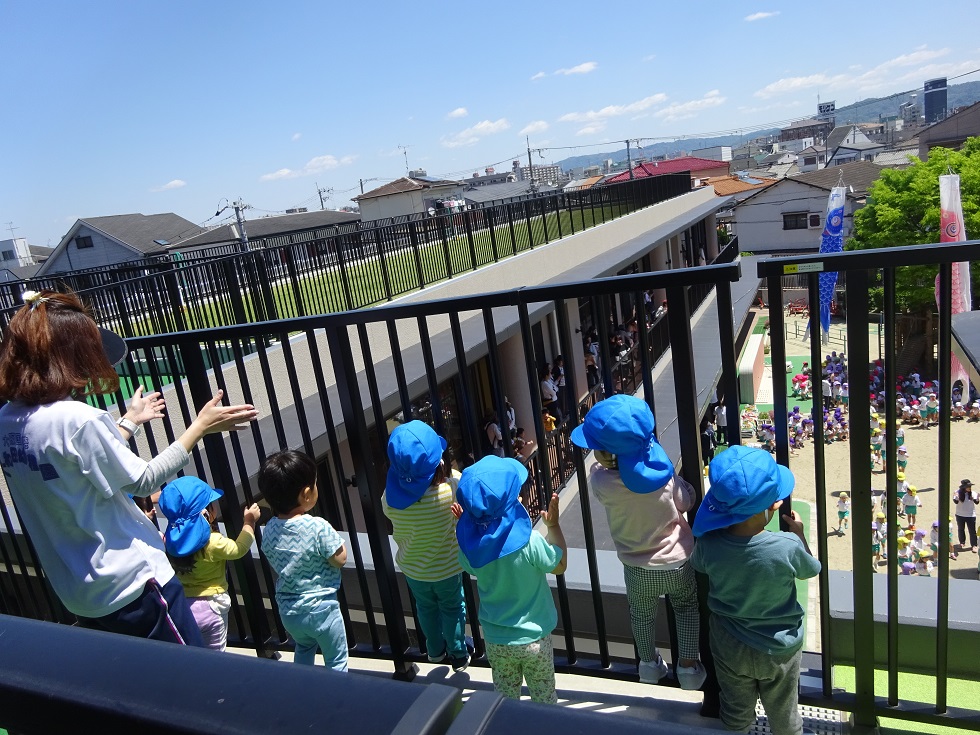 元気に泳ぐこいのぼりを見ながら、幼稚園のみんなと一緒に、