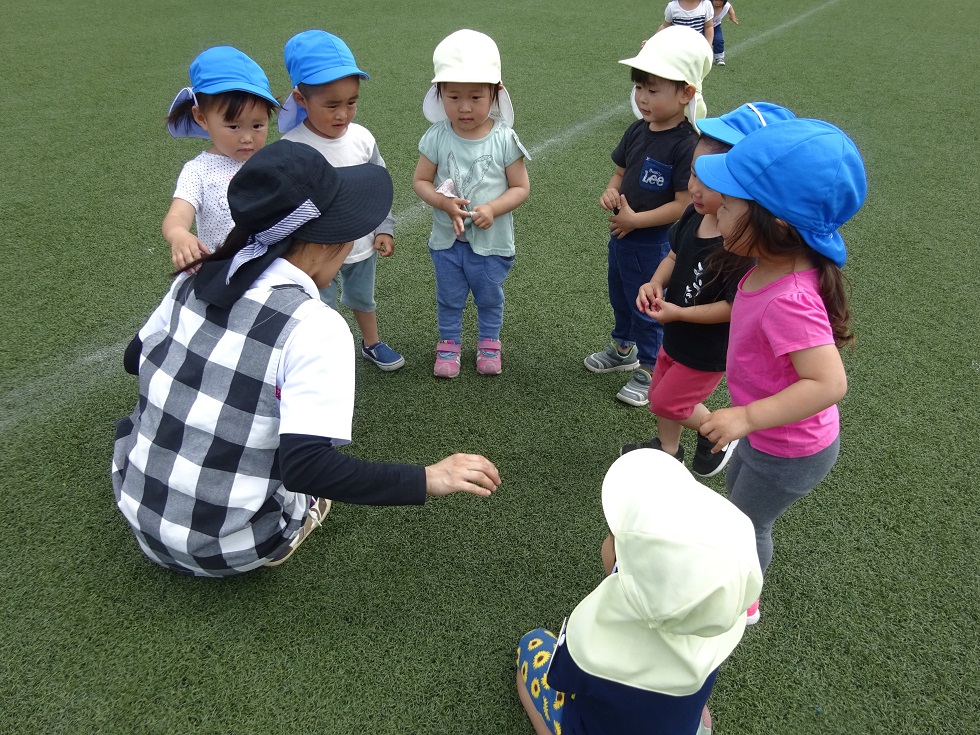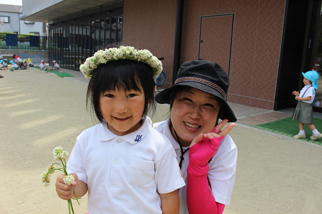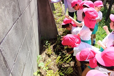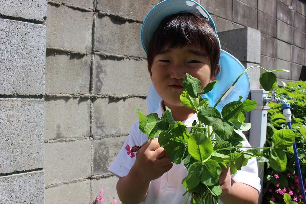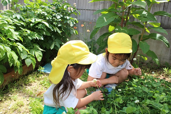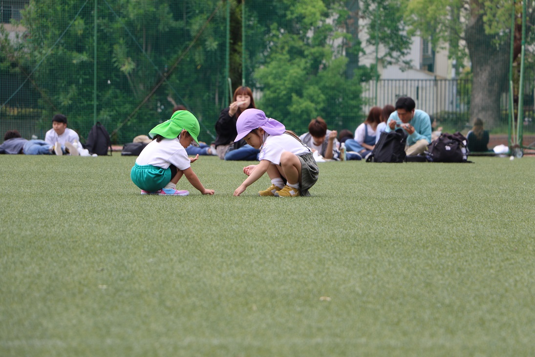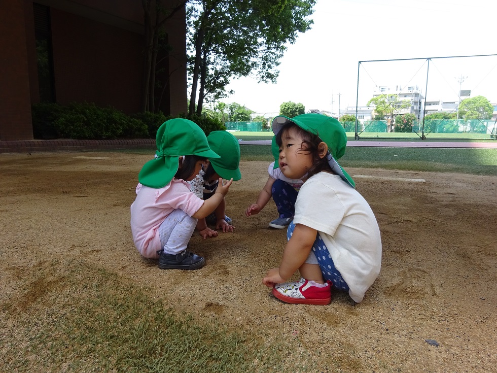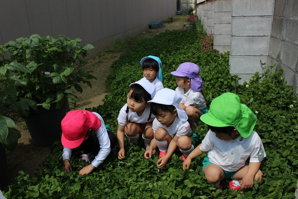 四つ葉のクローバー探しをしましたよ!四つ葉のクローバーには出会えませんでしたが、しろつめ草やダンゴムシなど、たくさん遊んだ子どもたちでした♪