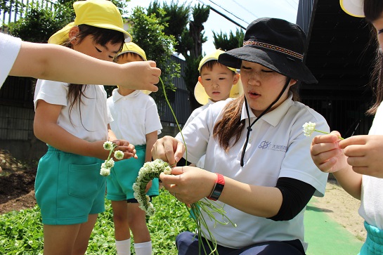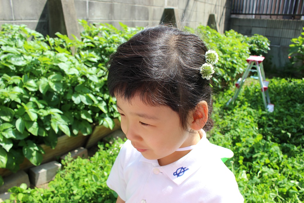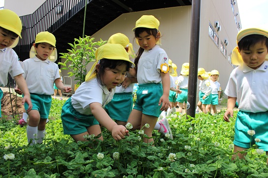 園舎の裏はたくさんのシロツメ草が咲いています!