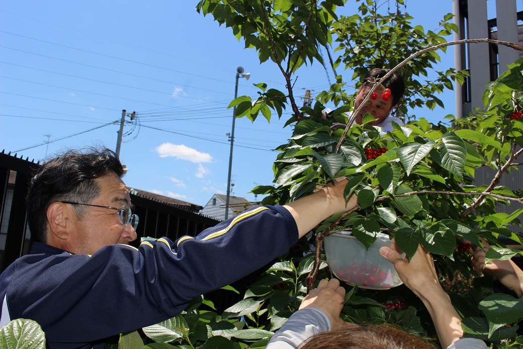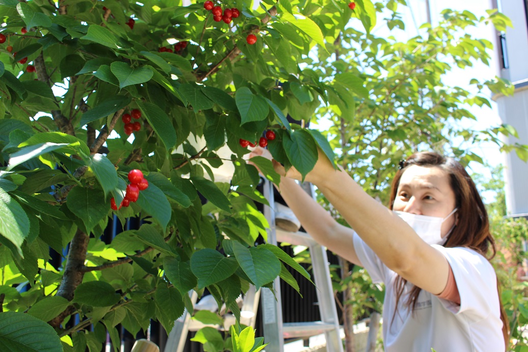 今日はさくらんぼを収穫しました!(高い位置にあるので、先生が収穫です!)