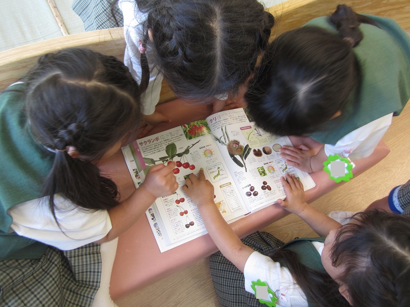 すずらん組の子どもたちは、さくらんぼを食べたあと、図鑑をひらいて調べていました!
