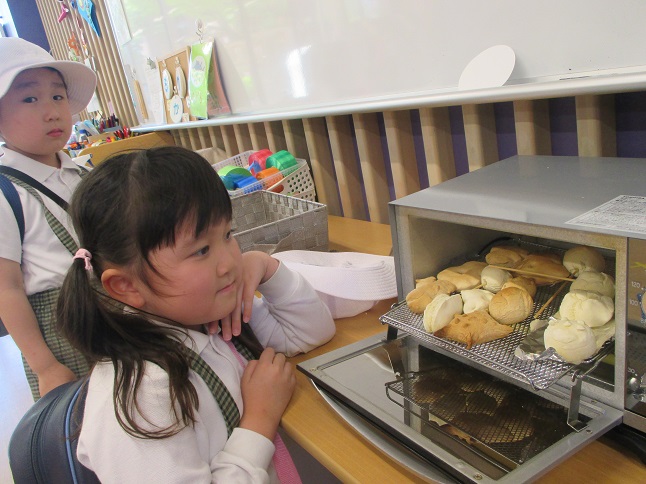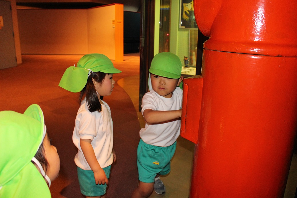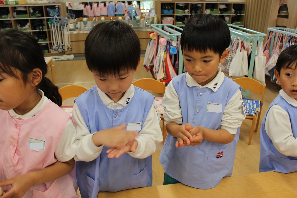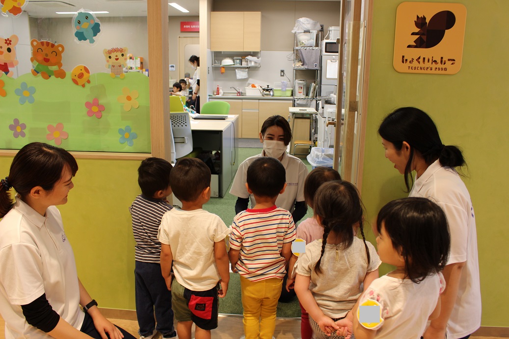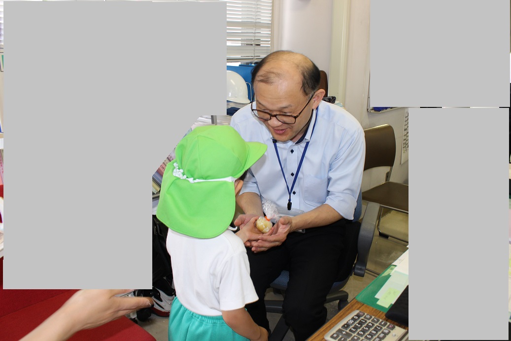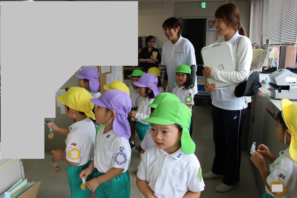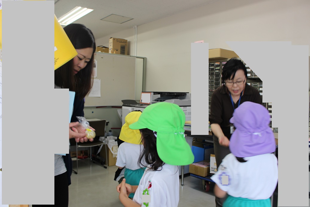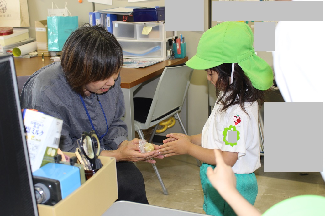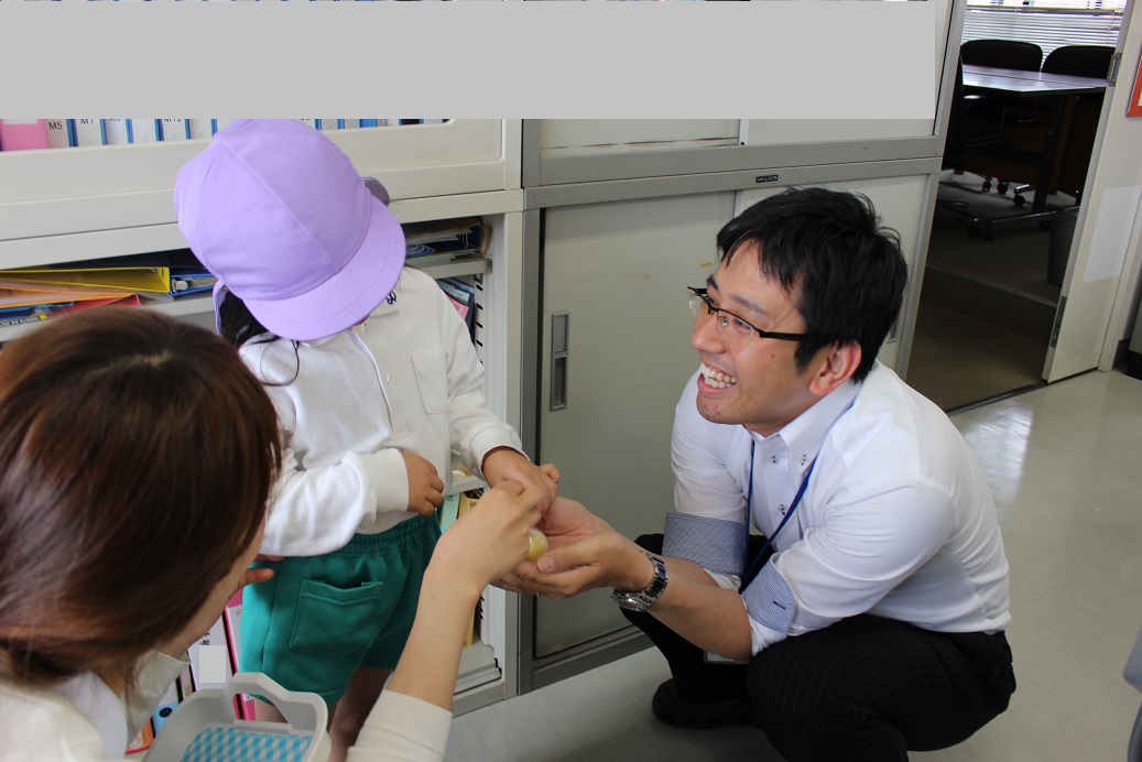 ↑登園後、今日もみんな元気に来ています!と、お休み調べの用紙を職員室に持ってきてくれます。職員室の先生とご挨拶をします。