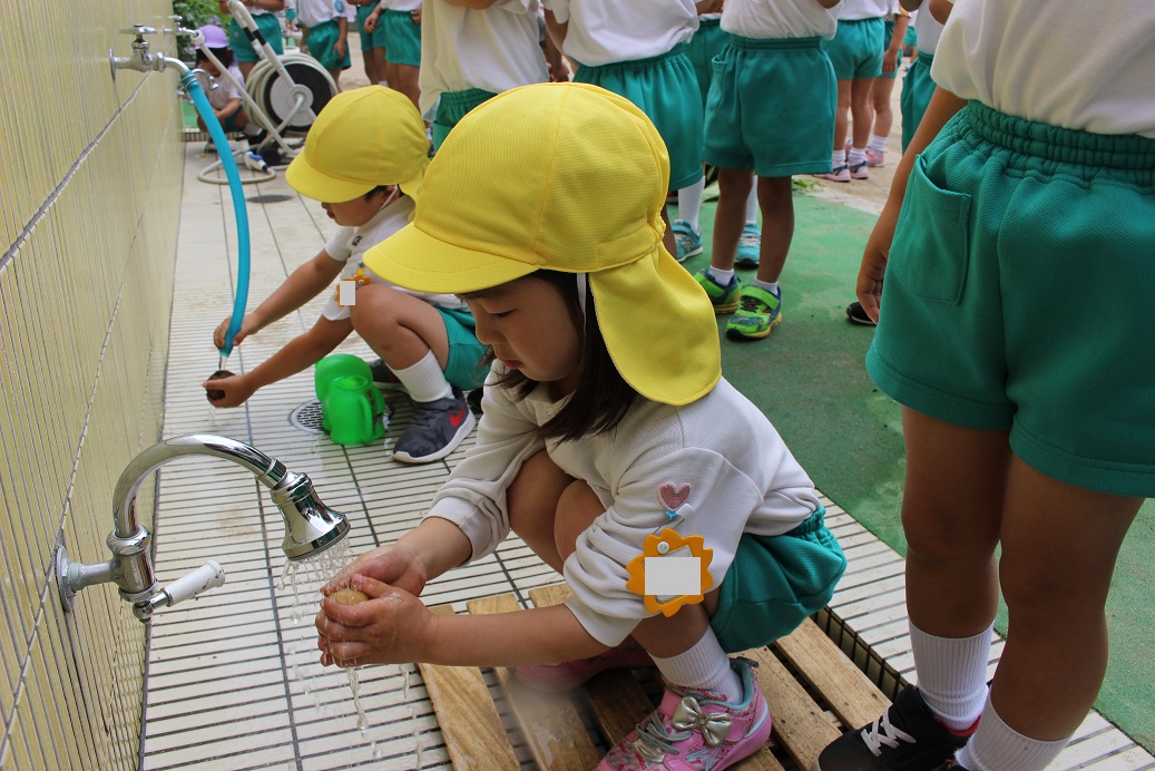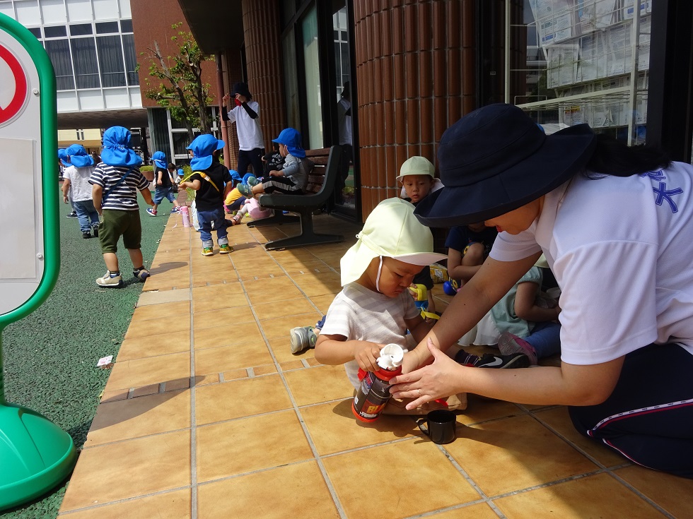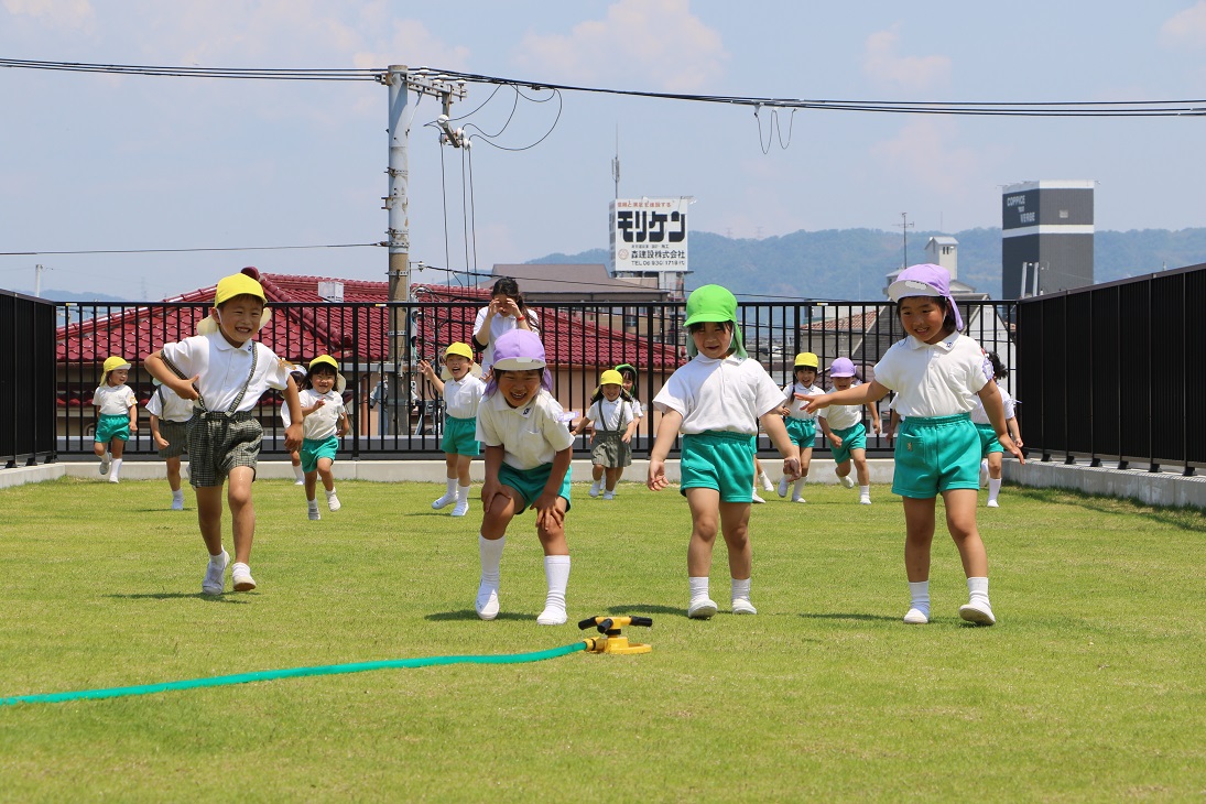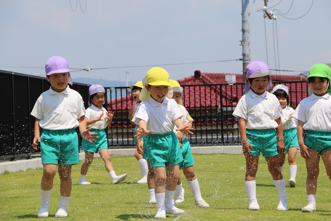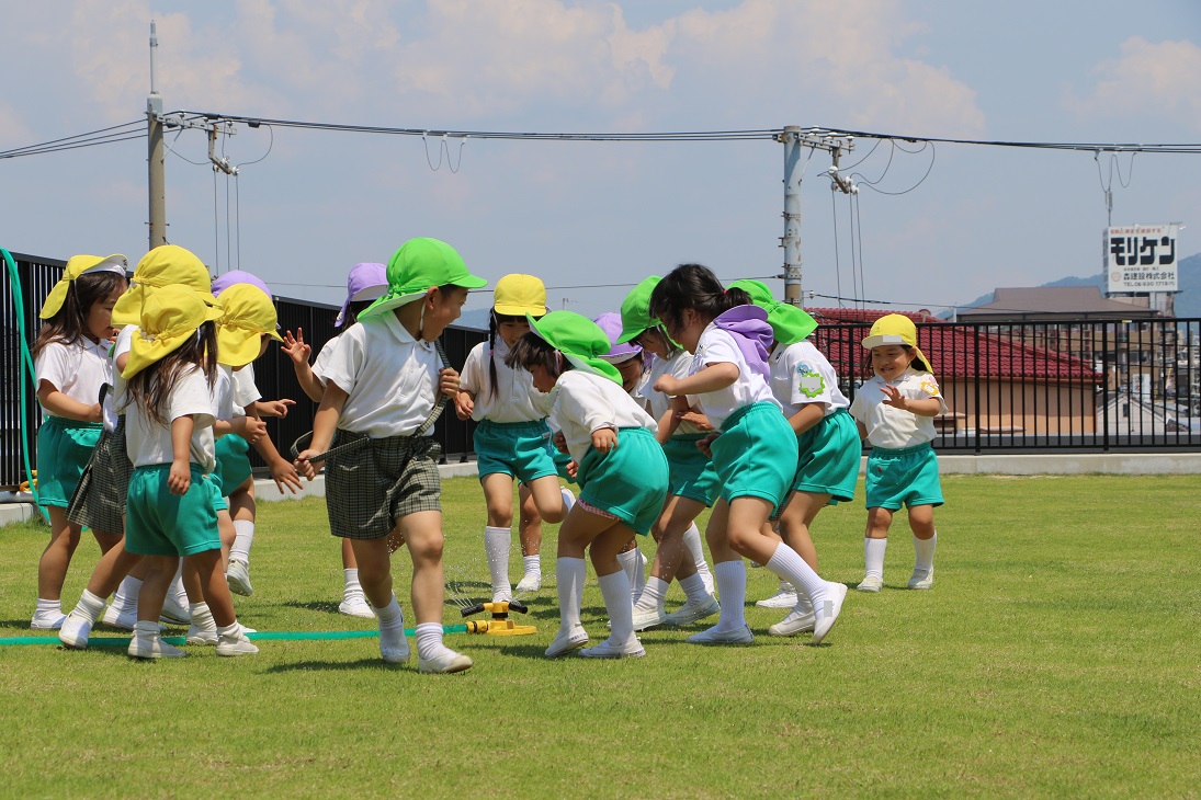 園庭で、先生が水を撒いてくれました!