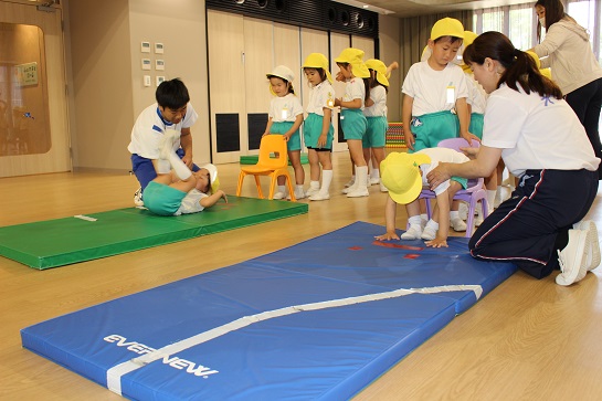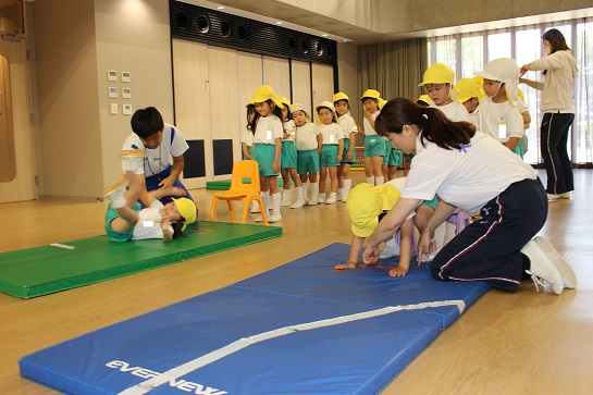 友達の前回りの様子を観察したり、先生の言うことを聞いて前転できるようになってきました。