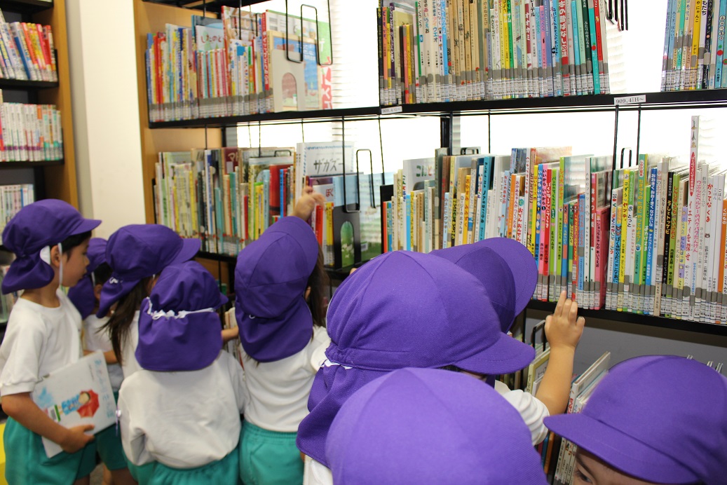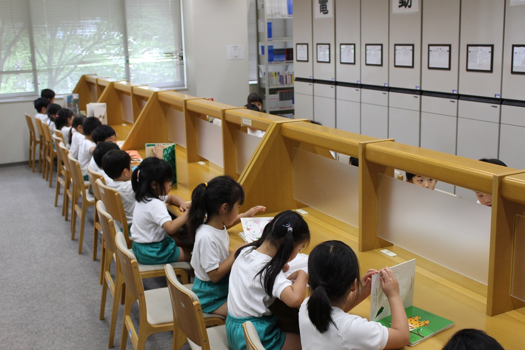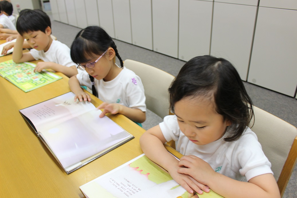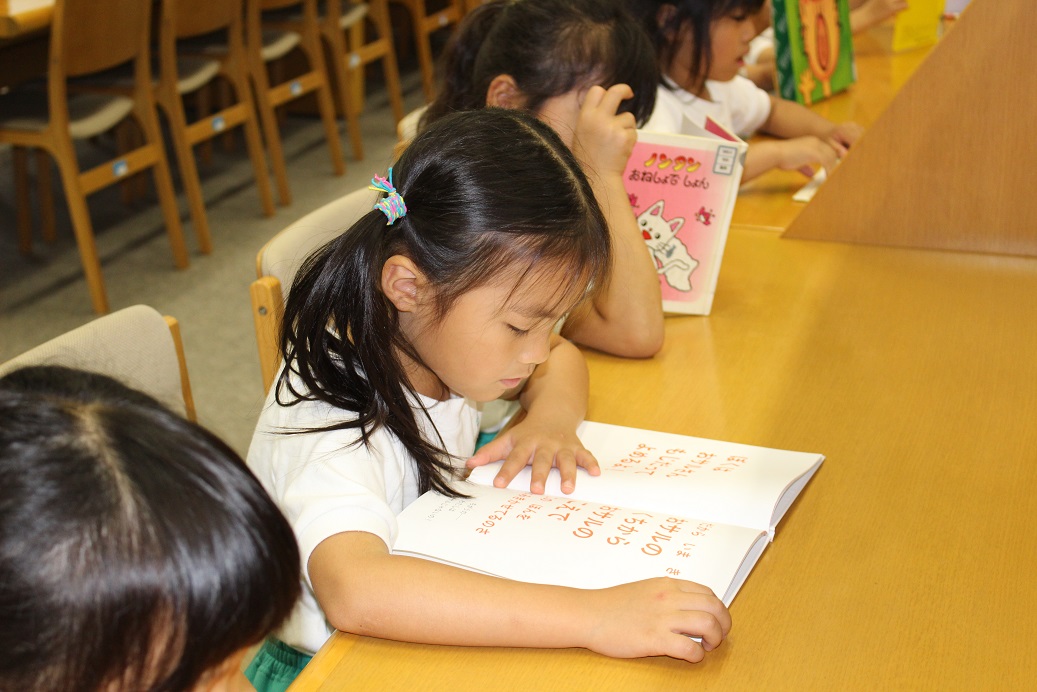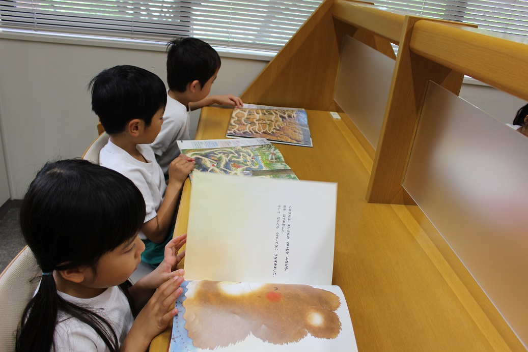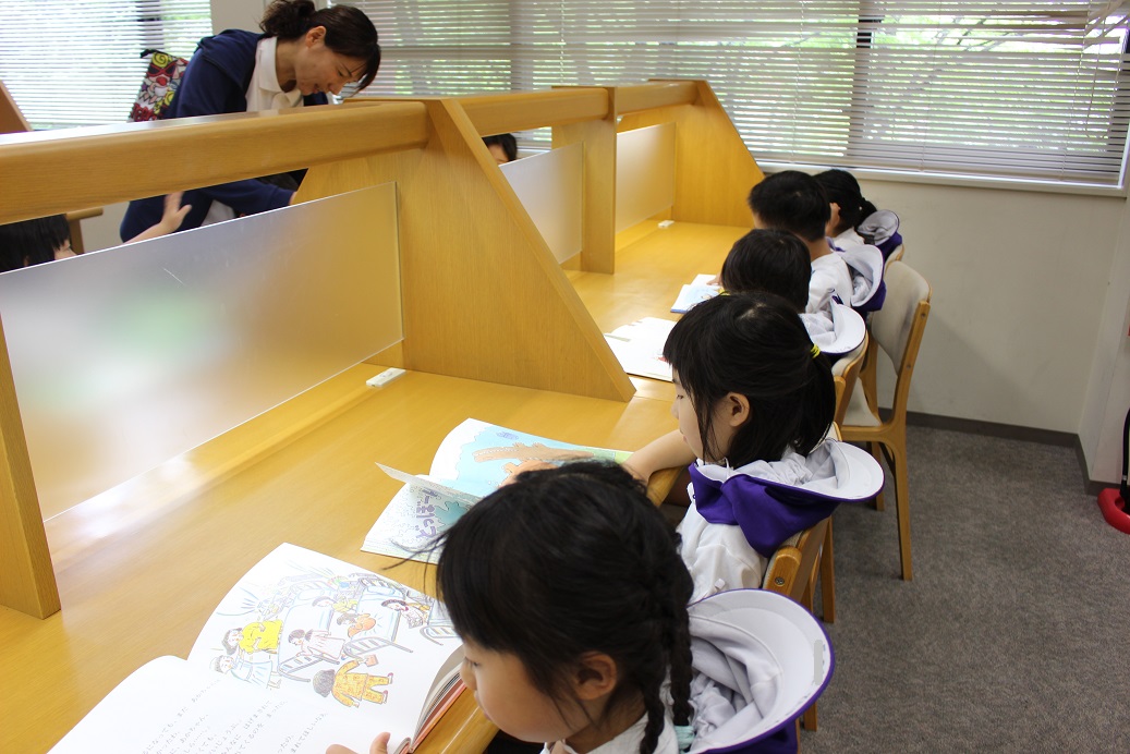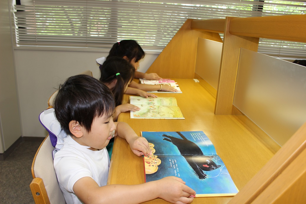 大学の図書館でマナーを守りながら、絵本を読んでいます。