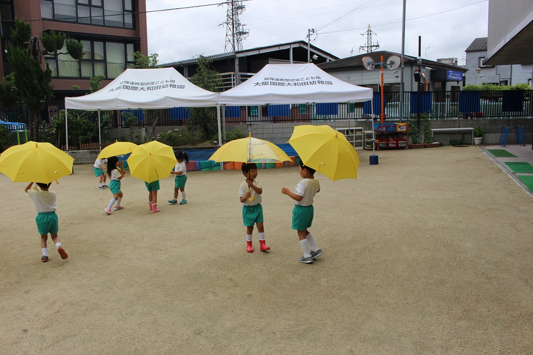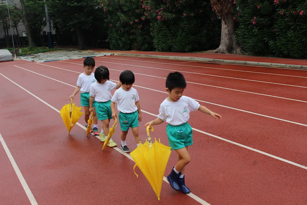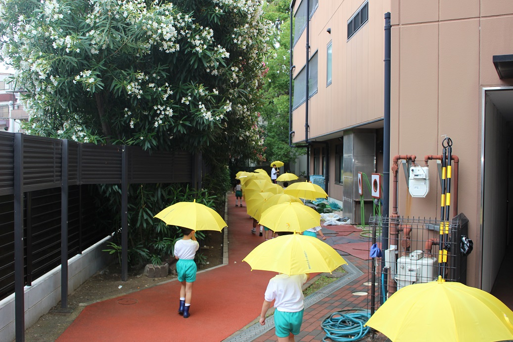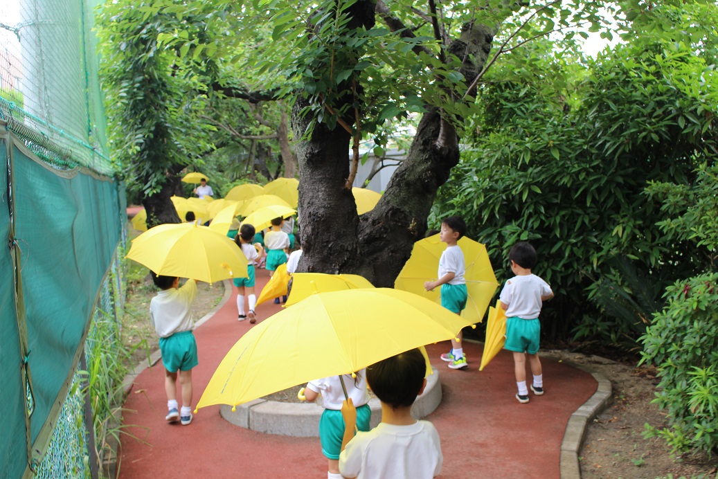 傘の指導も兼ねて、小雨のときに大学内を散歩しました。