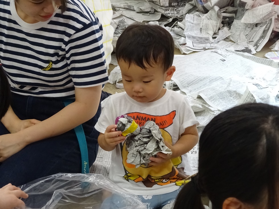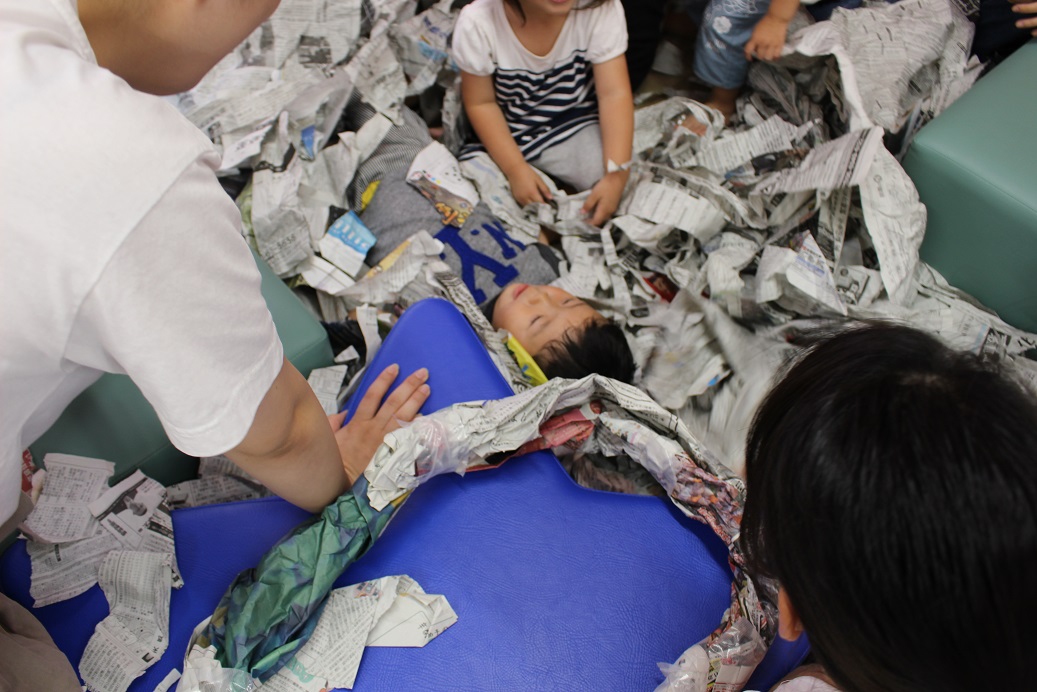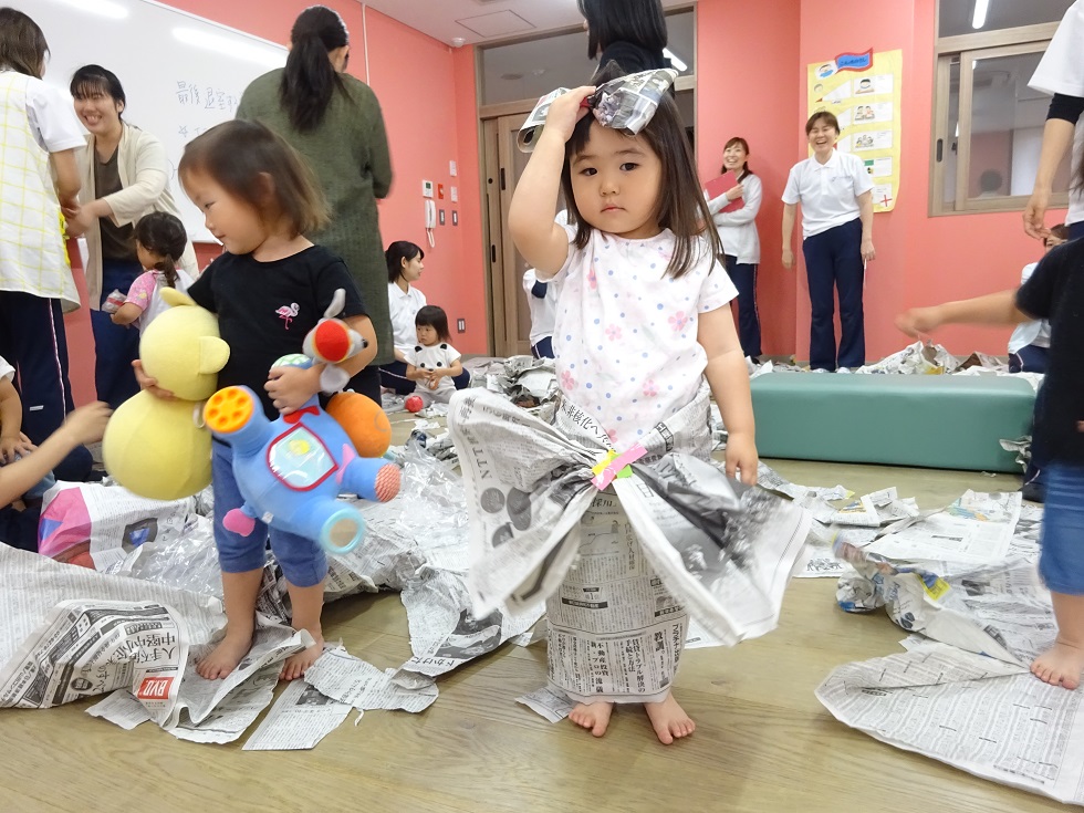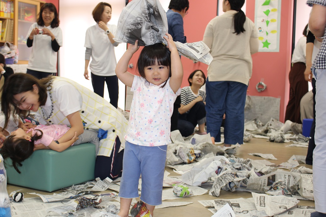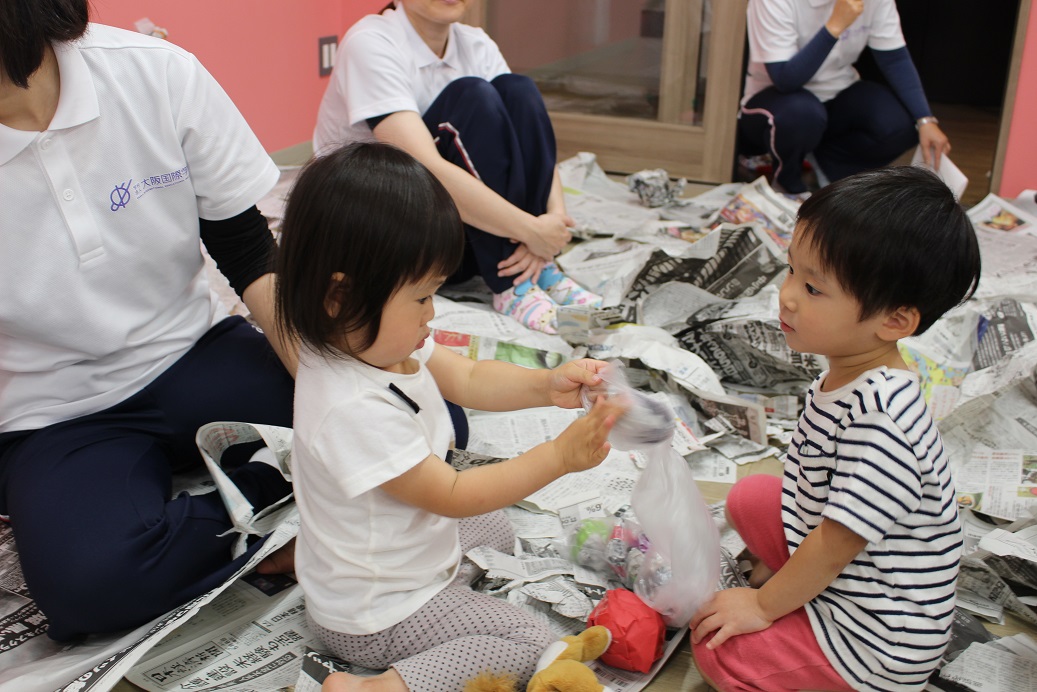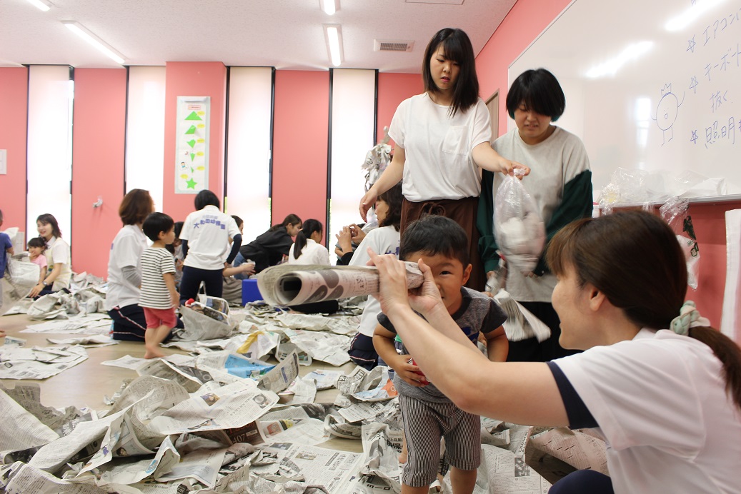 短期大学の学生さんと、ぱんだ組の子どもたちと一緒に新聞遊びをしましたよ!