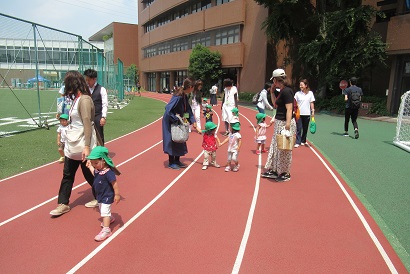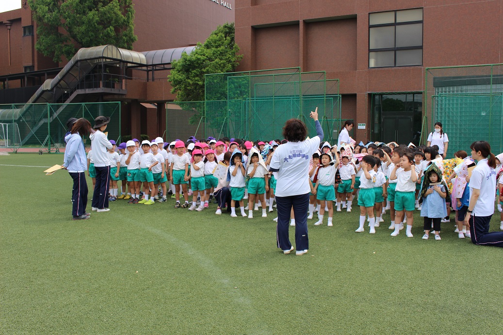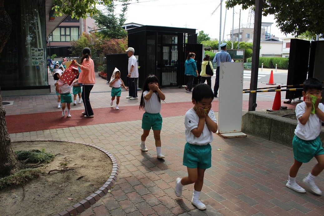 泣いてしまう年少組さんもいましたが、みんな無事に大学グラウンドに避難をしました。