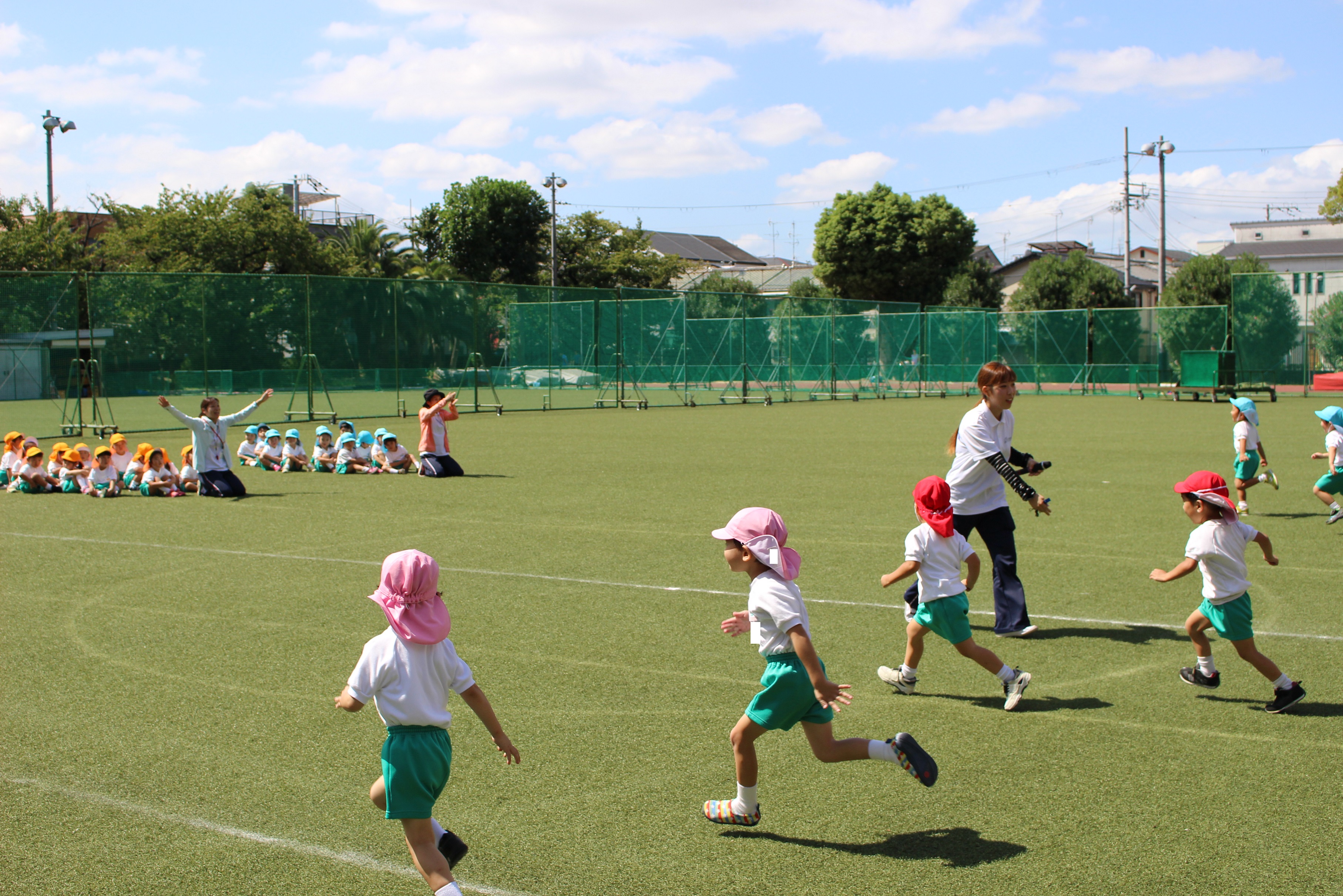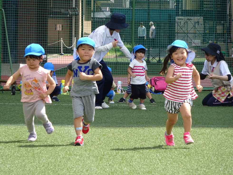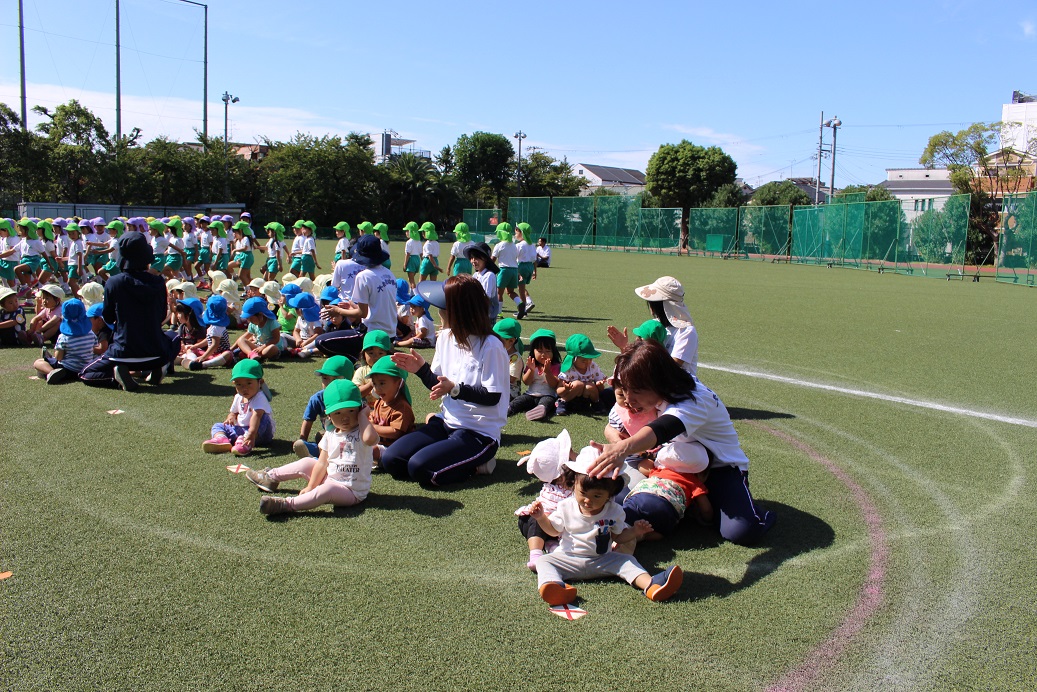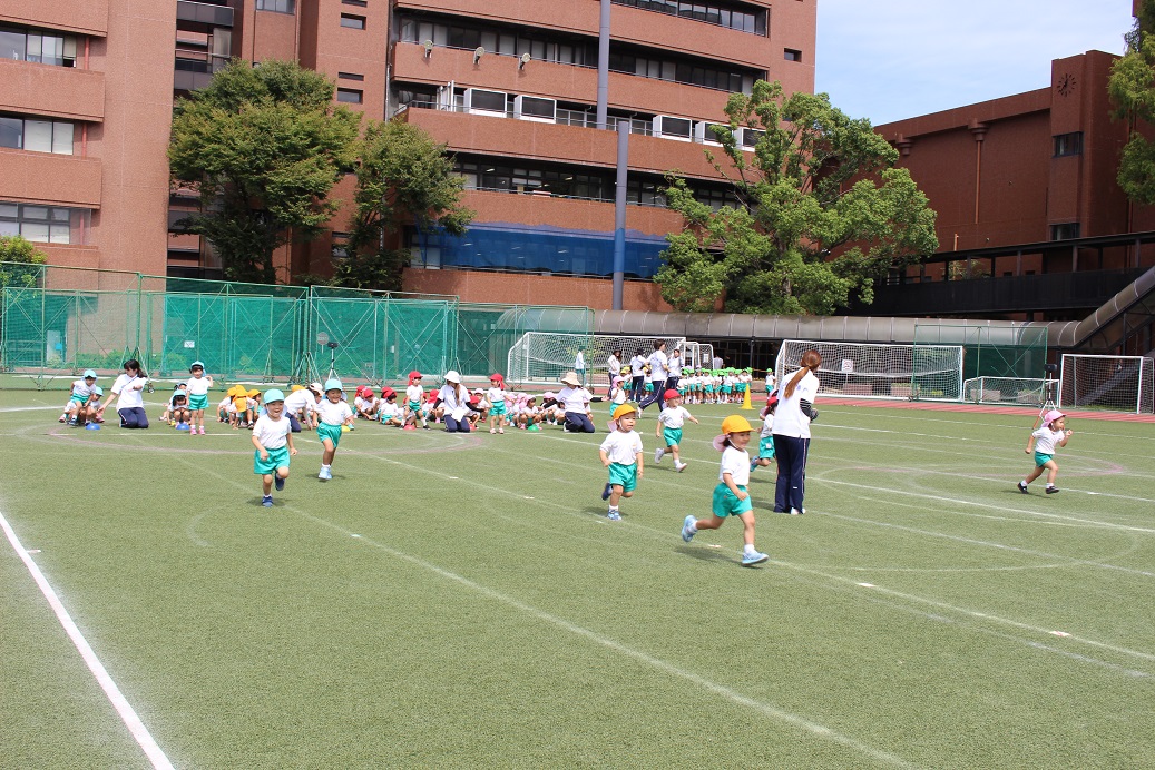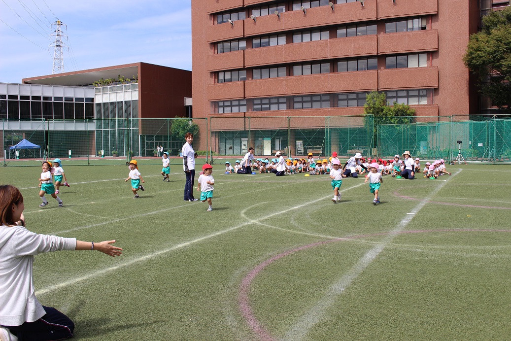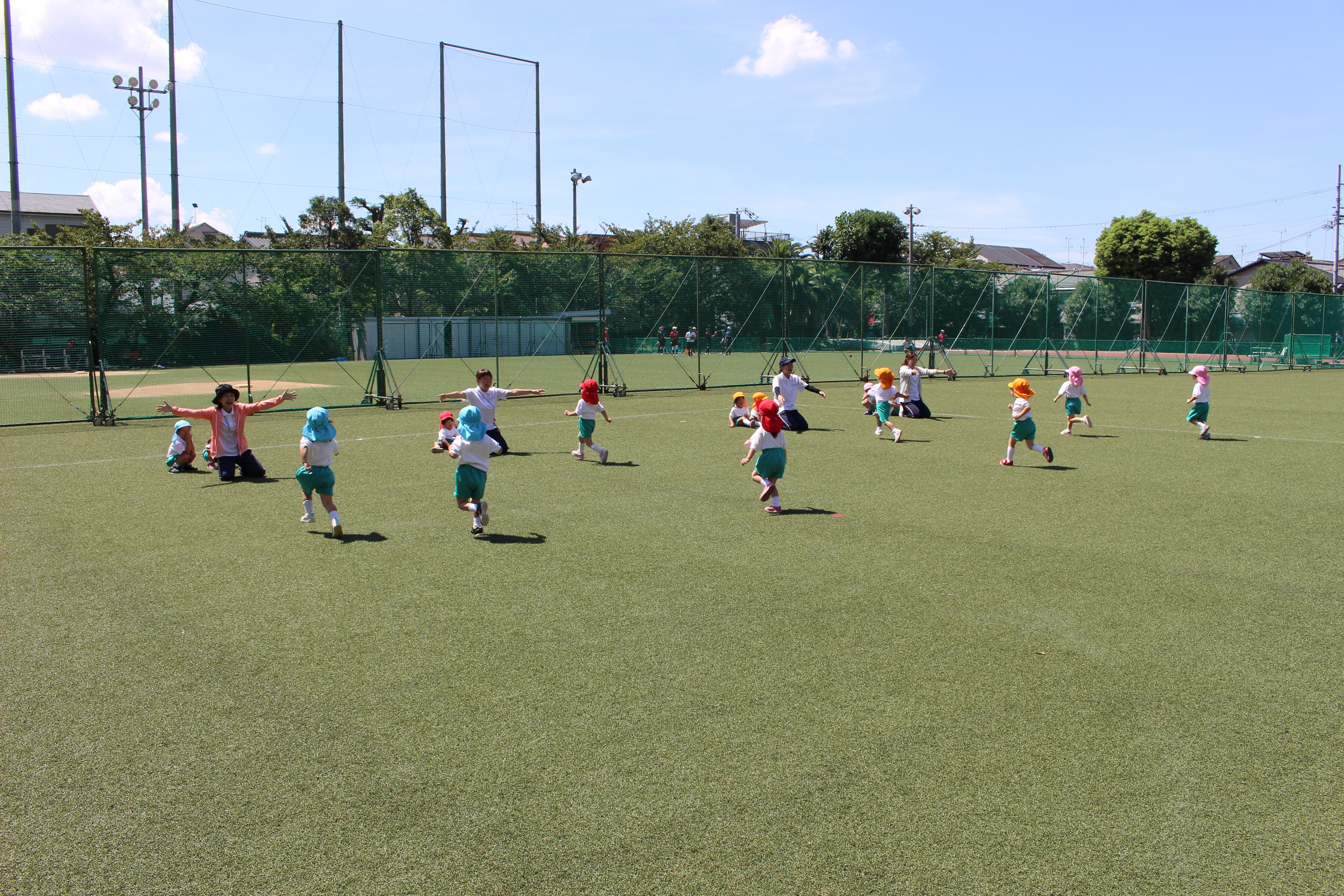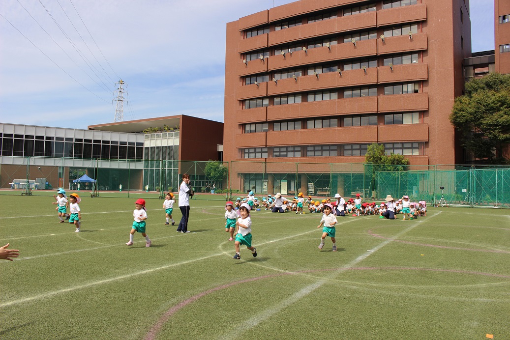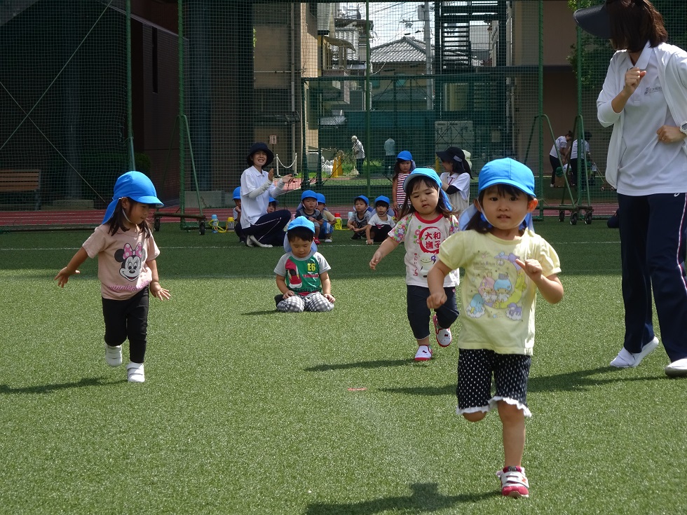 ひよこ組と一緒に広いグラウンドで「よーいドン!」を