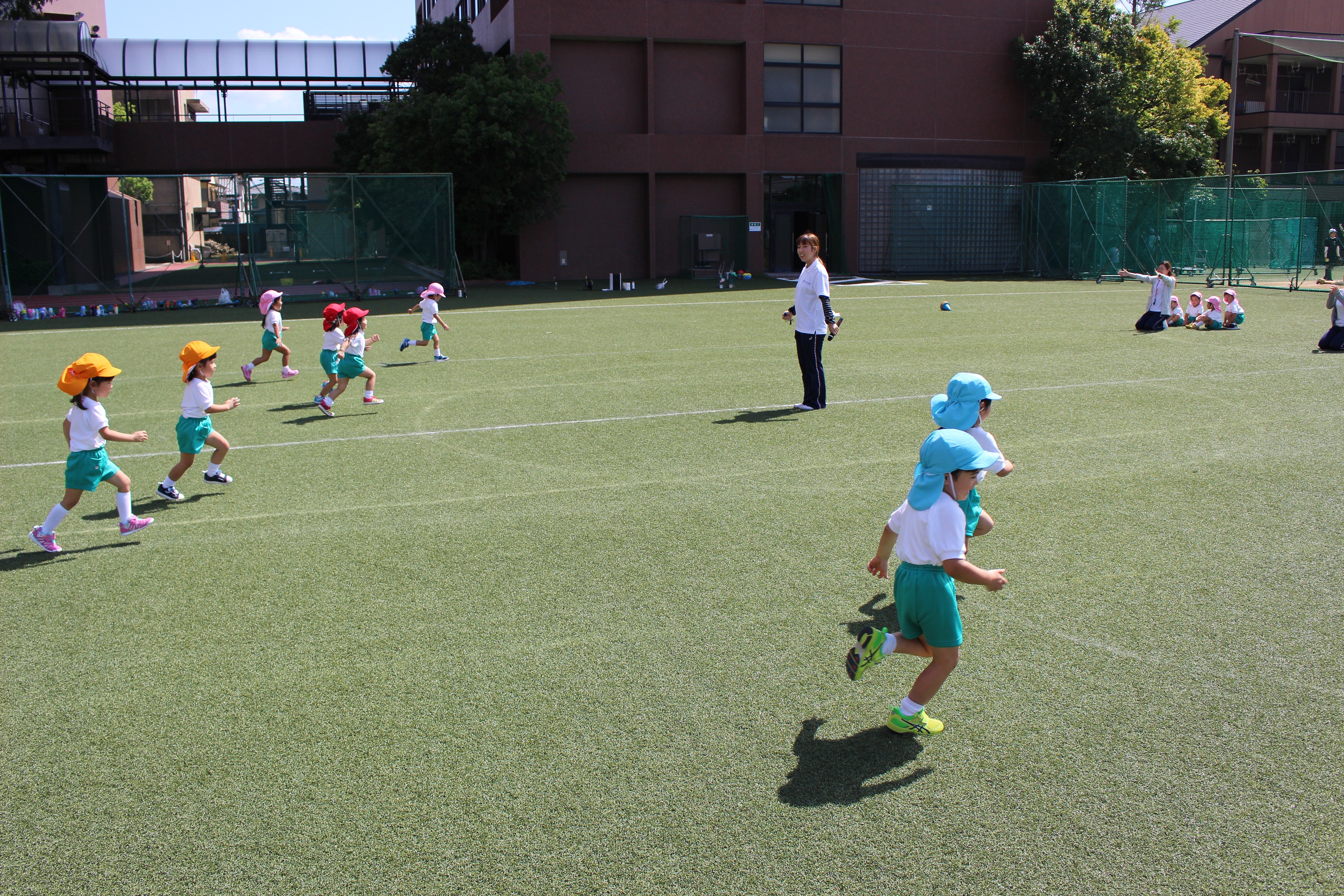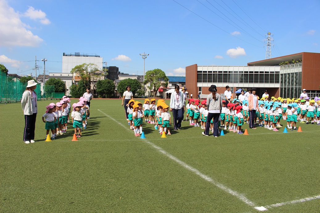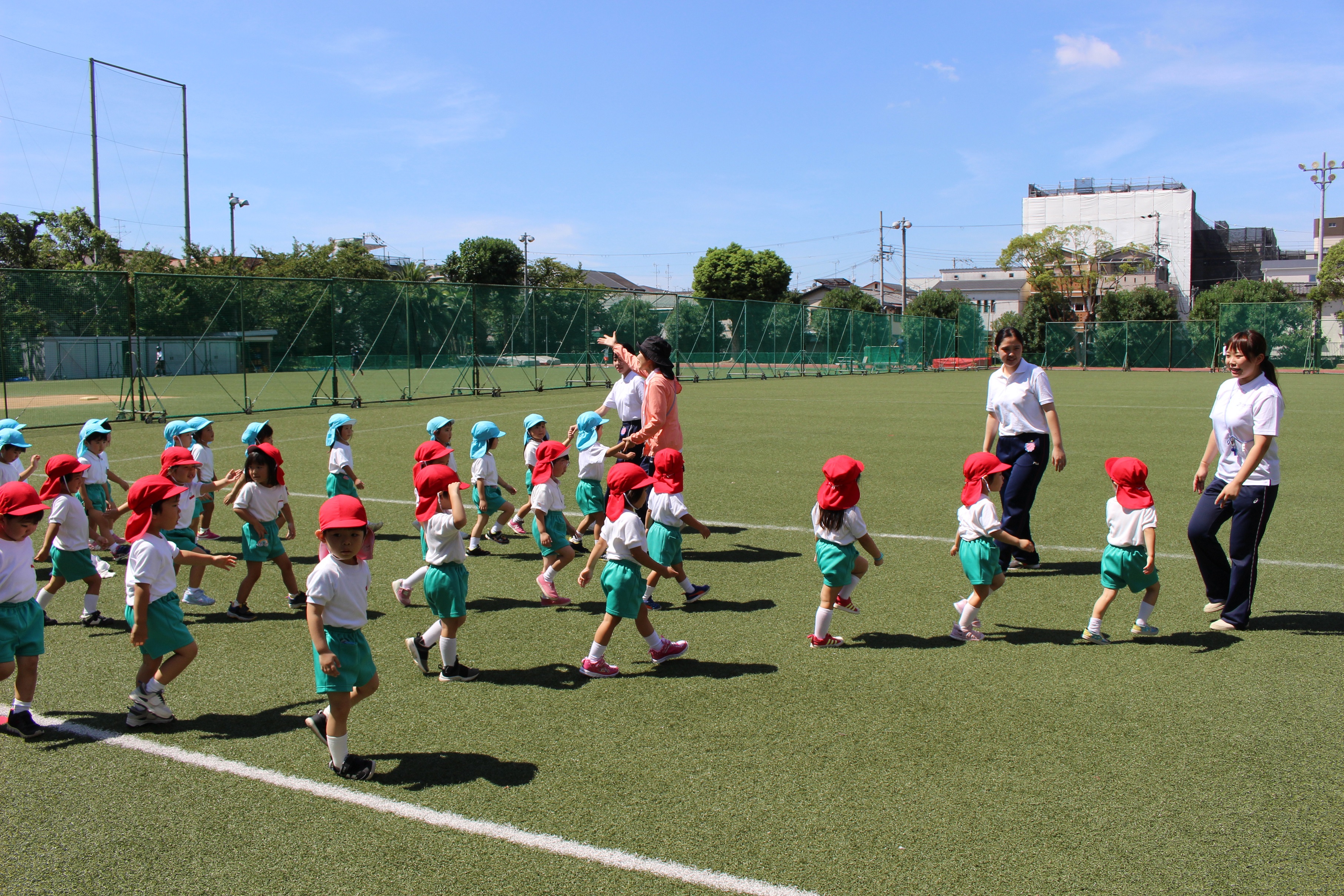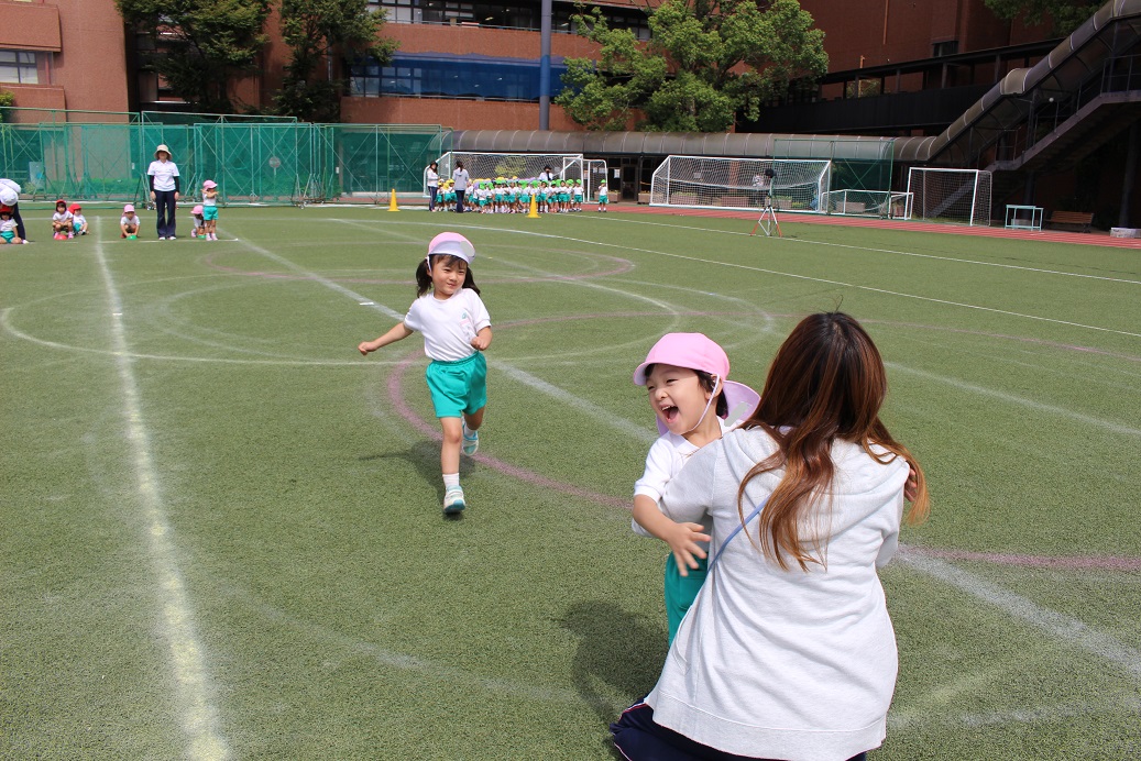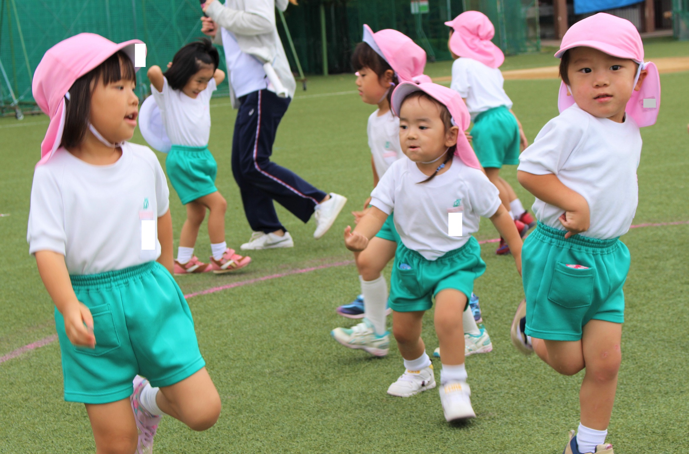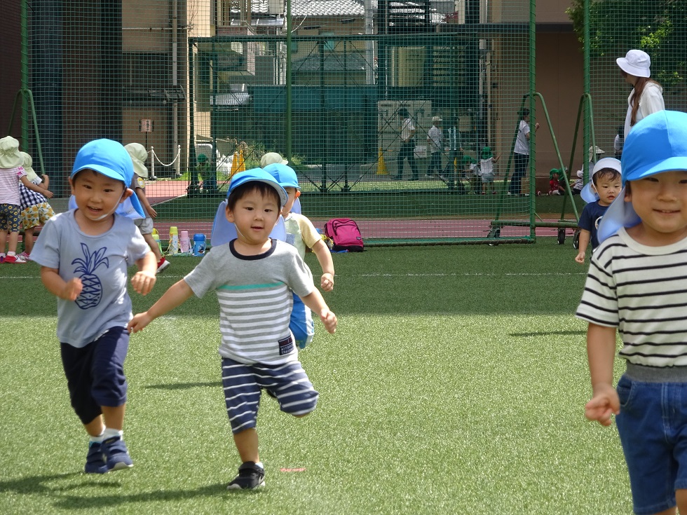 ひよこ組と一緒に広いグラウンドで「よーいドン!」を