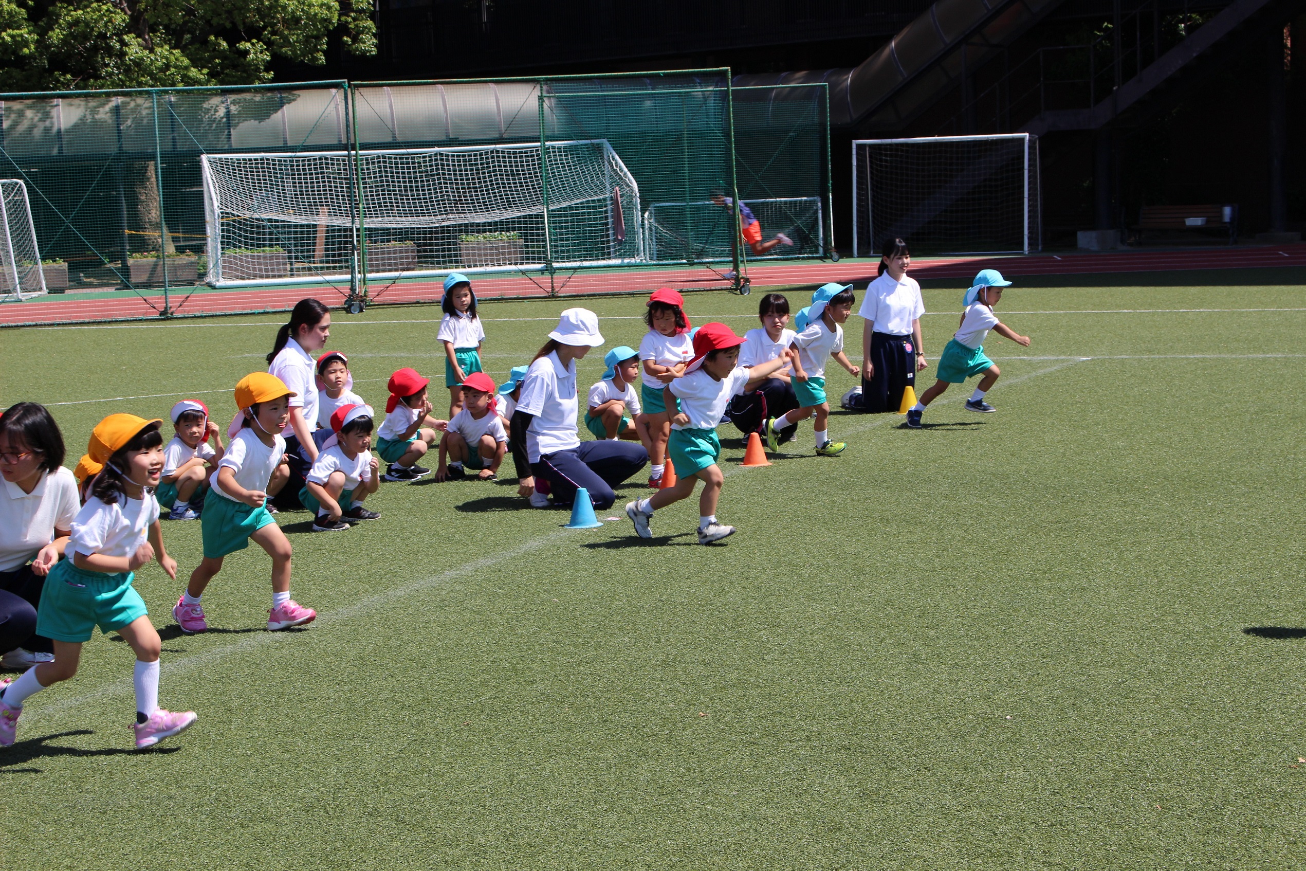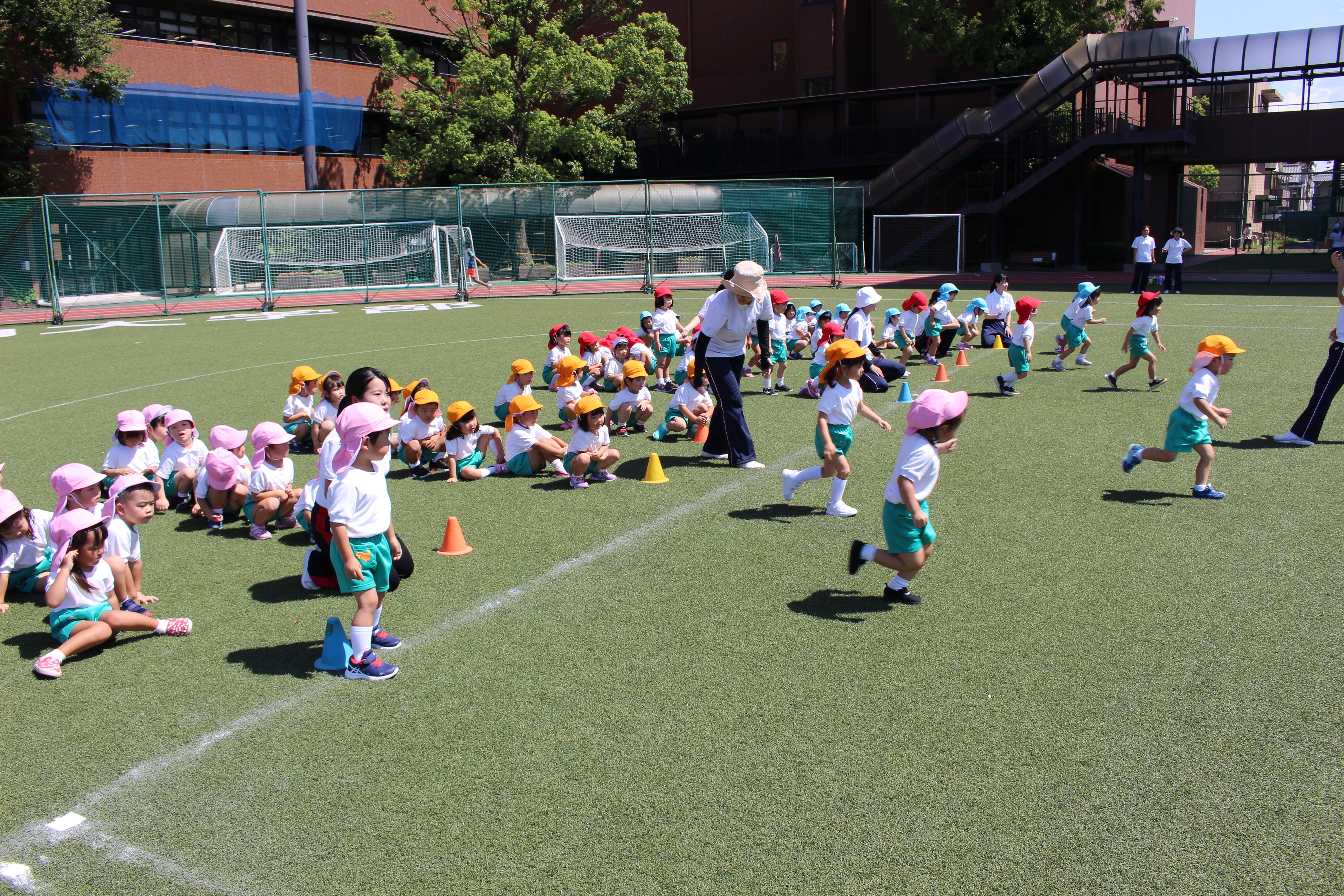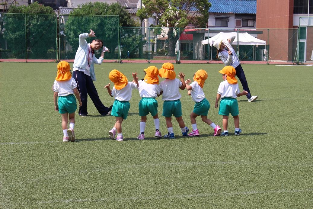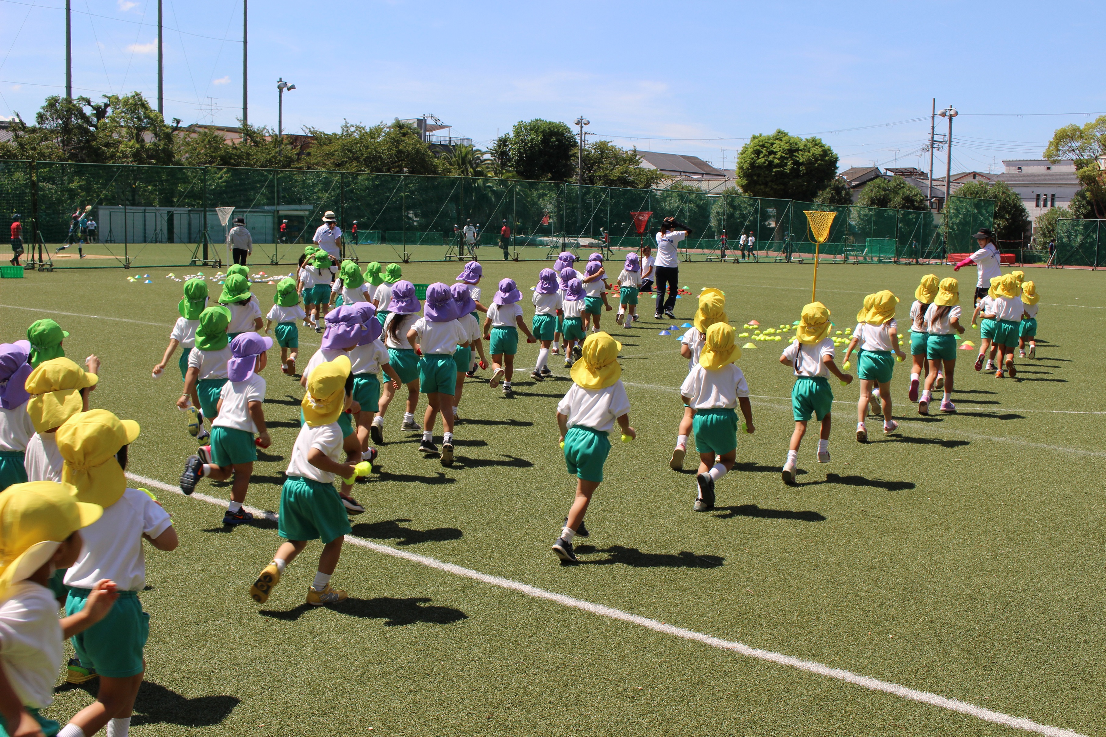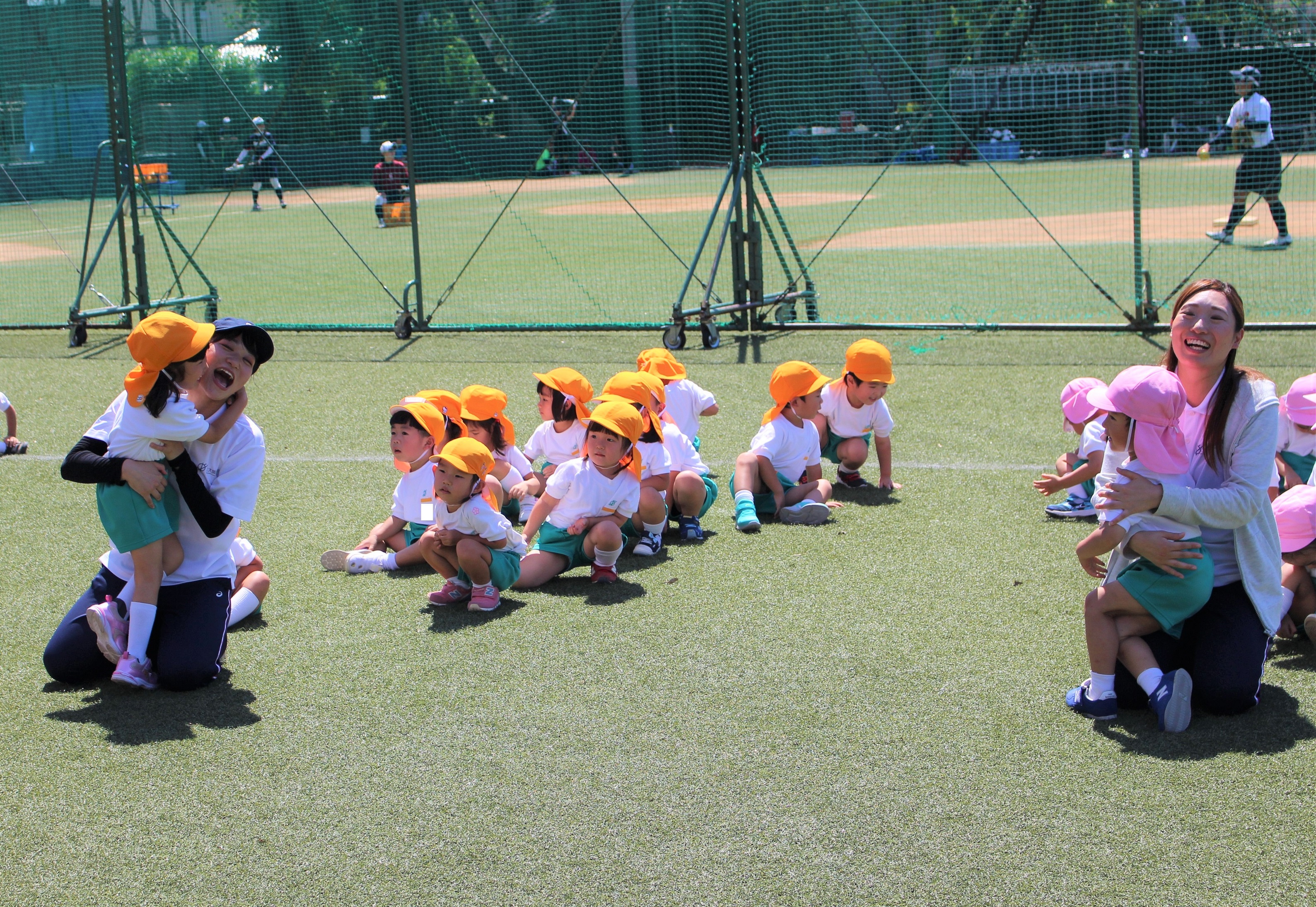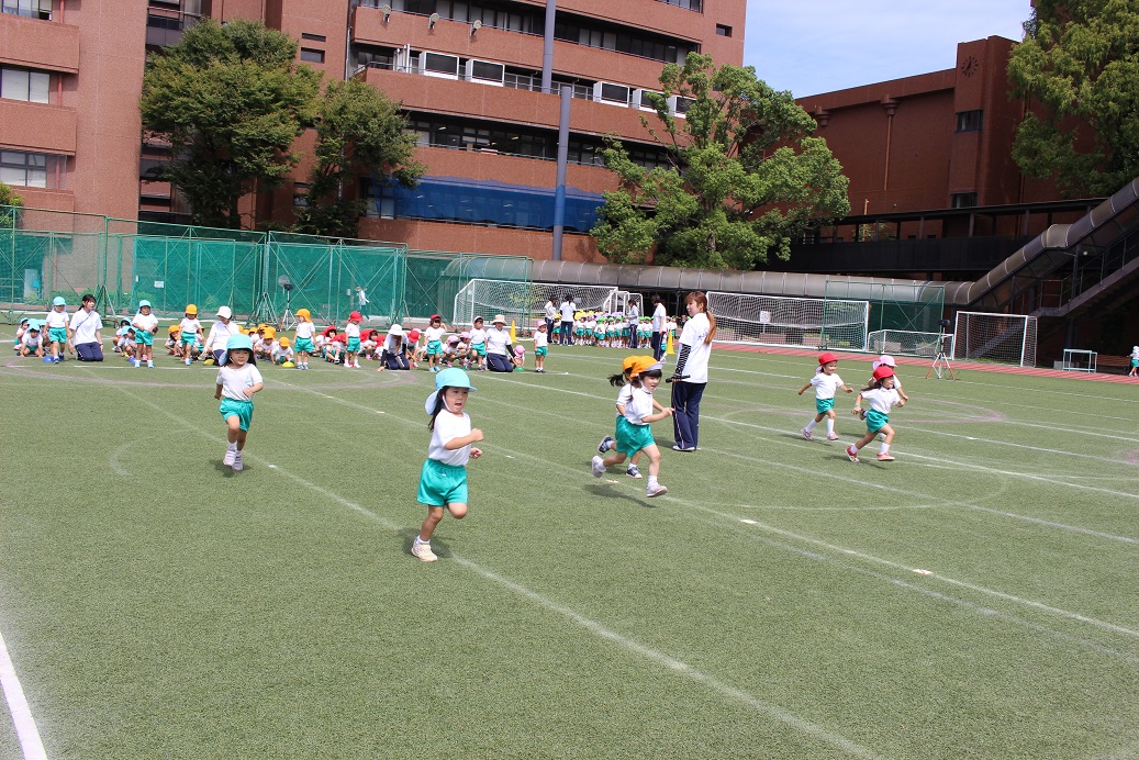 ひよこ組と一緒に広いグラウンドで「よーいドン!」を