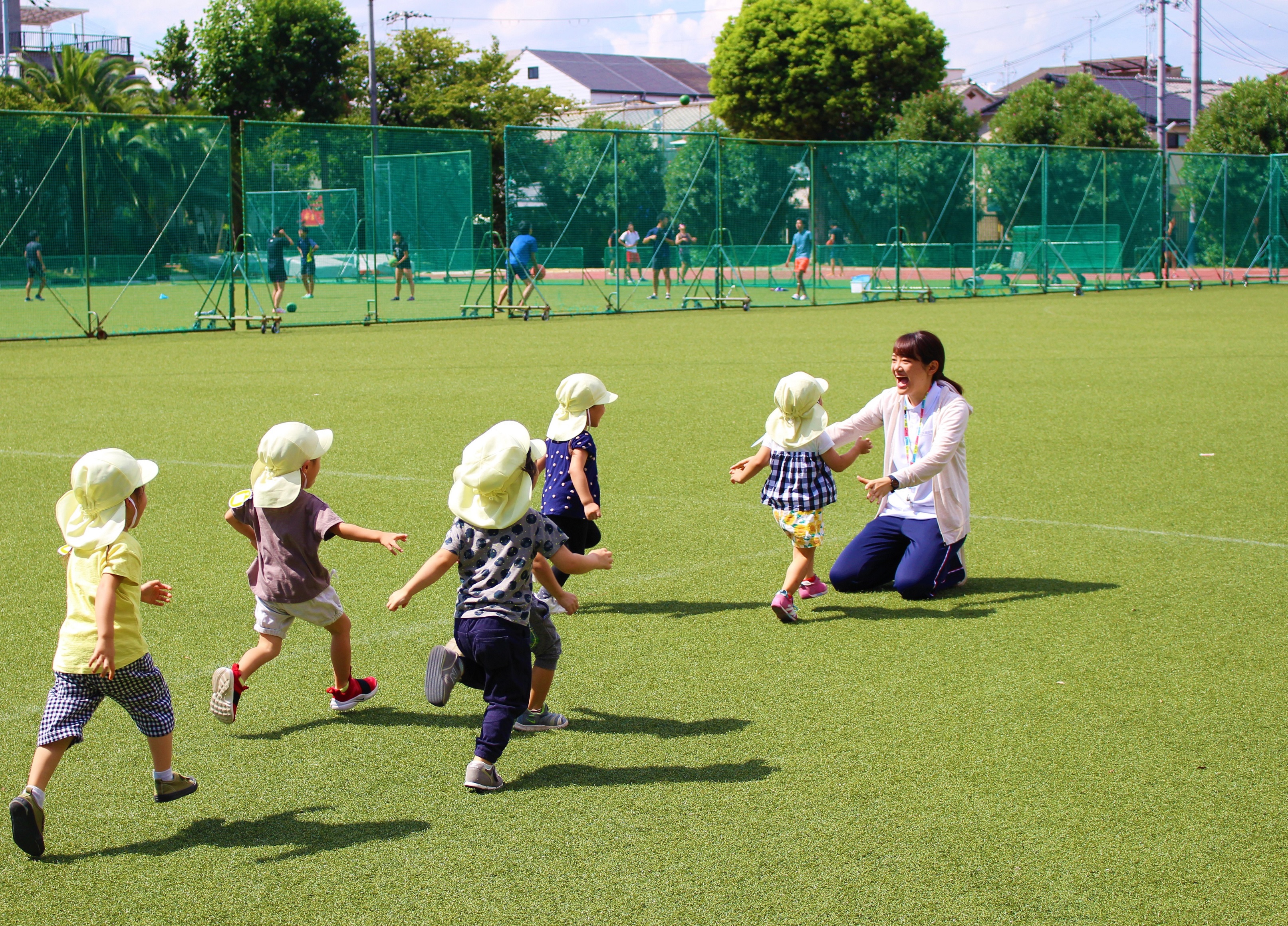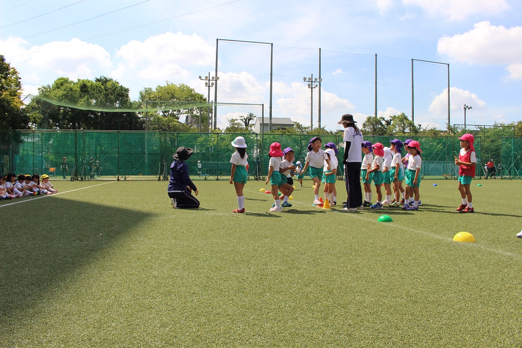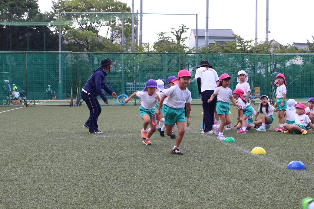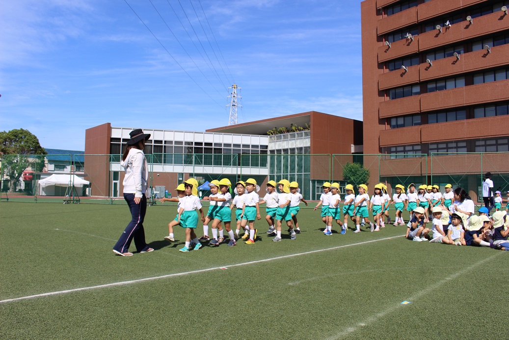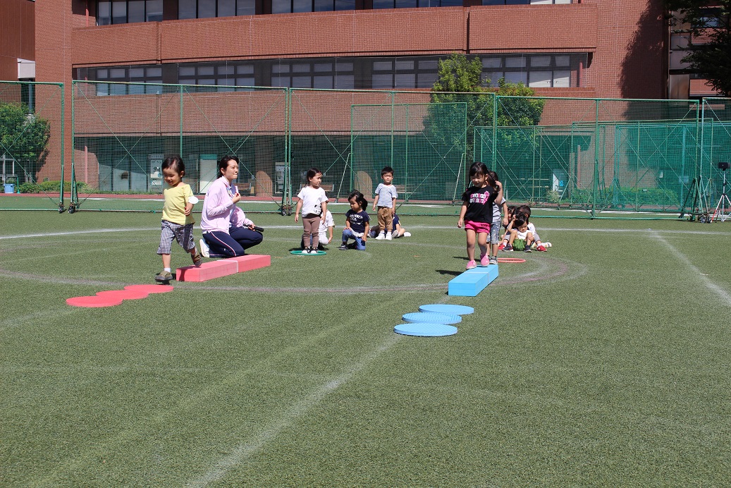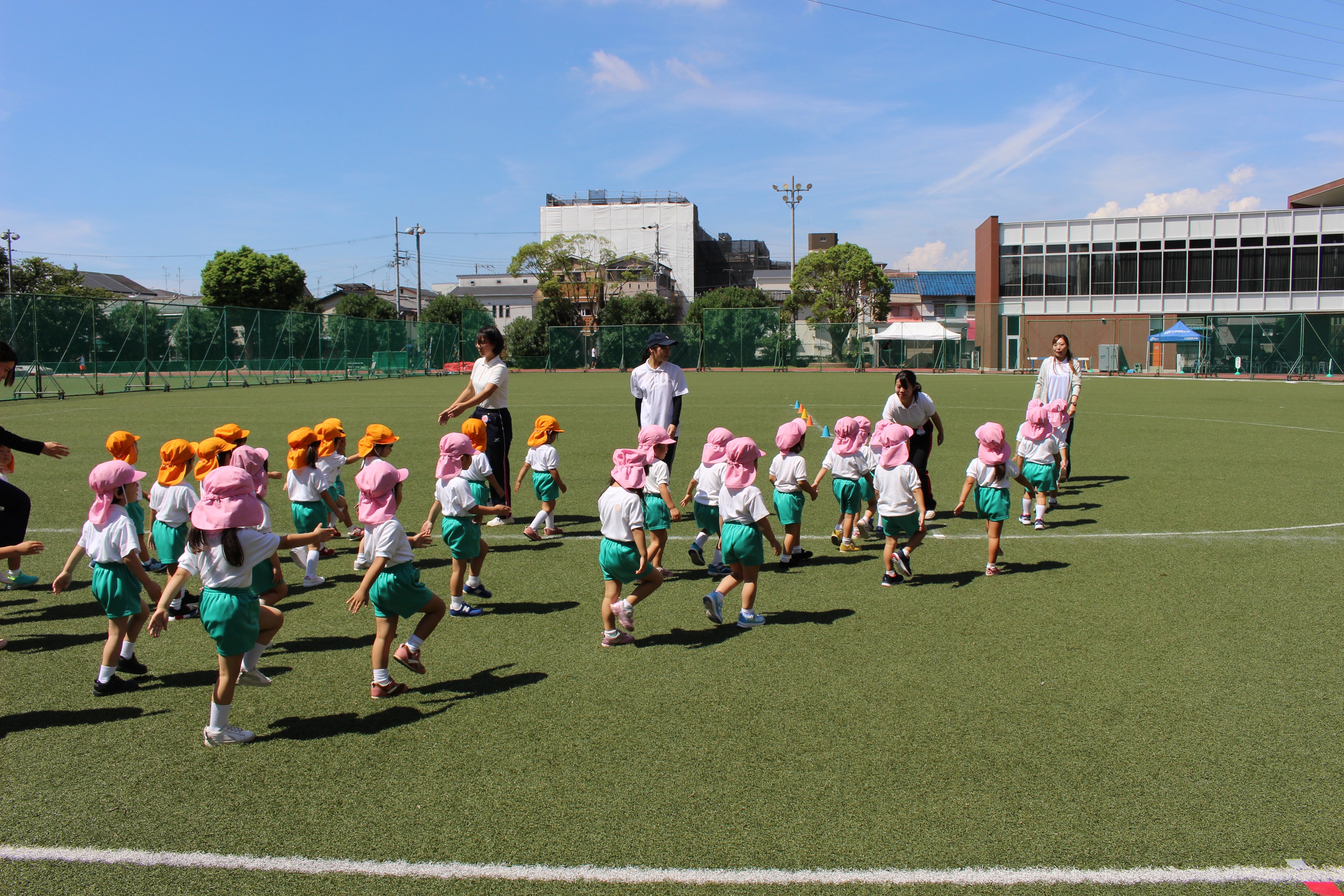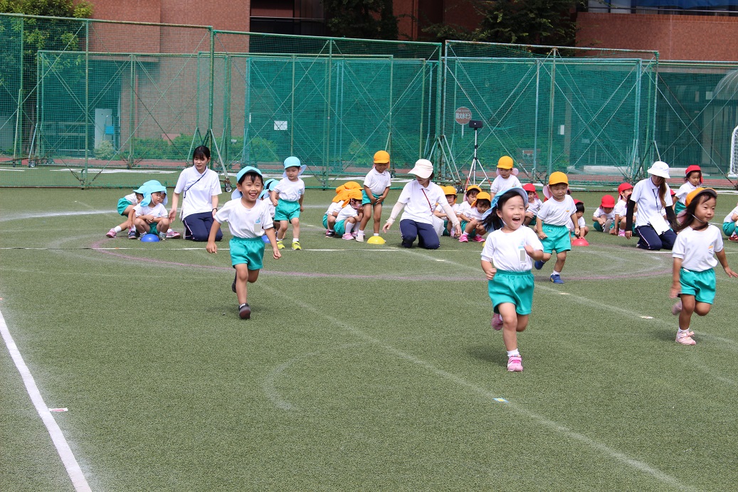 ひよこ組と一緒に広いグラウンドで「よーいドン!」を