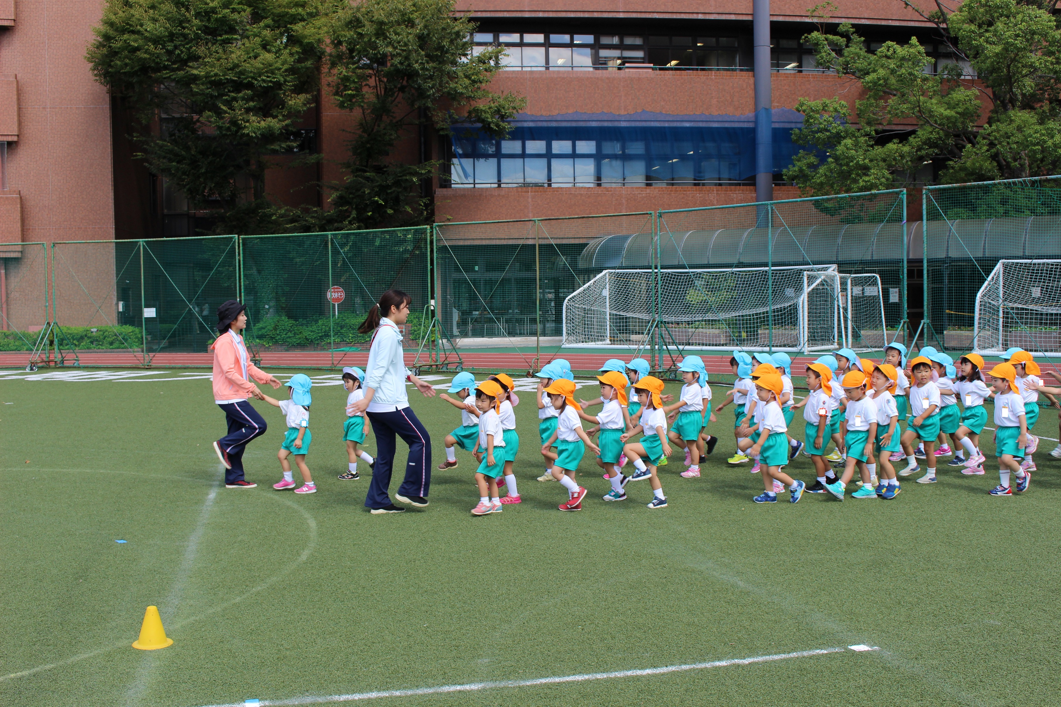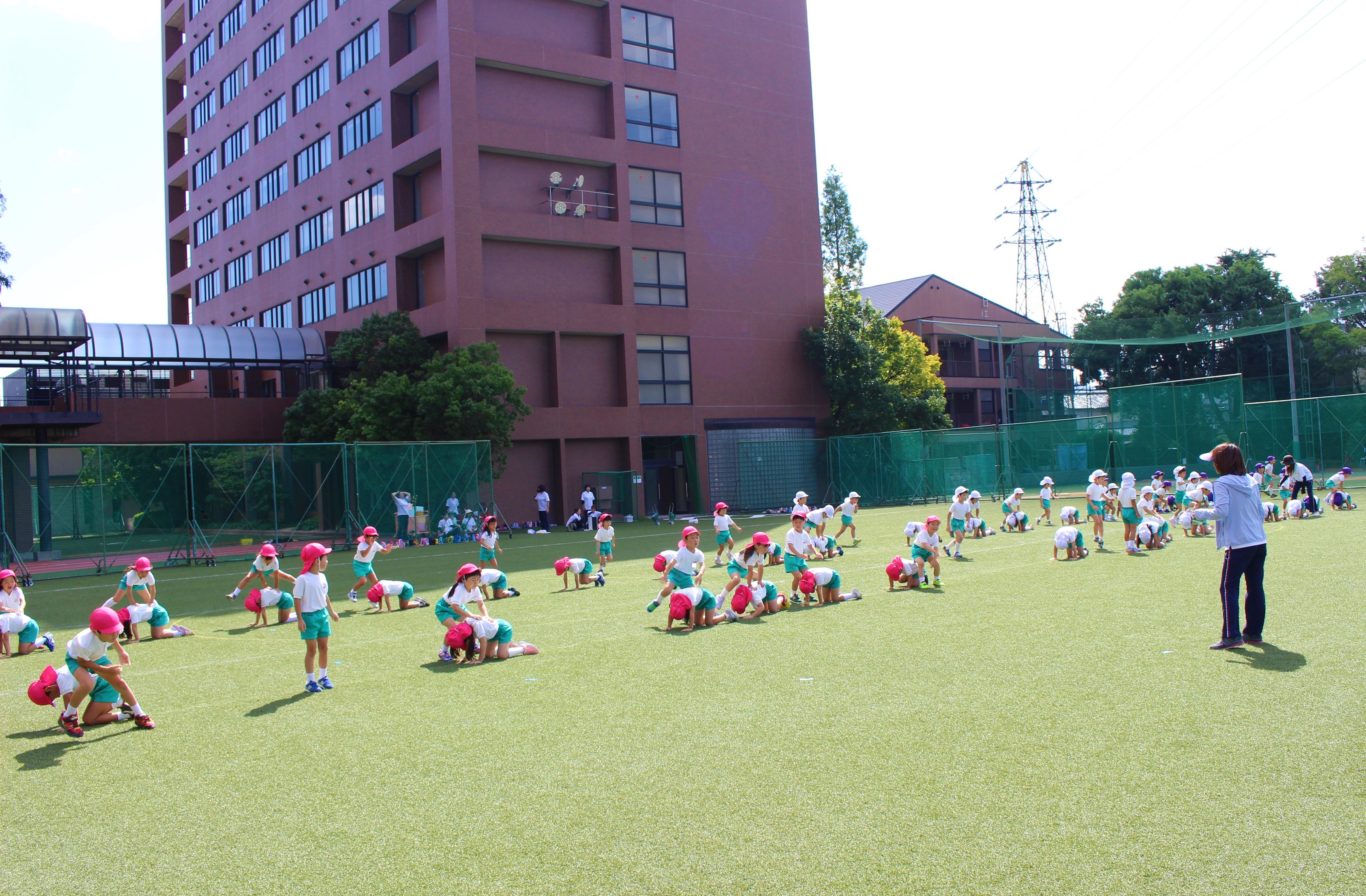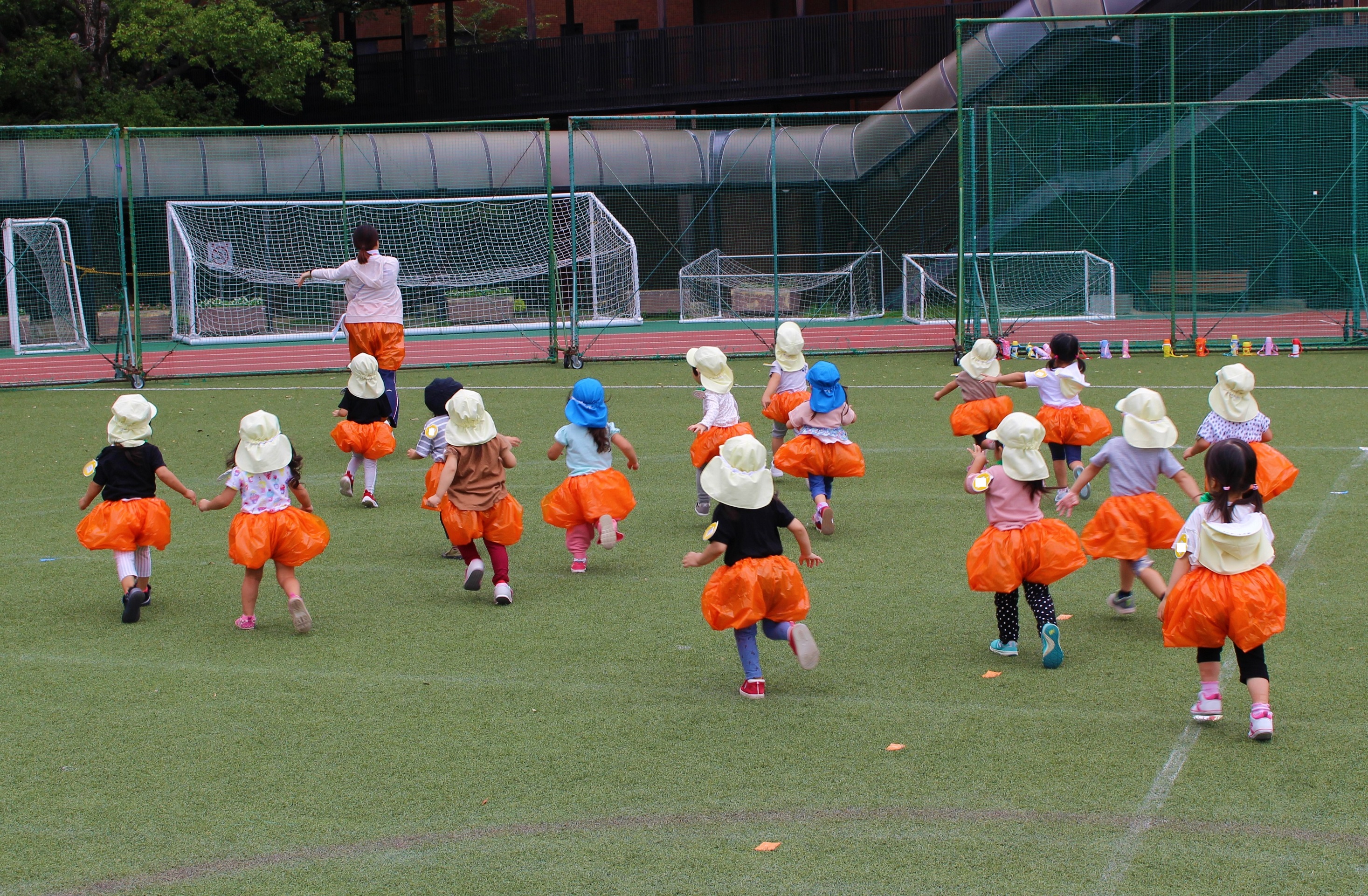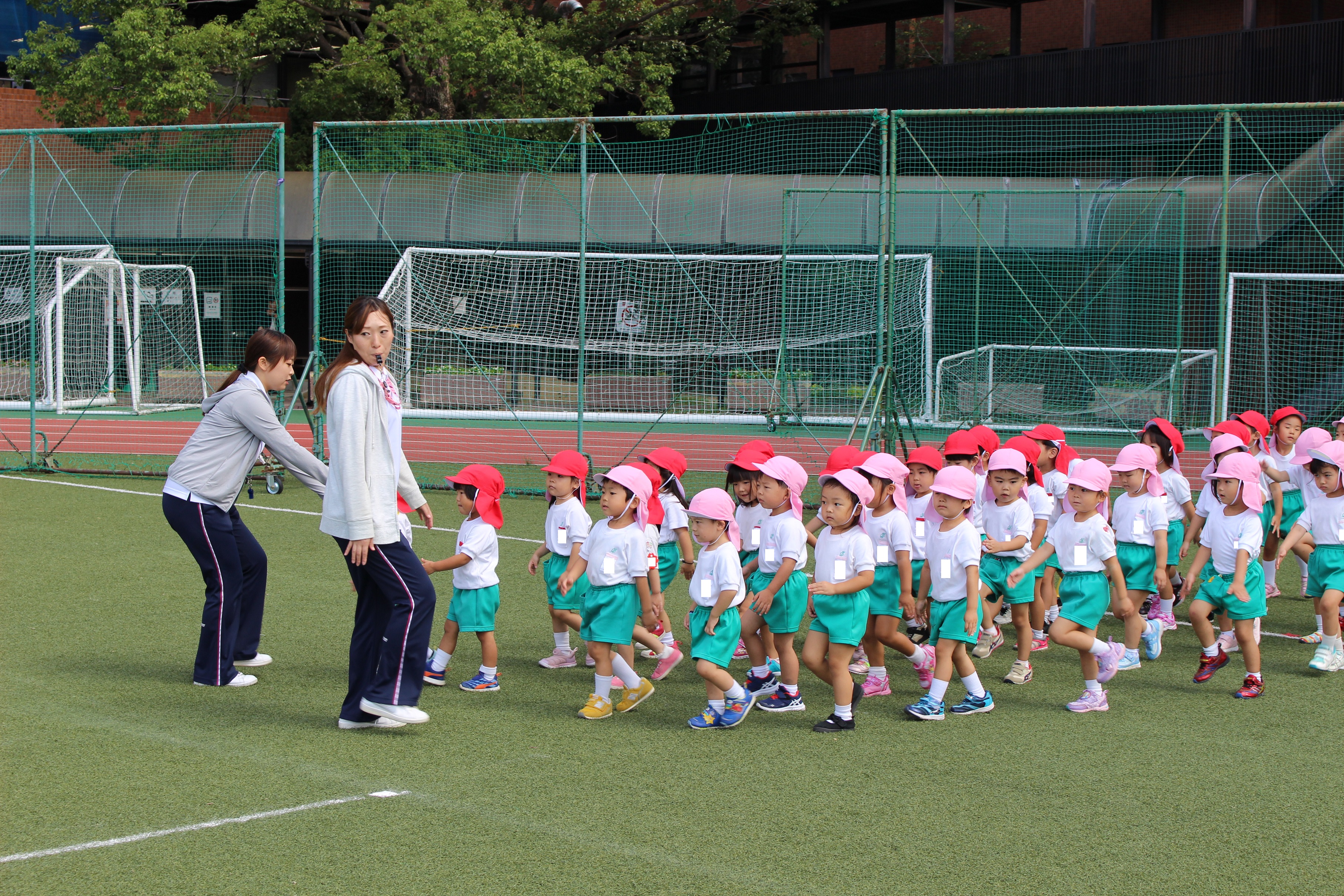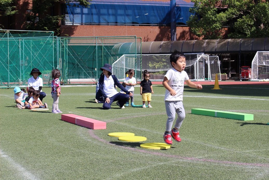 ひよこ組と一緒に広いグラウンドで「よーいドン!」を