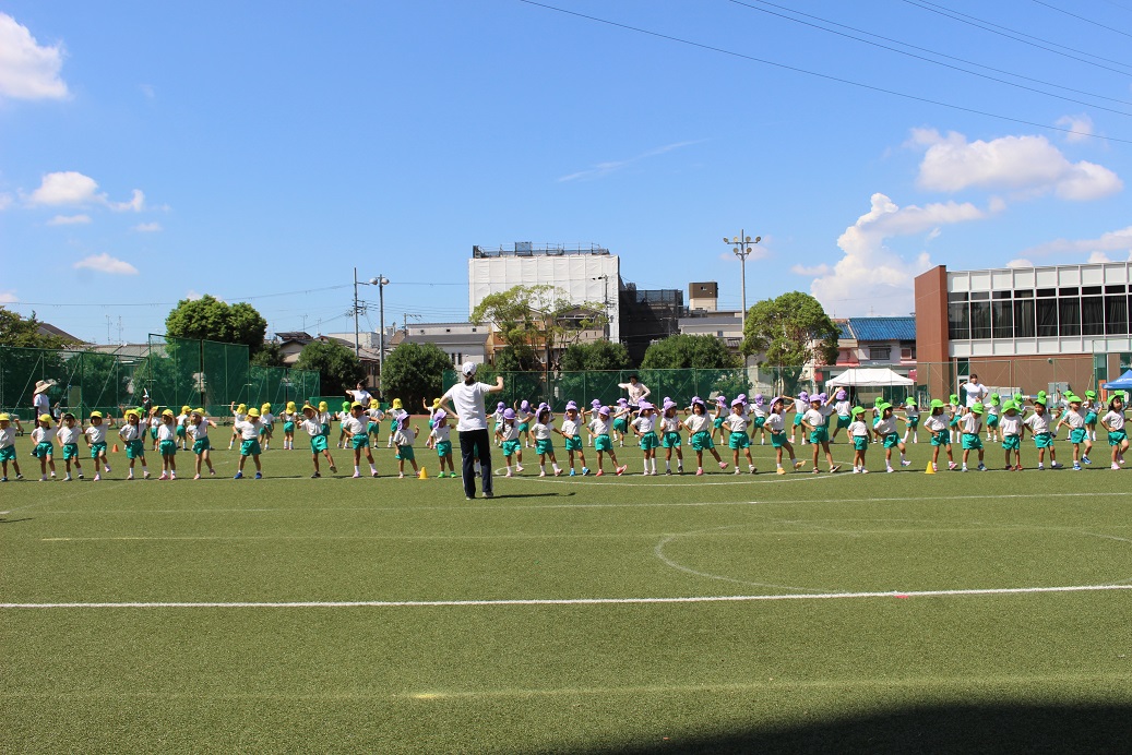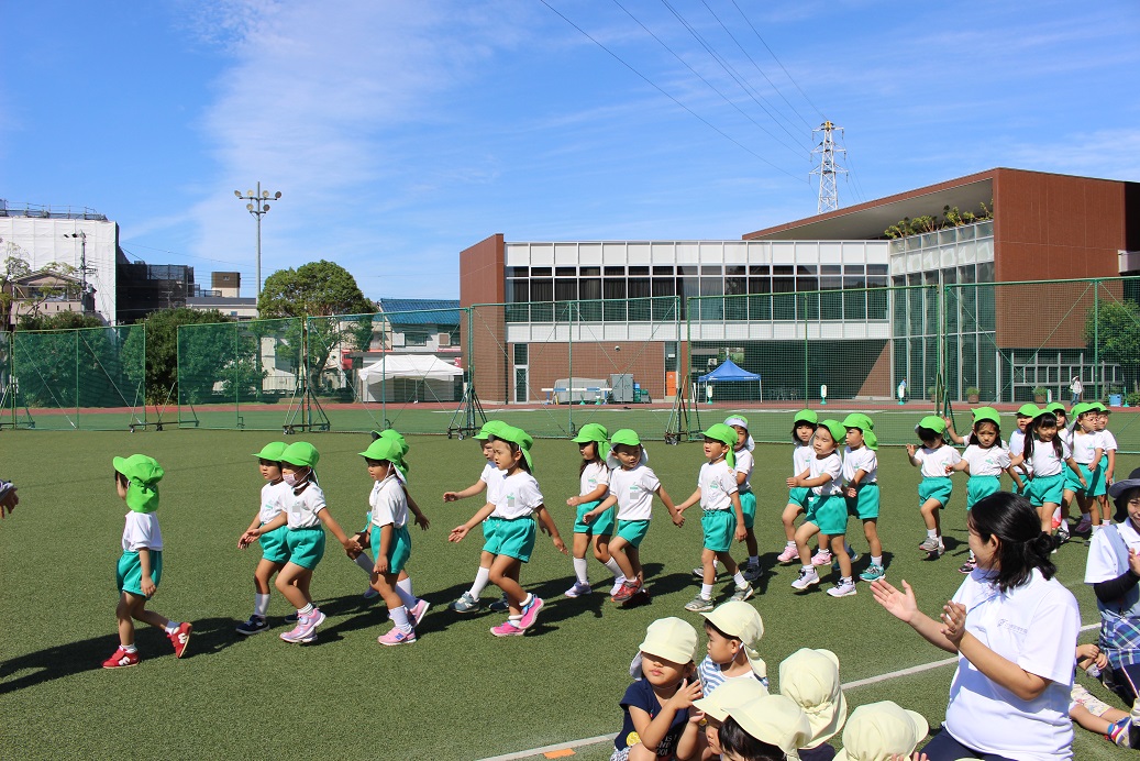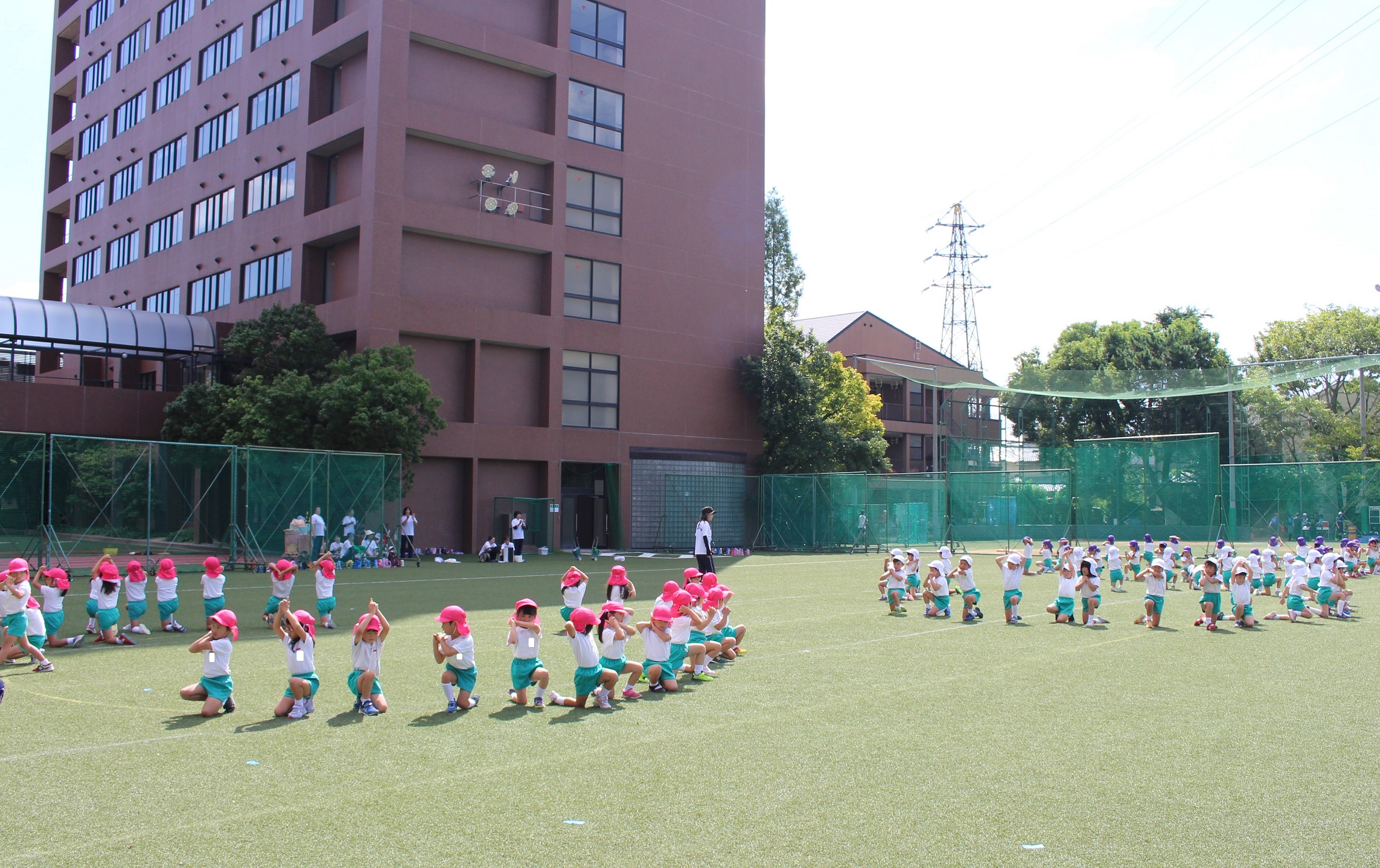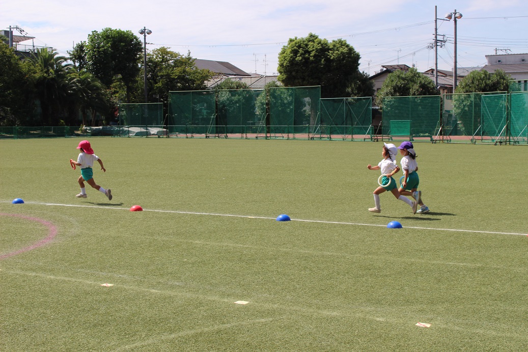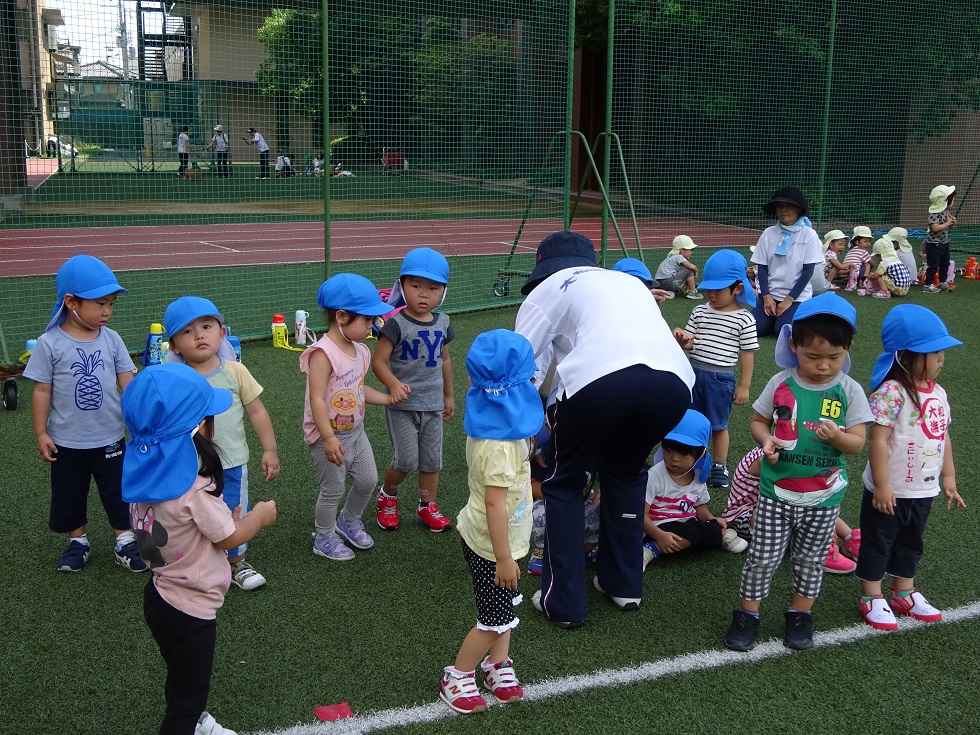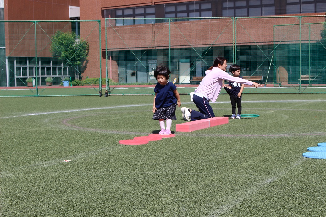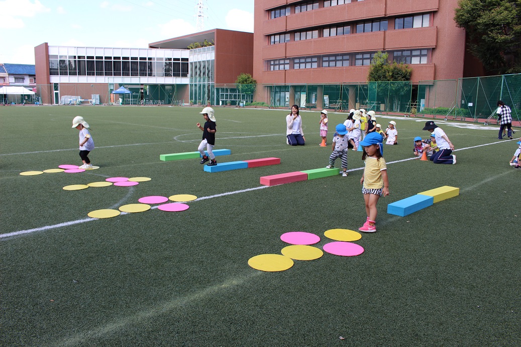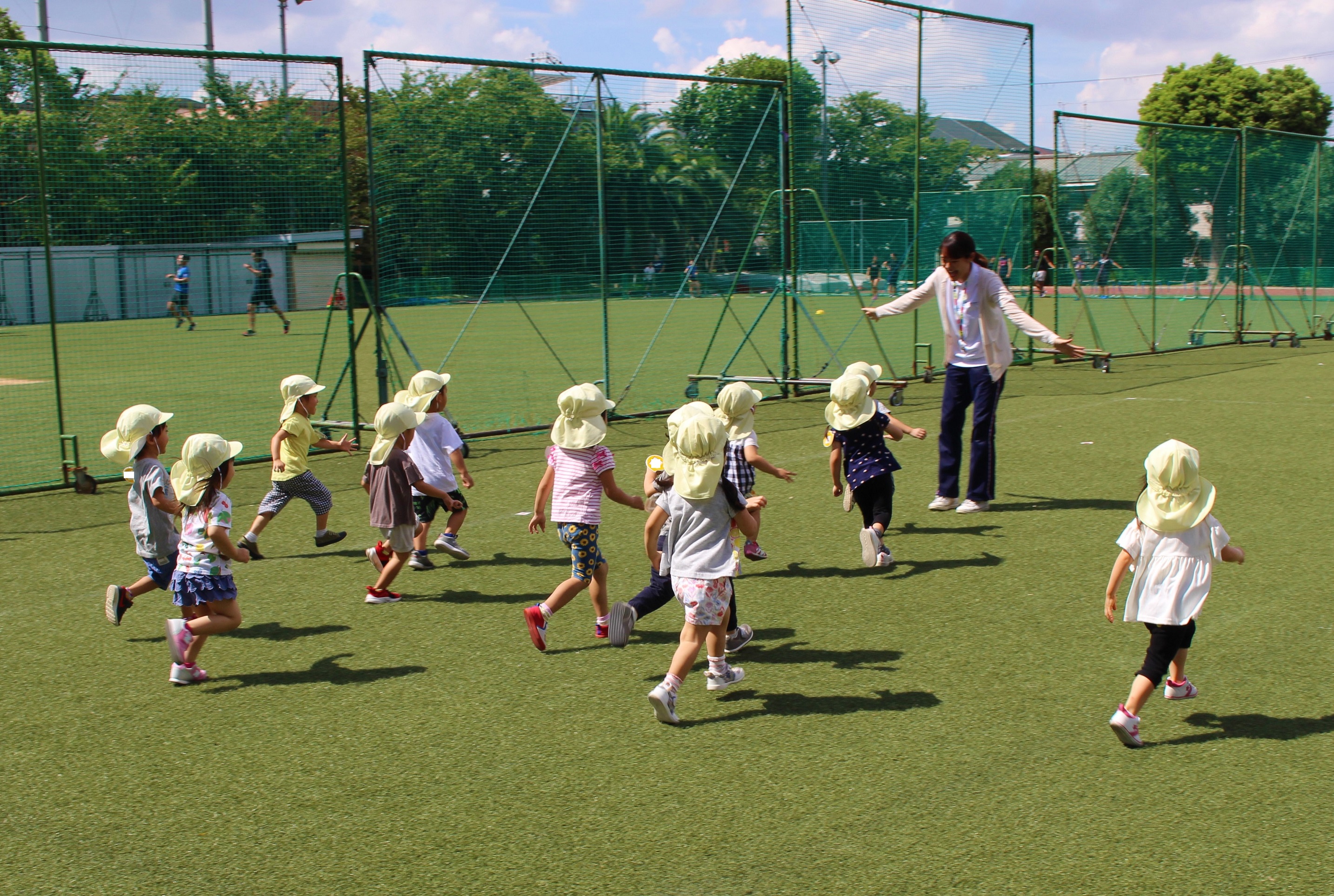 ひよこ組と一緒に広いグラウンドで「よーいドン!」を
