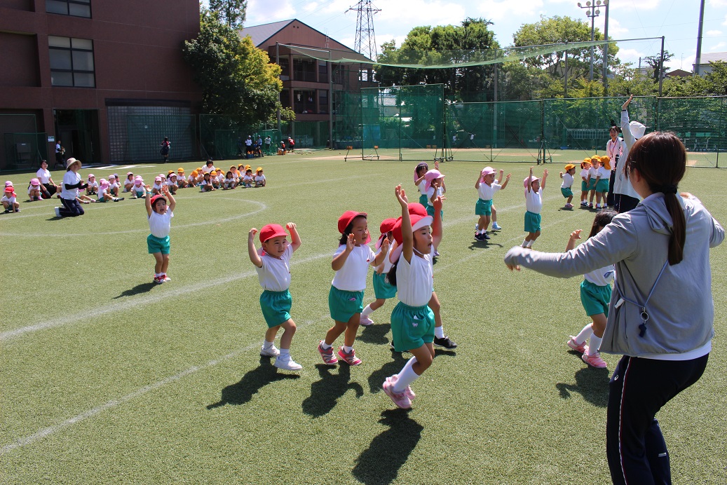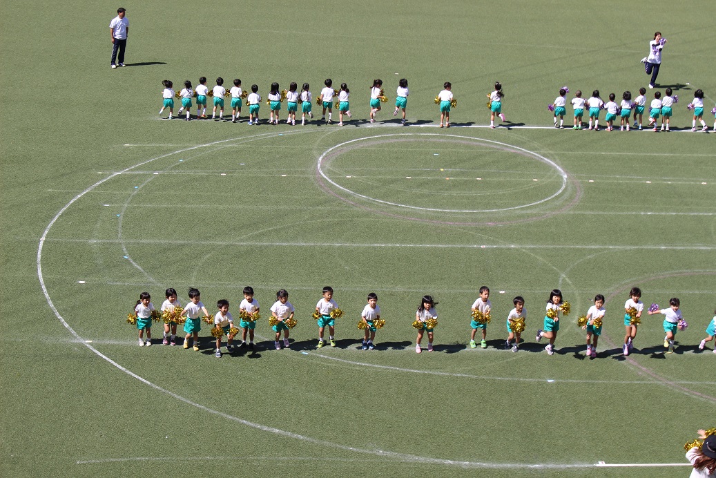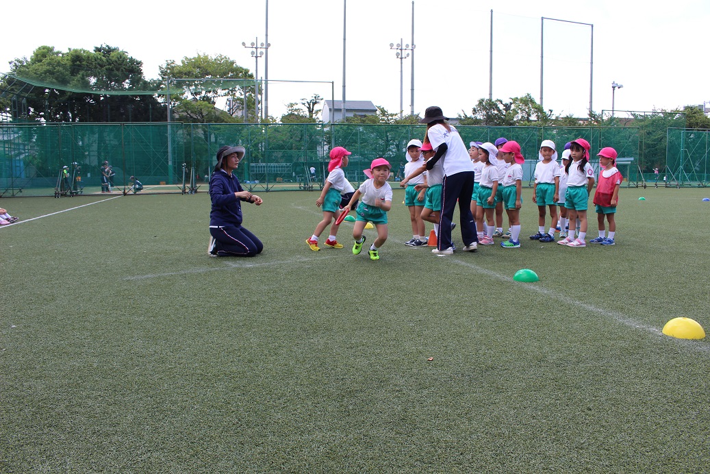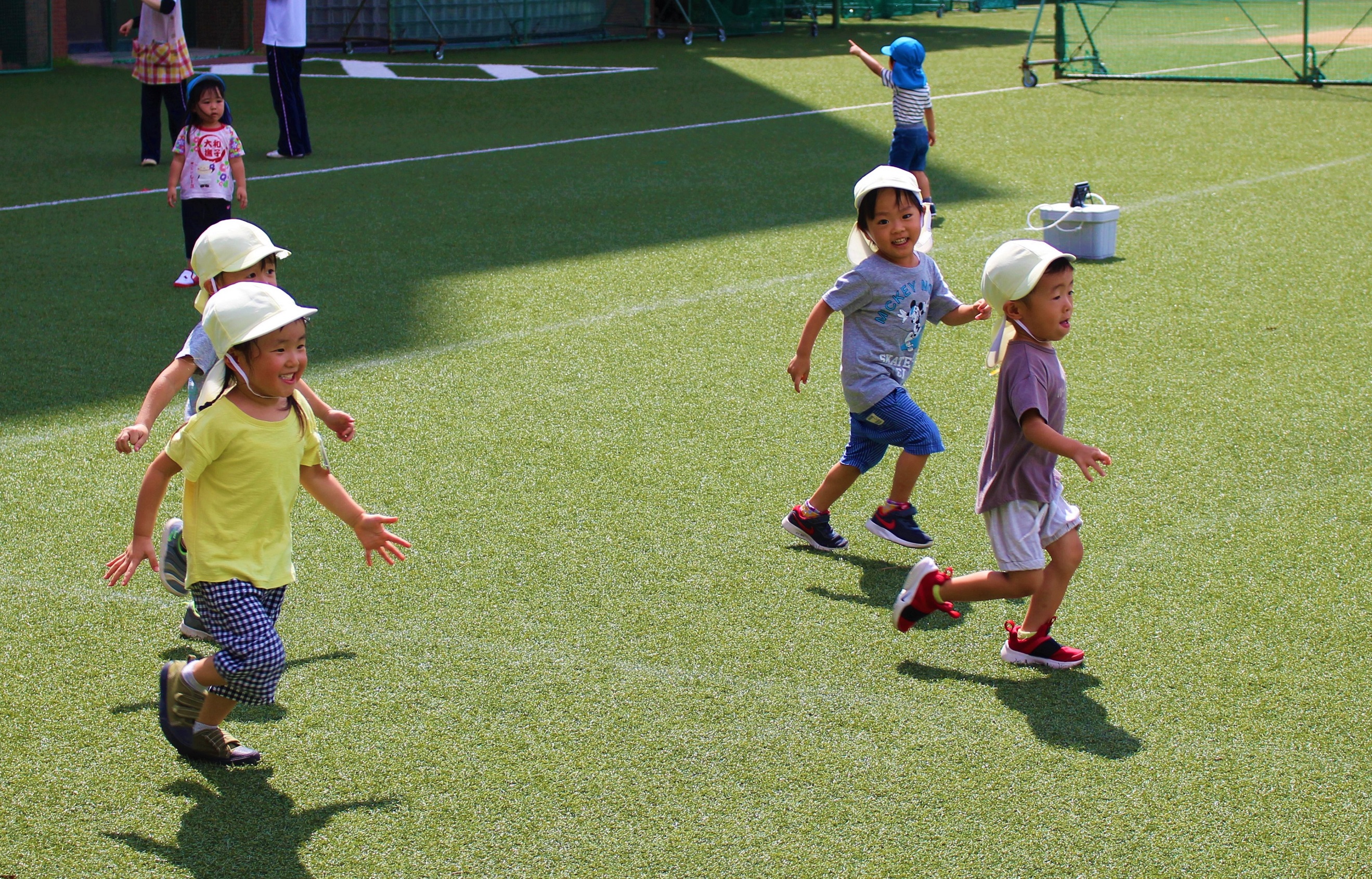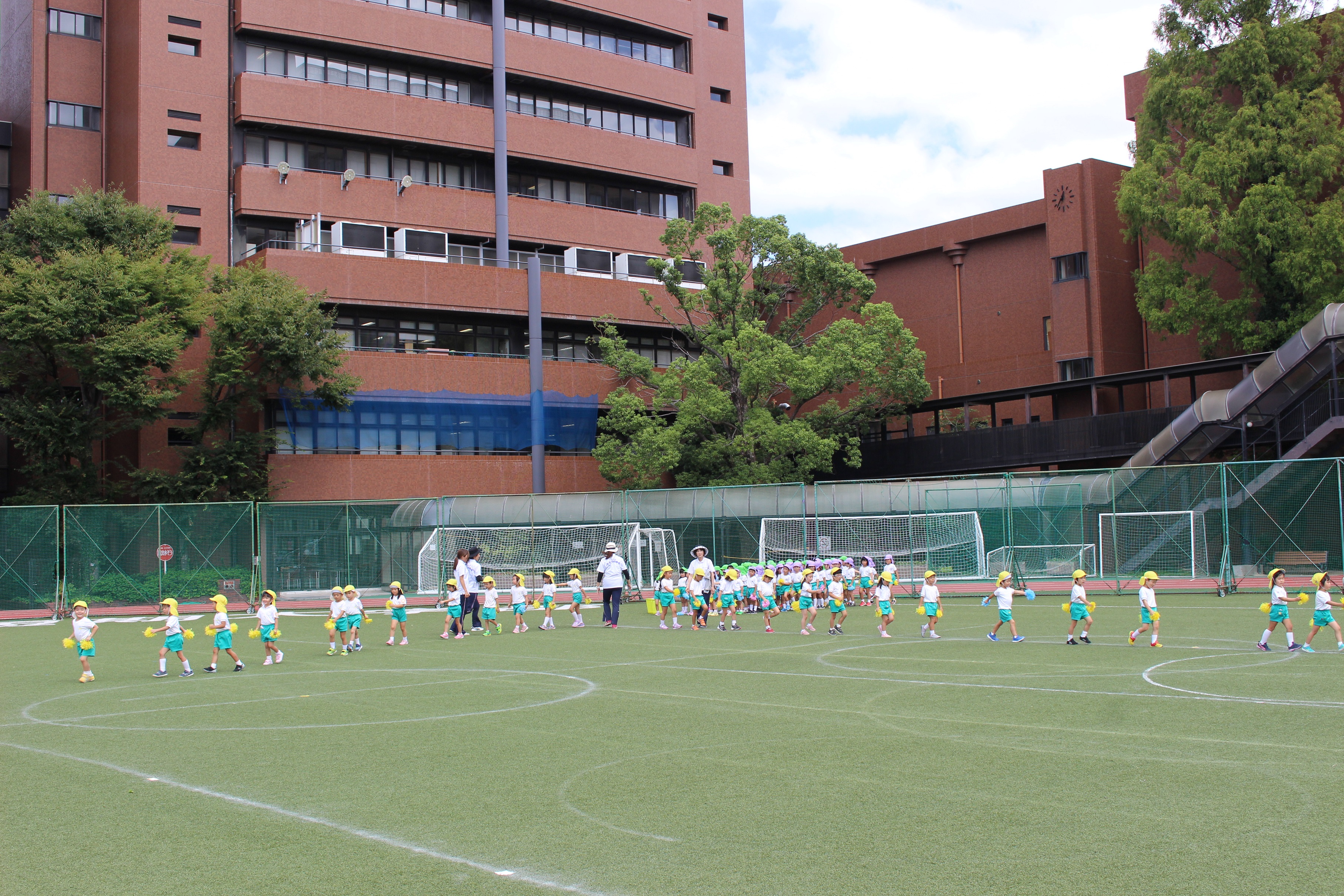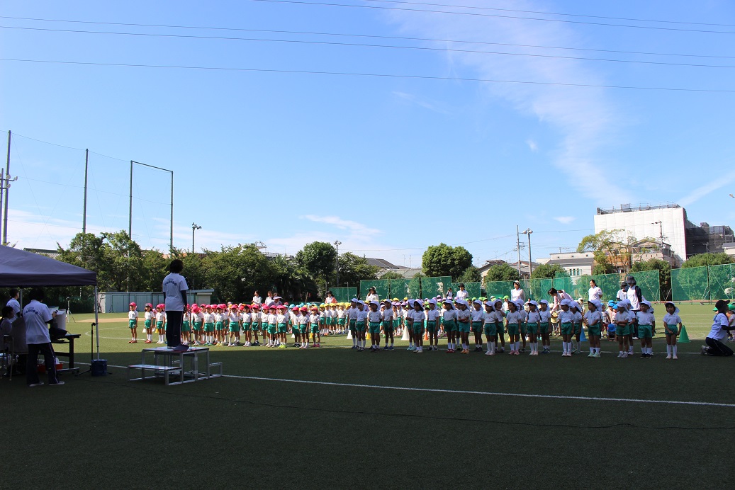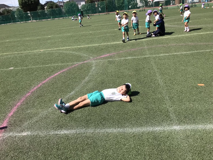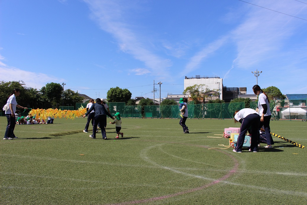 ひよこ組と一緒に広いグラウンドで「よーいドン!」を