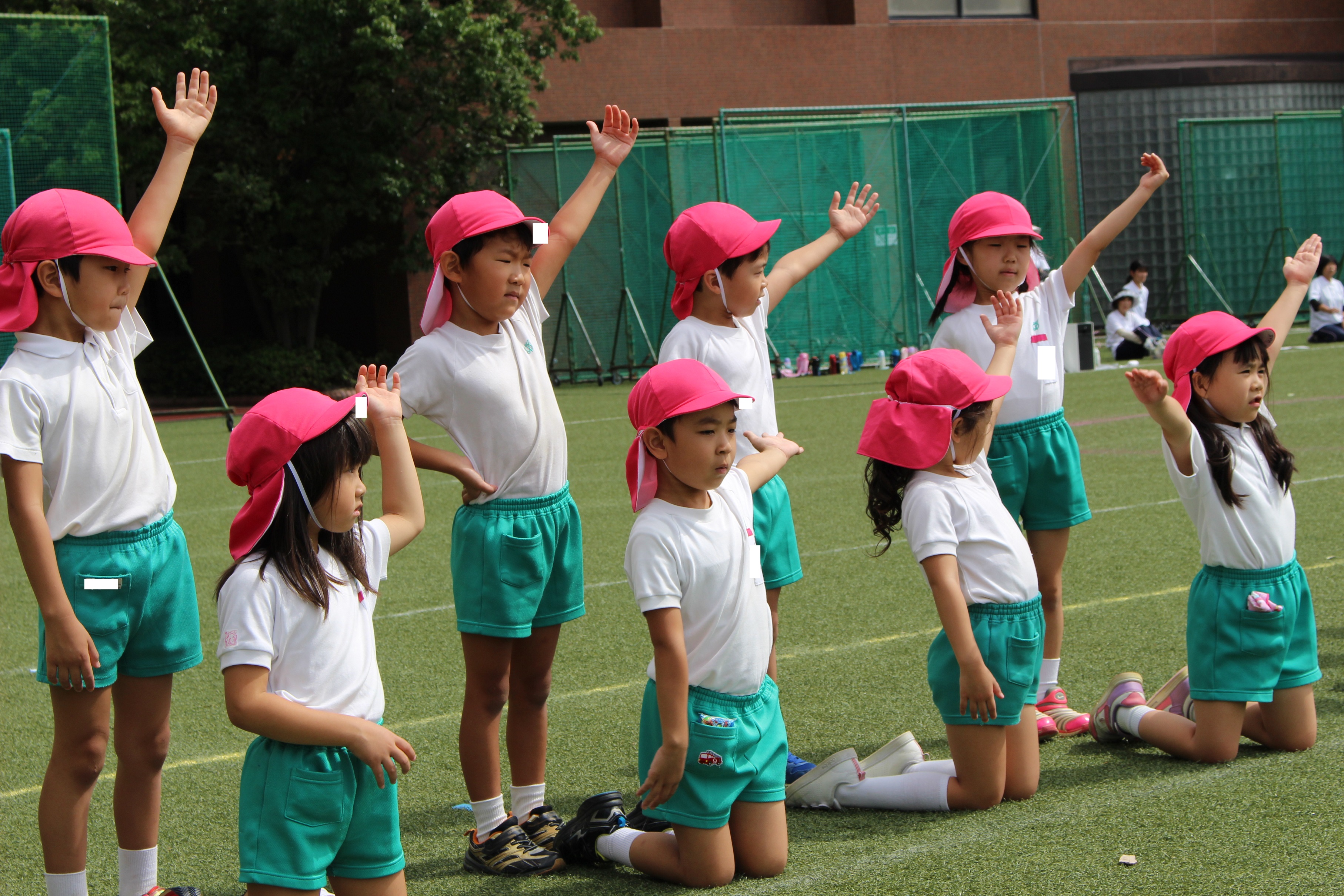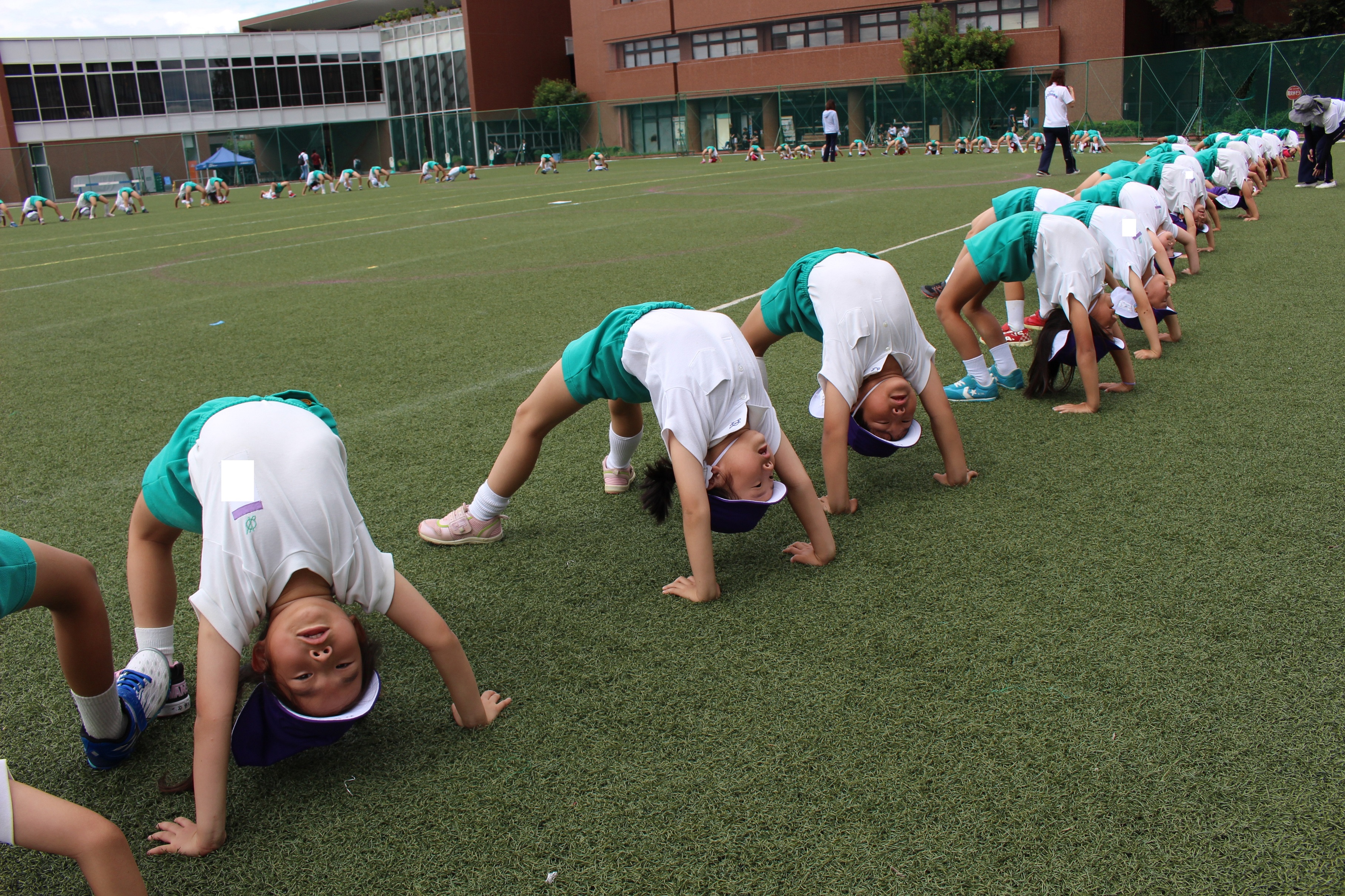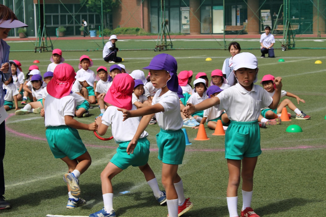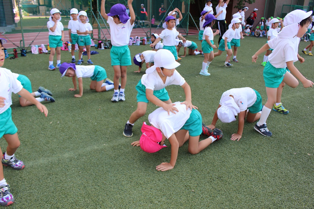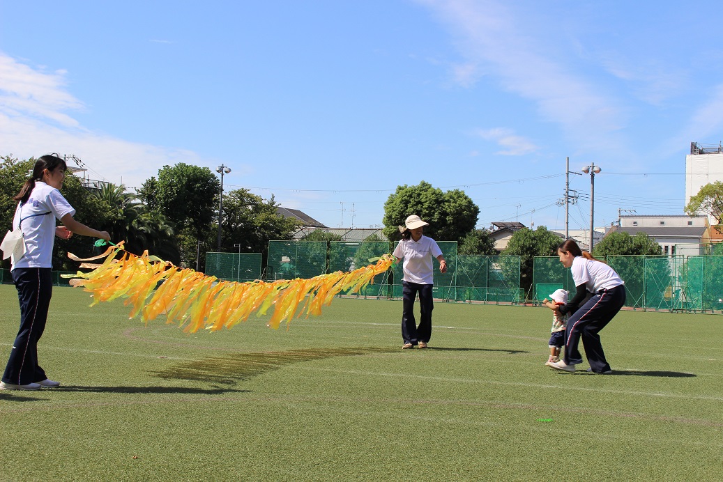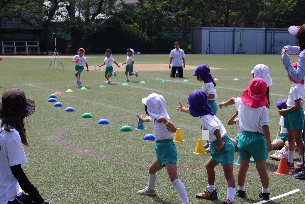 日陰のグラウンドで運動会の親子ゲームの練習です。