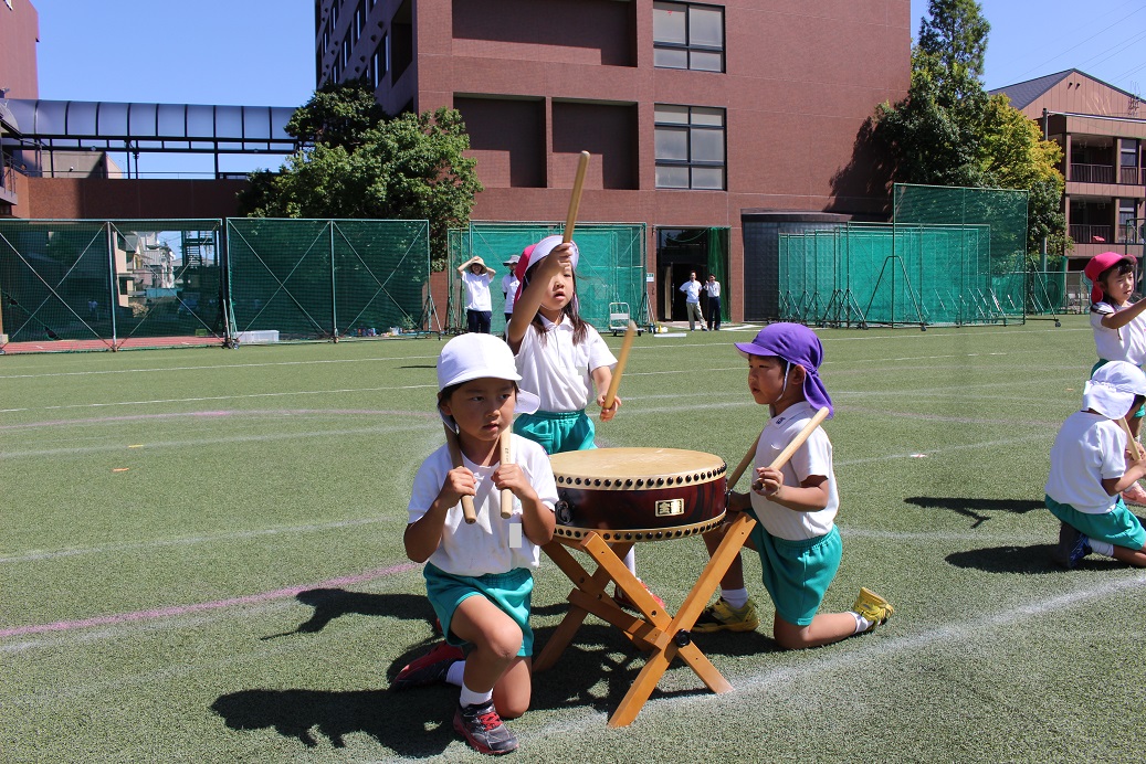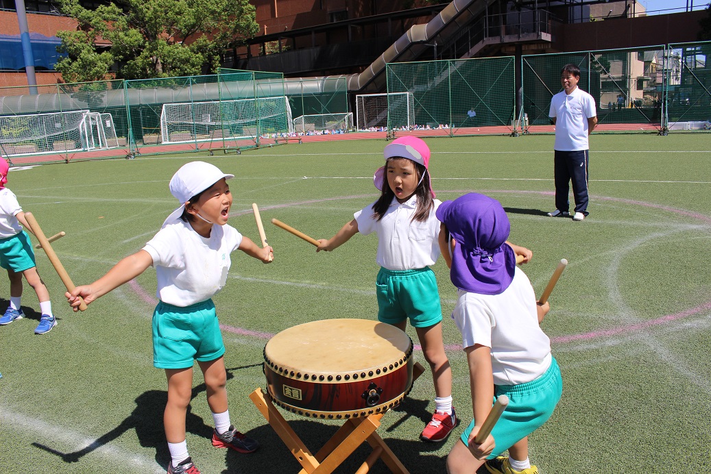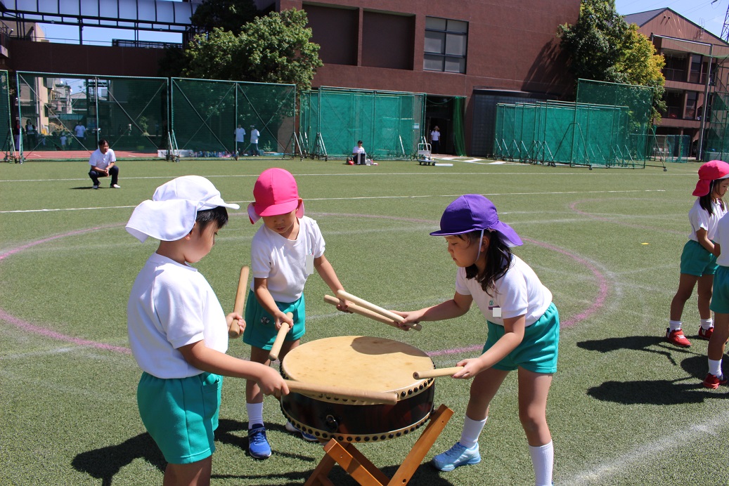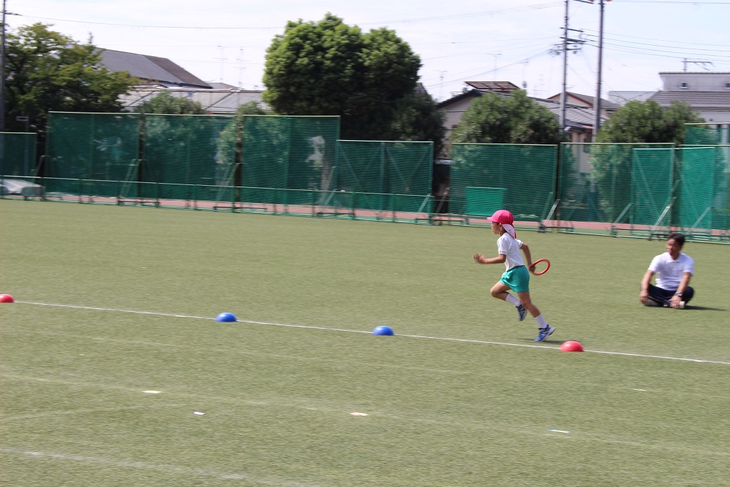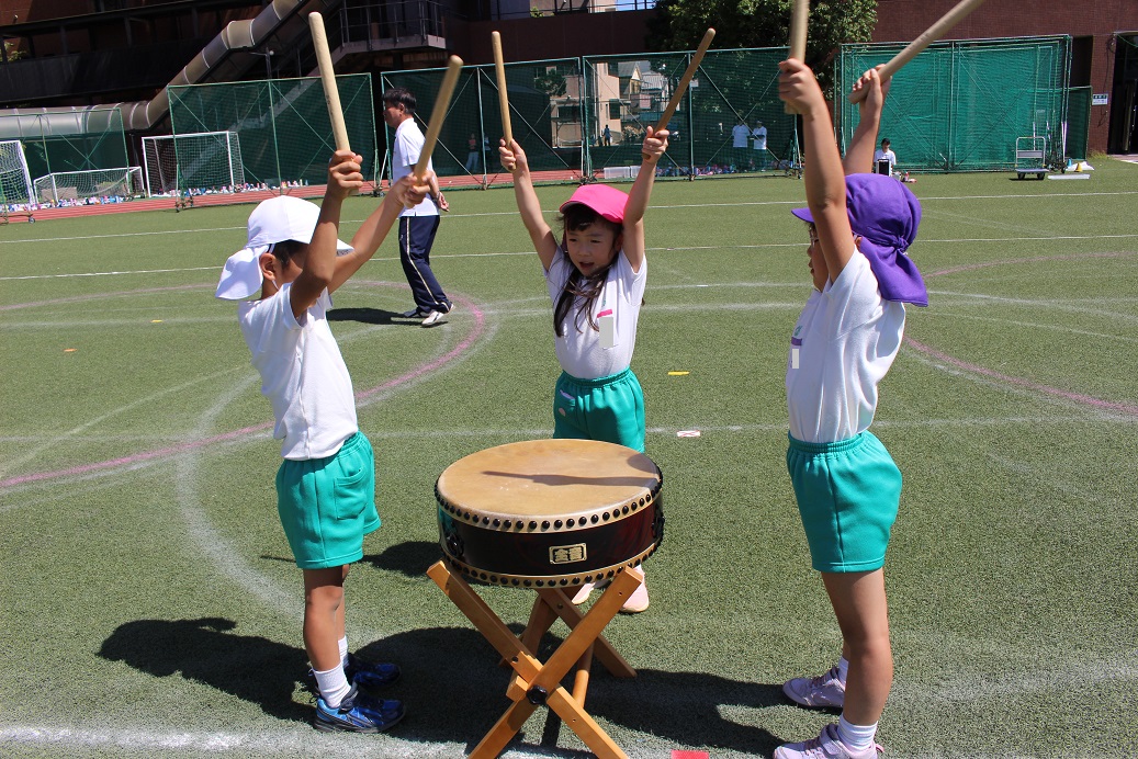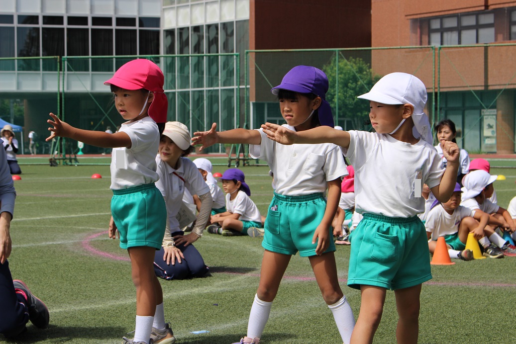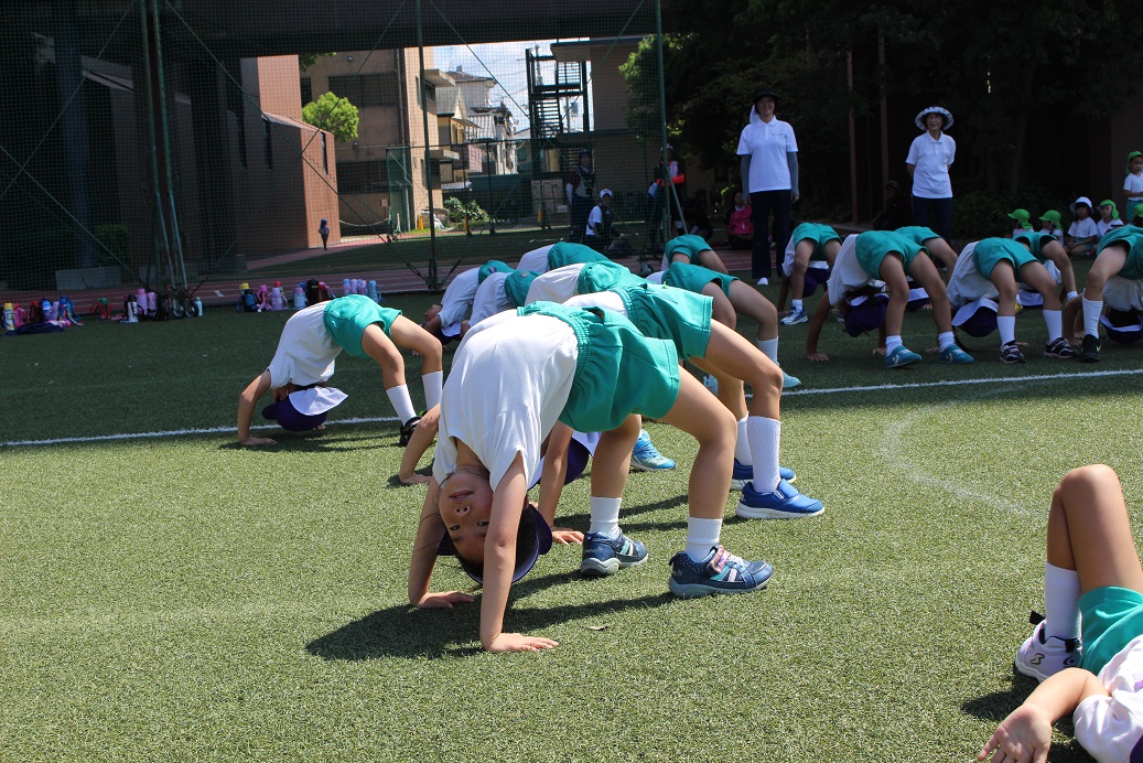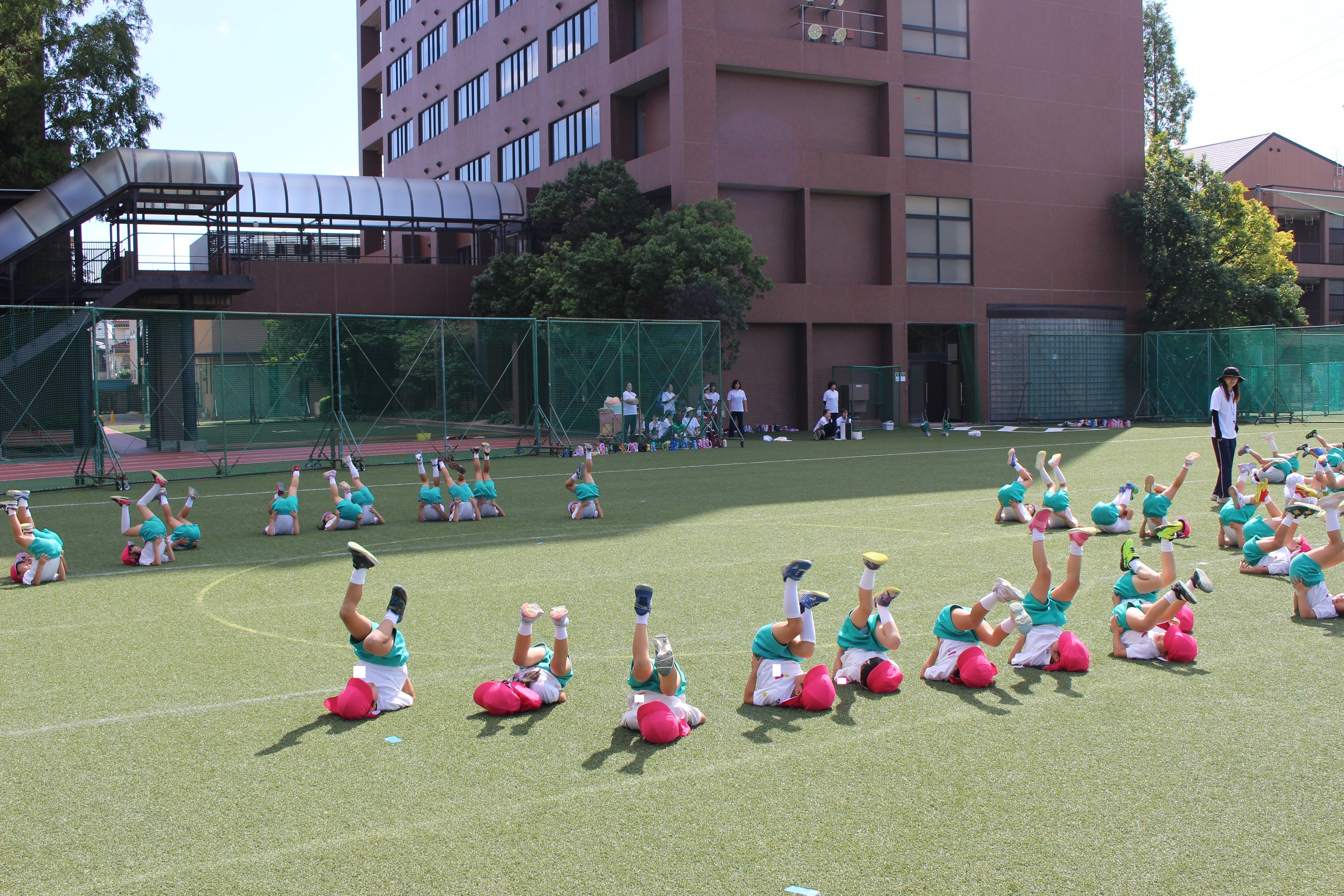 日陰のグラウンドで運動会の親子ゲームの練習です。