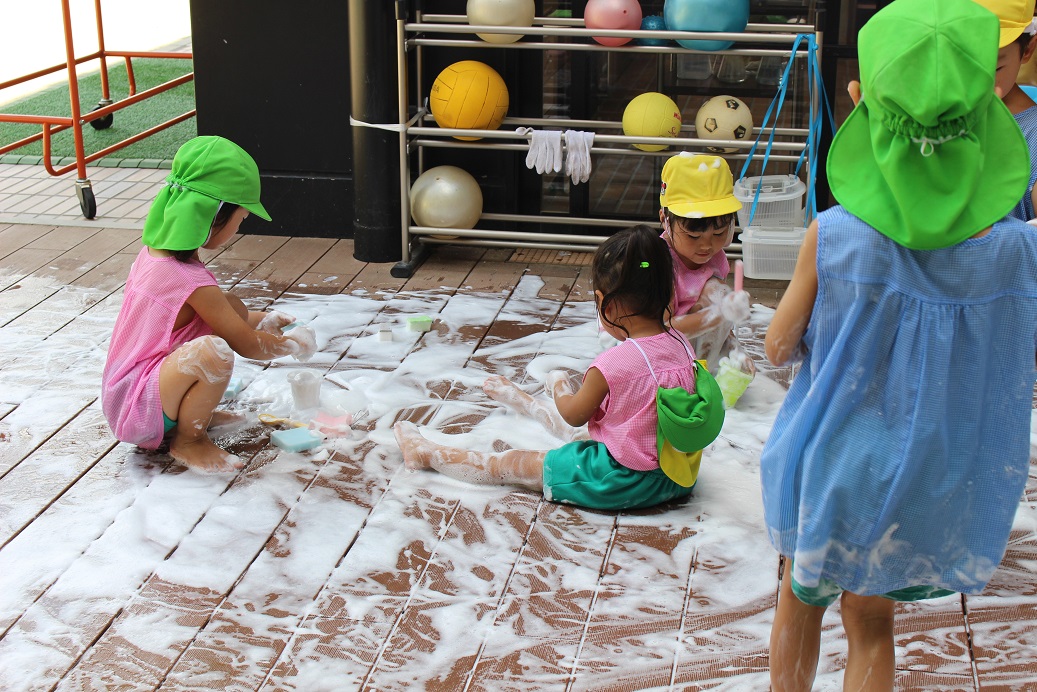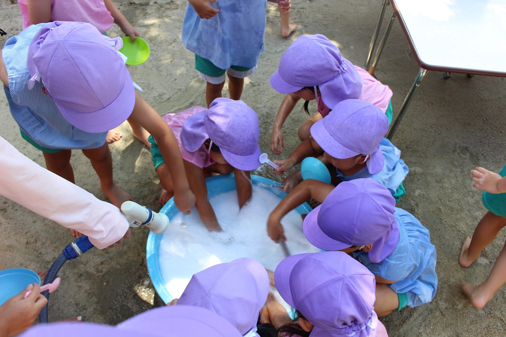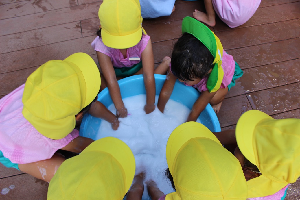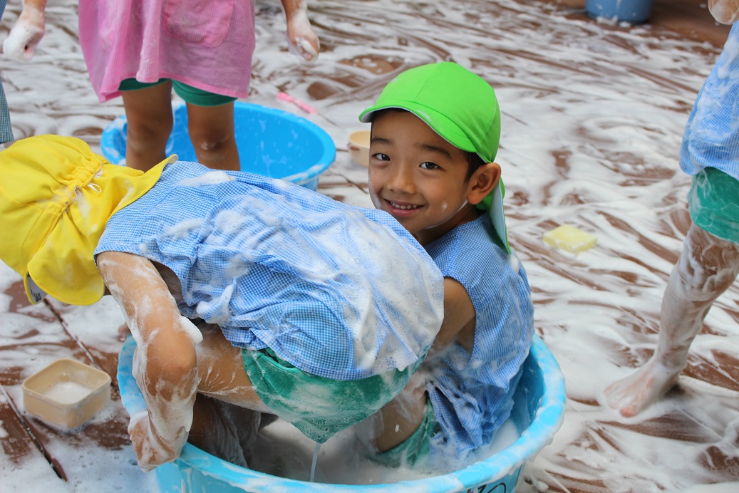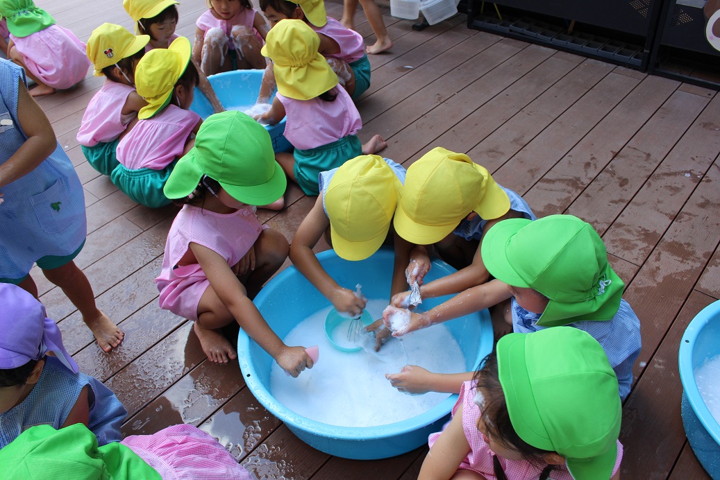 うさぎぐみの子どもたちは、新聞のおふろに入り、シャワーで頭を洗って、