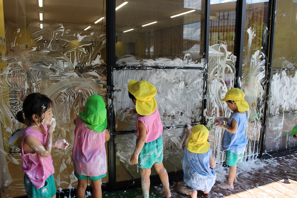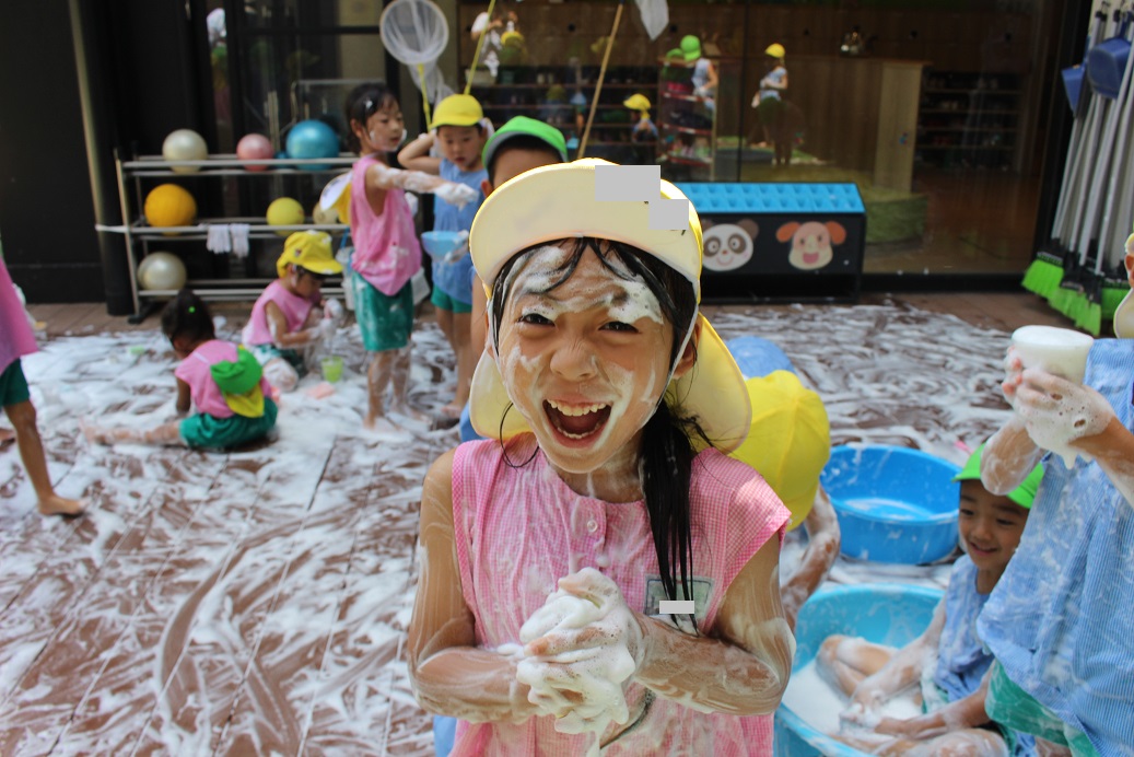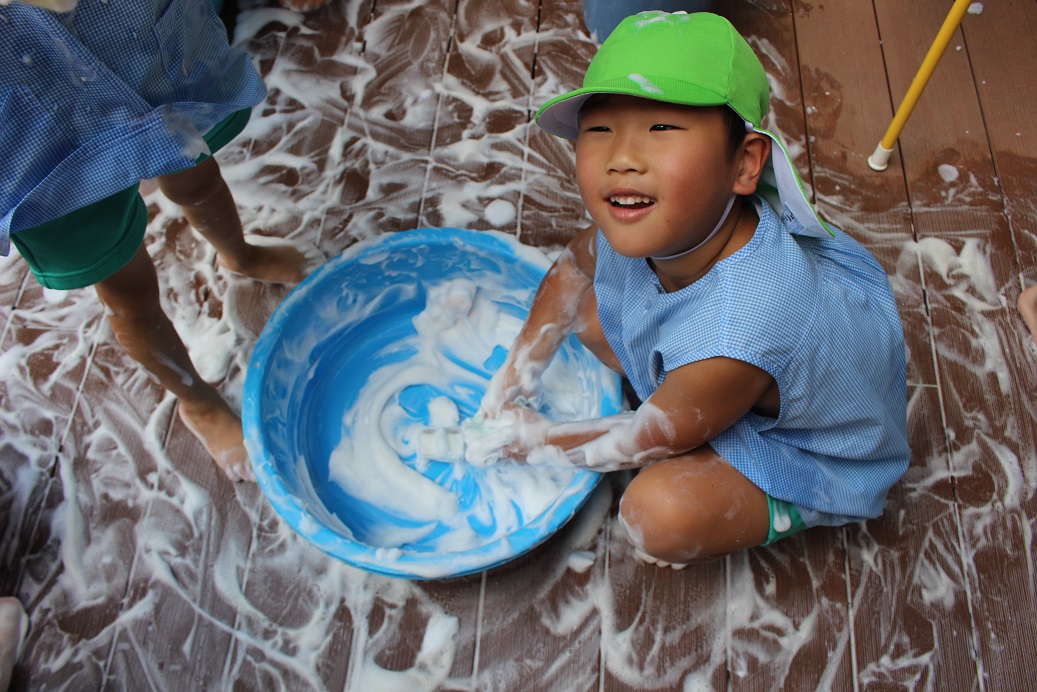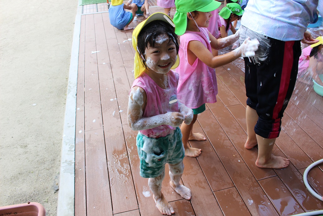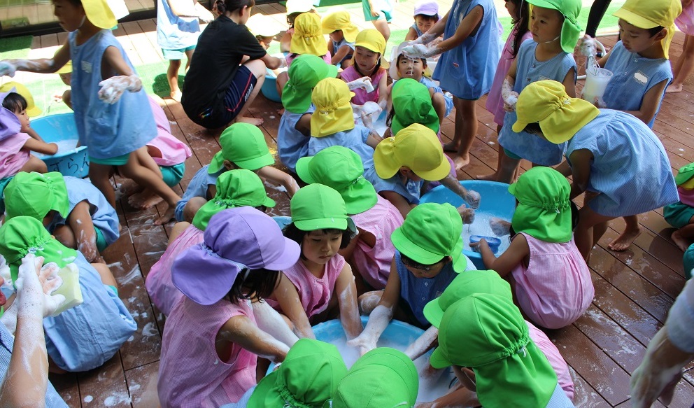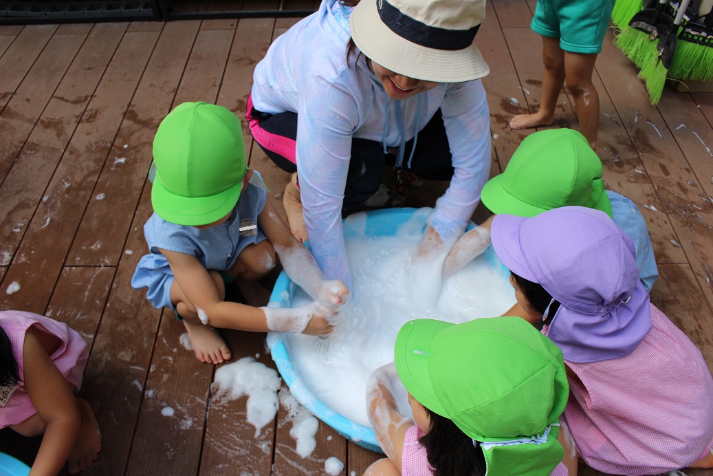 うさぎぐみの子どもたちは、新聞のおふろに入り、シャワーで頭を洗って、