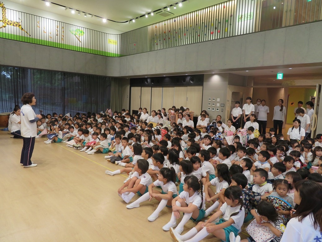 ホールにつくと園長先生から「静かに素早く避難ができて