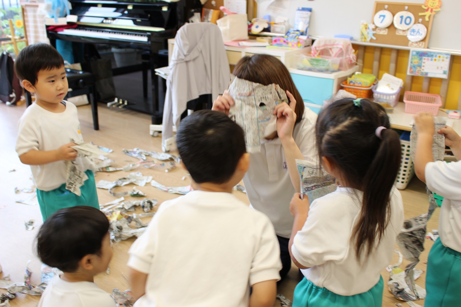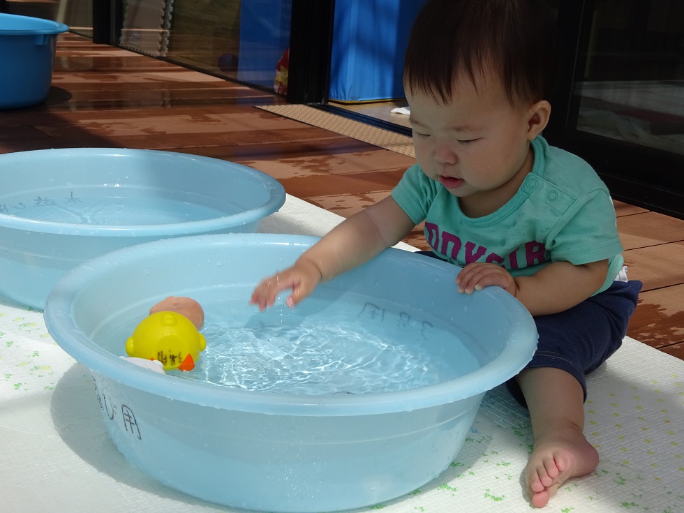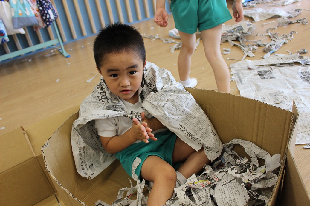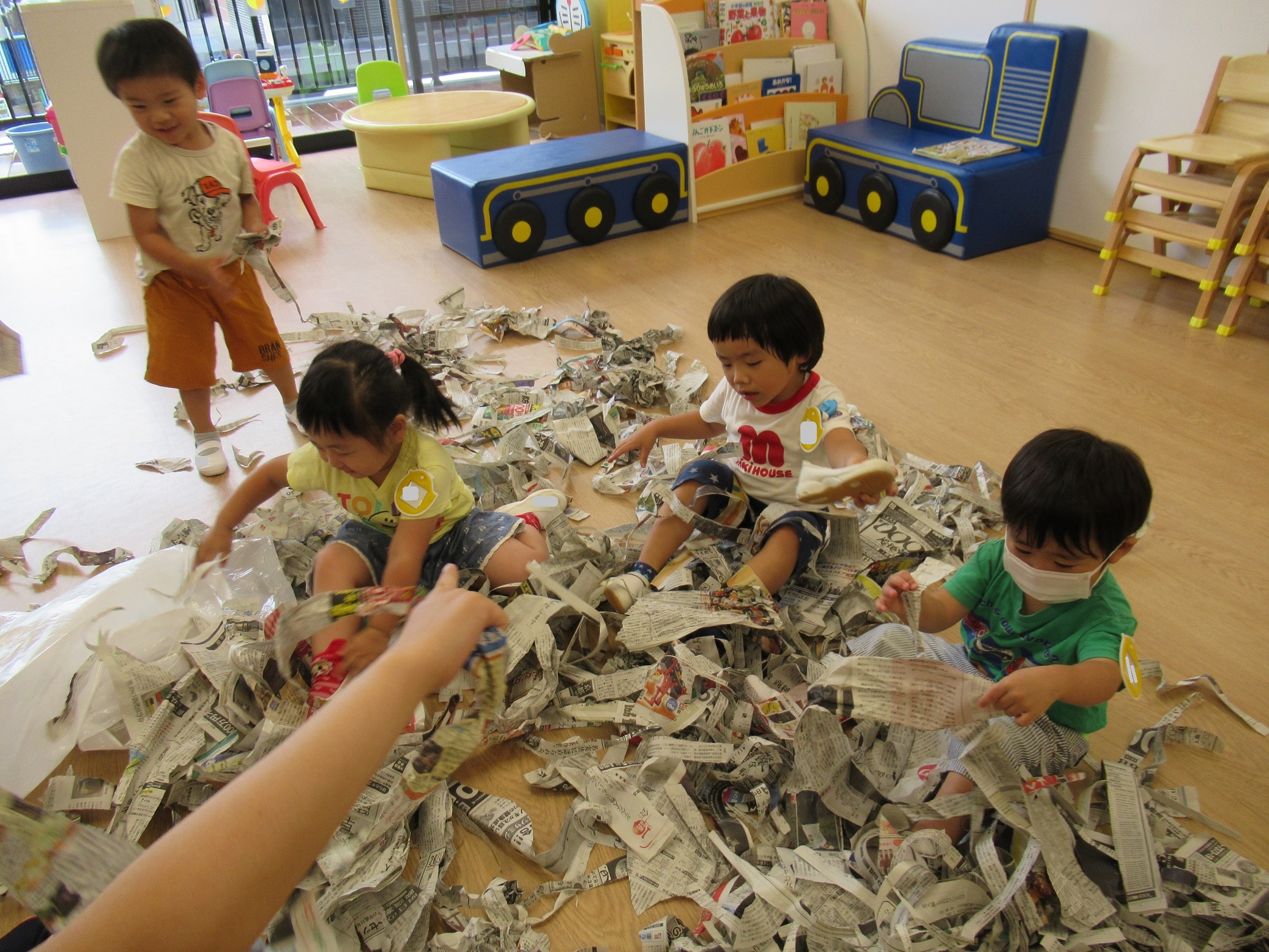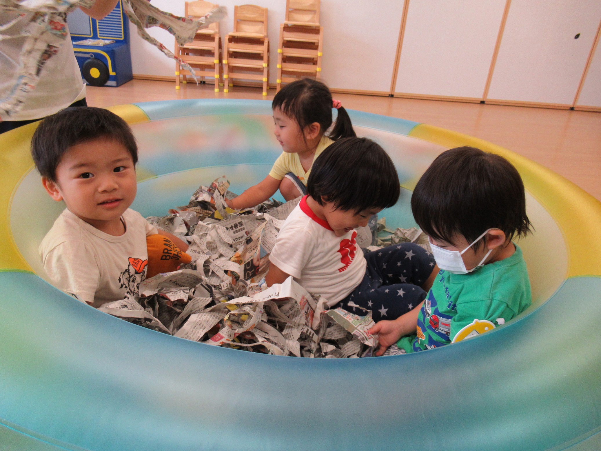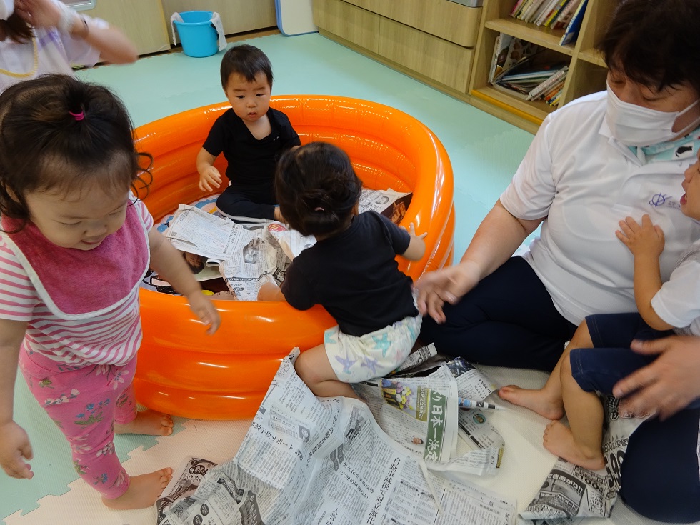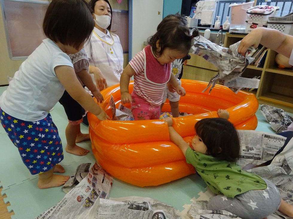 新聞をビリビリ破り、たくさん遊んだあとはプールの中へ♪