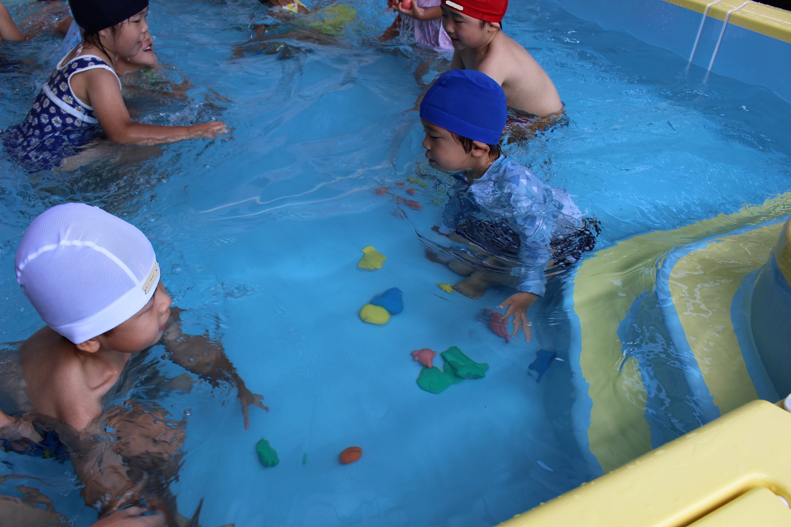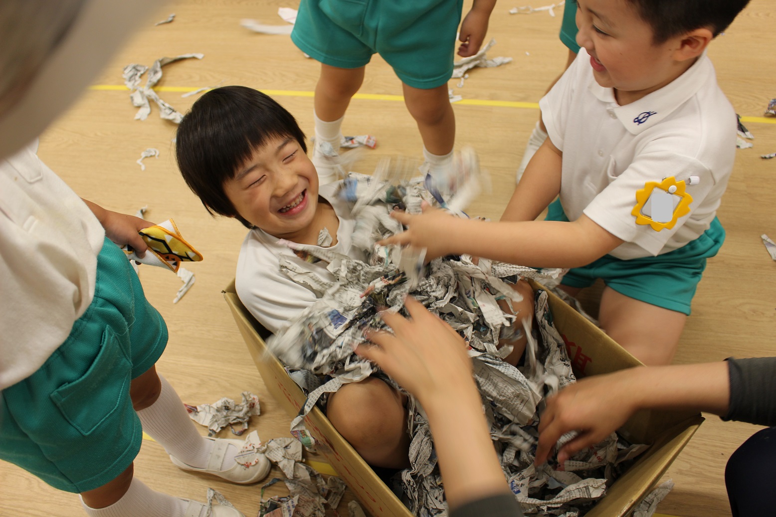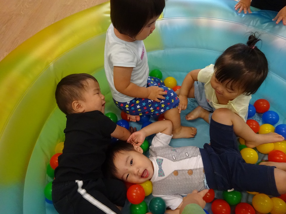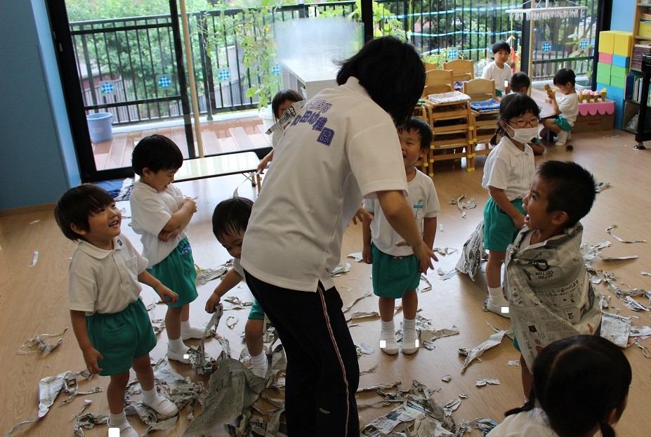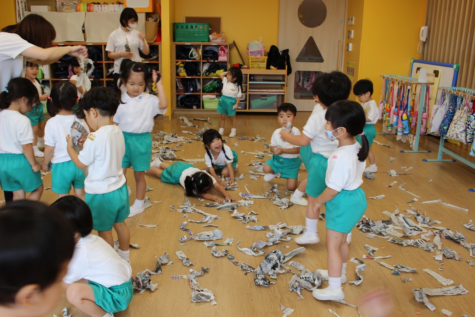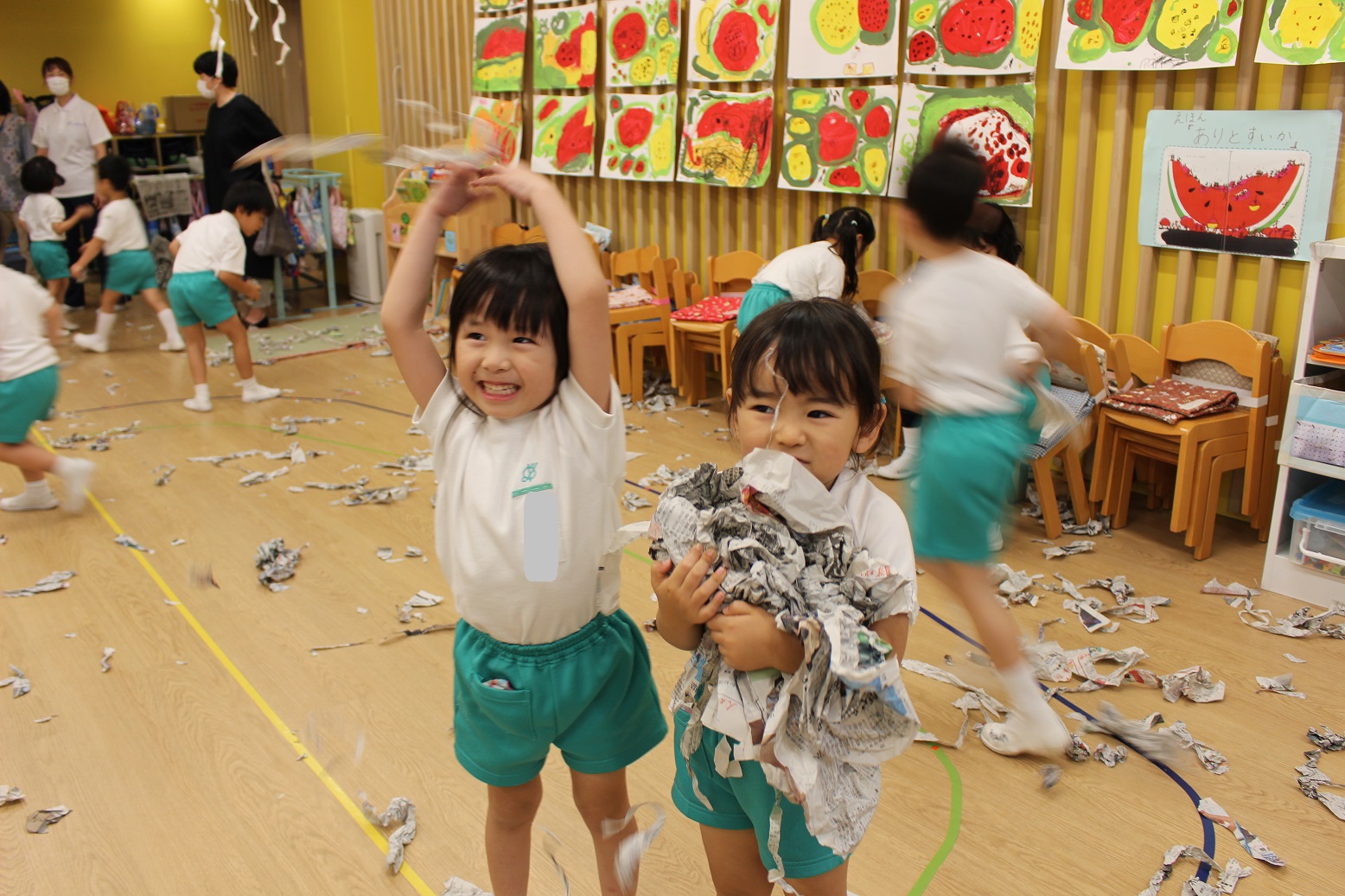 新聞をビリビリ破り、たくさん遊んだあとはプールの中へ♪