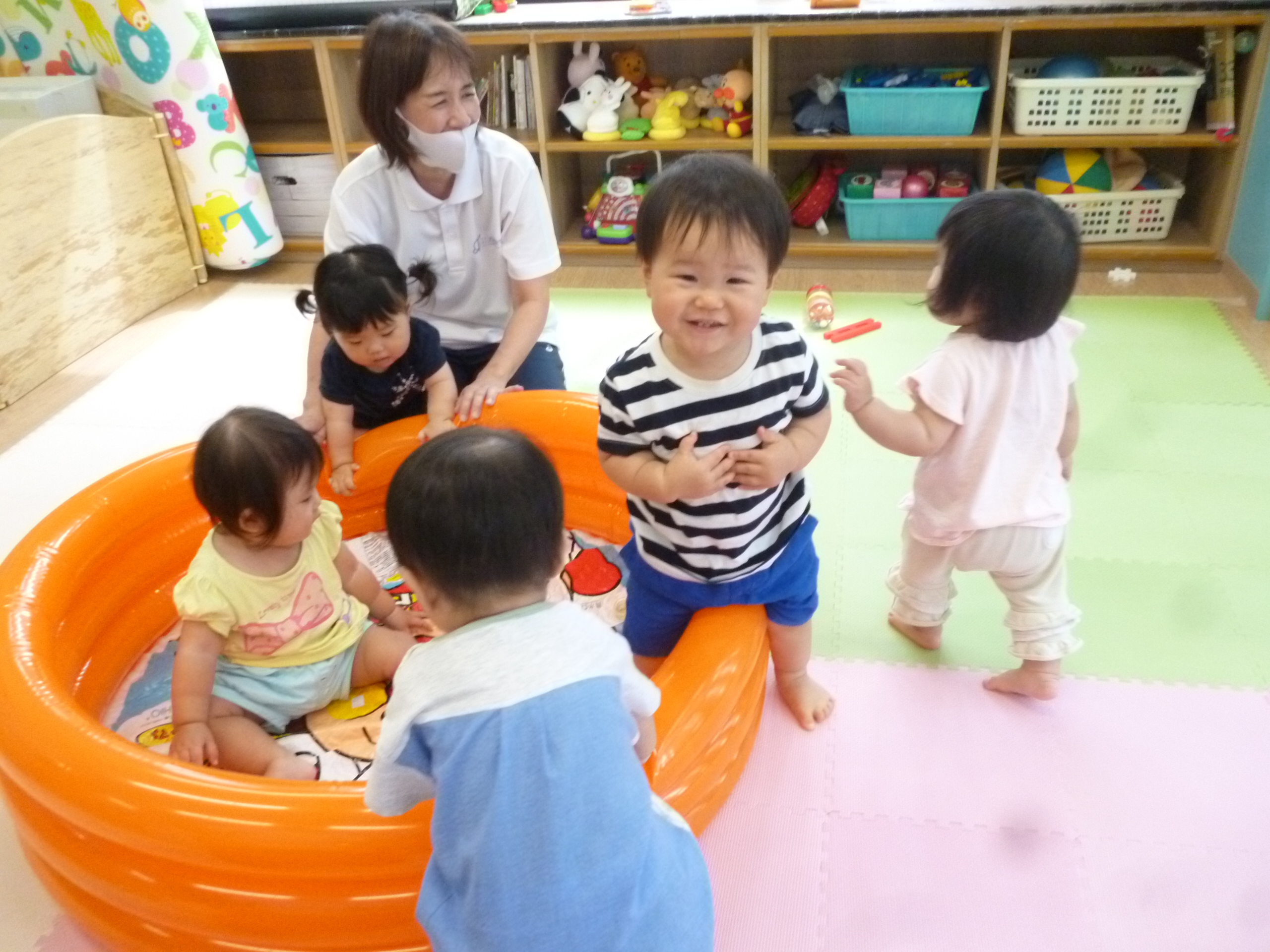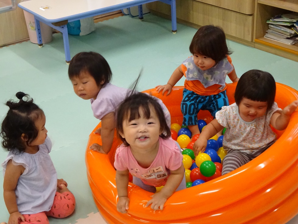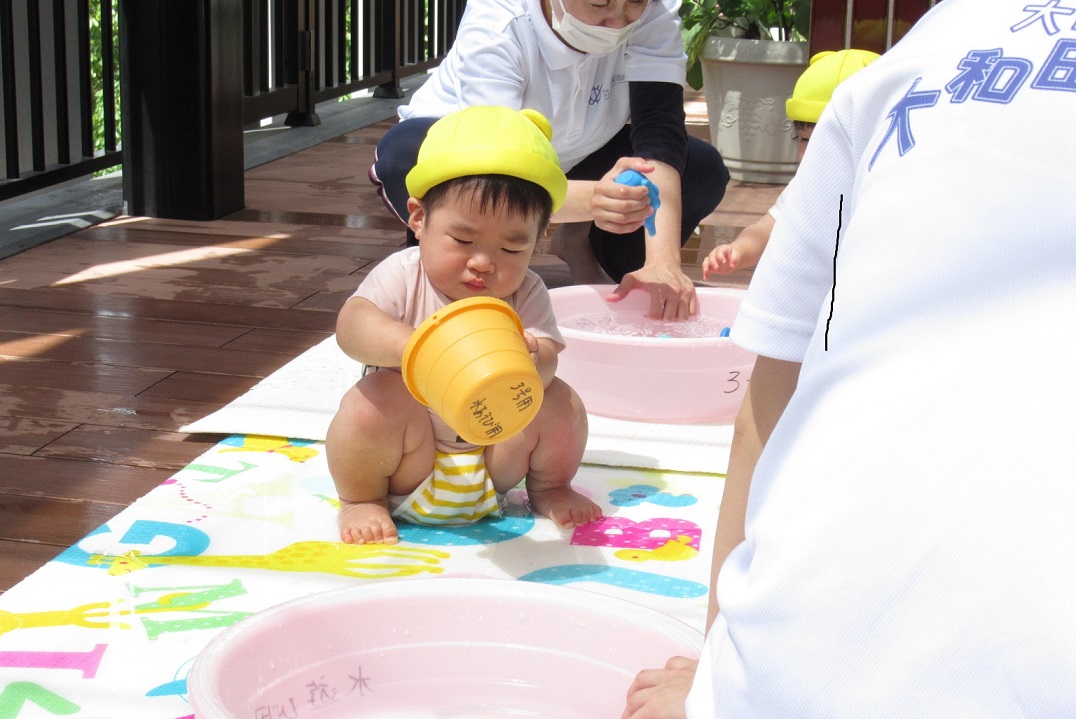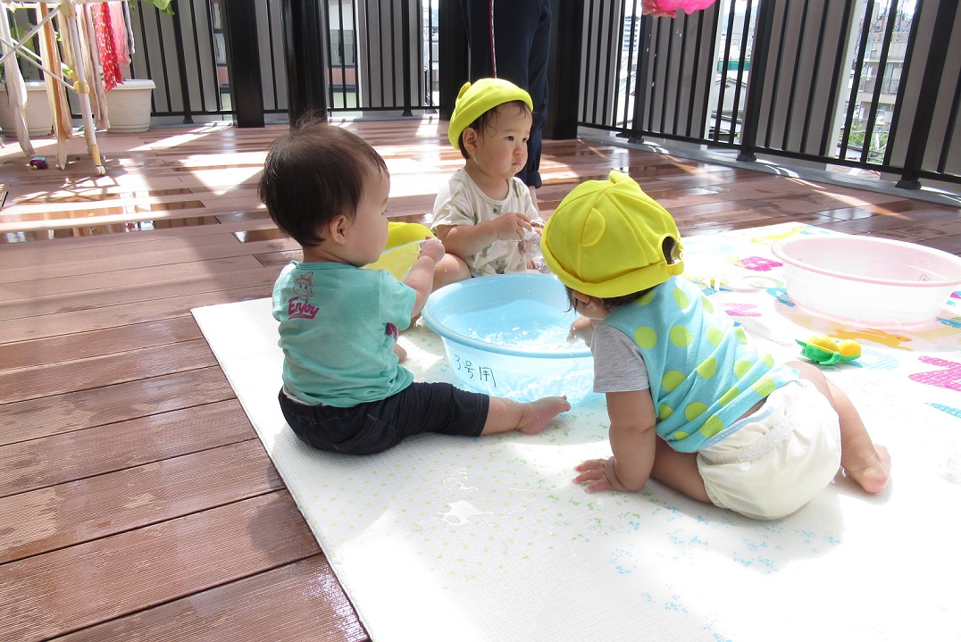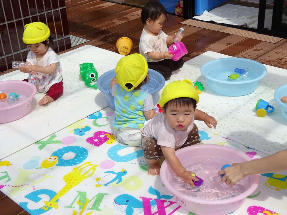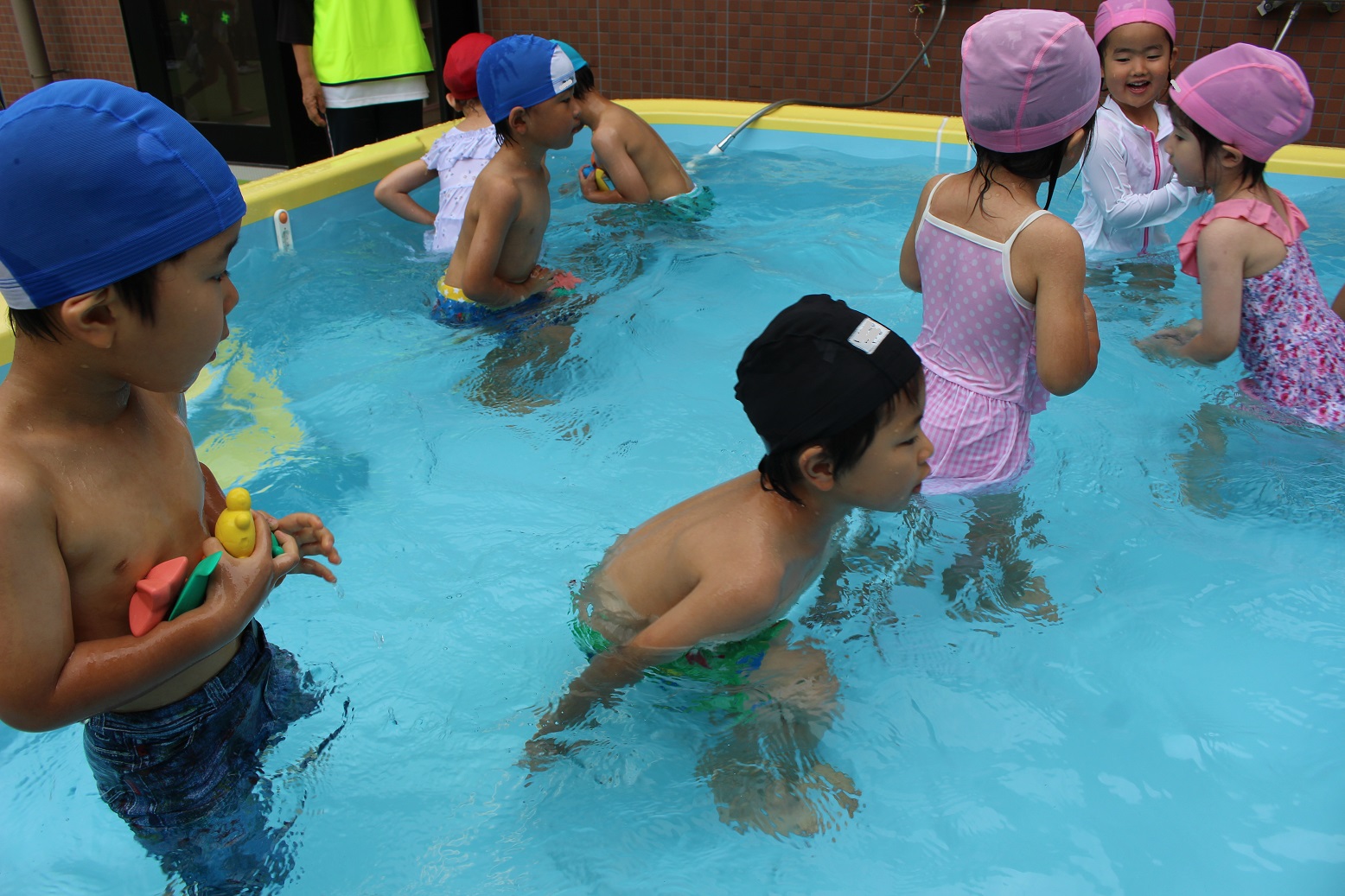 新聞をビリビリ破り、たくさん遊んだあとはプールの中へ♪