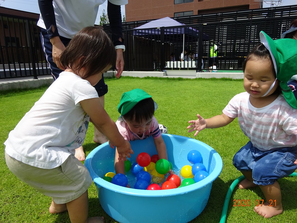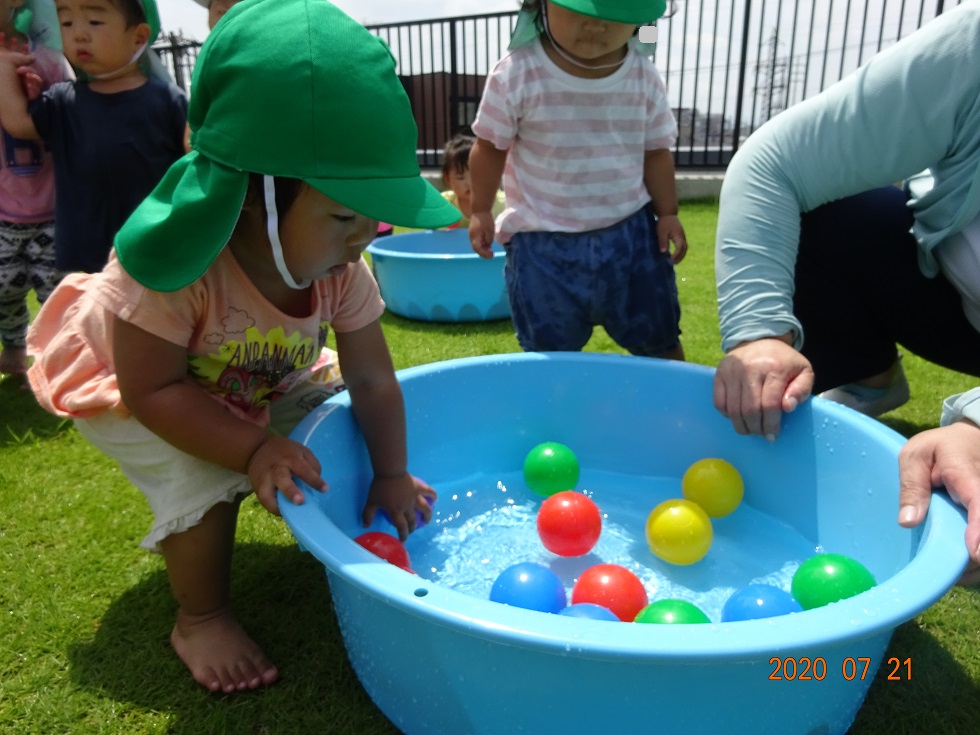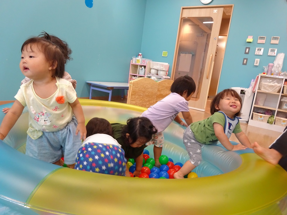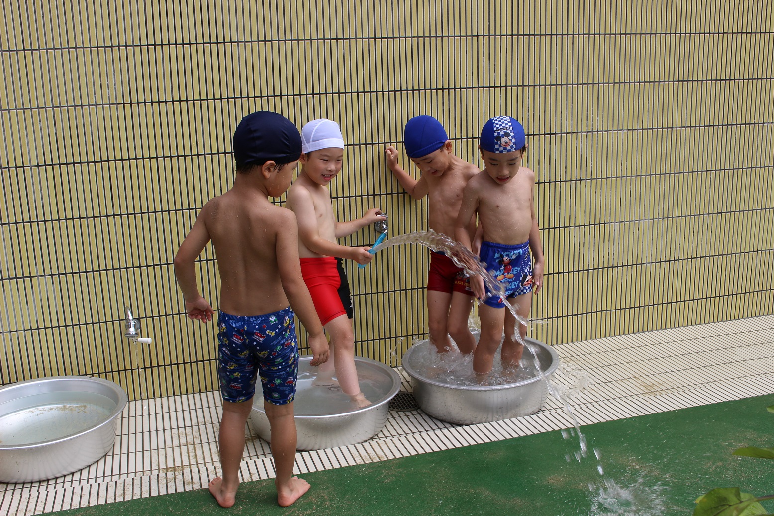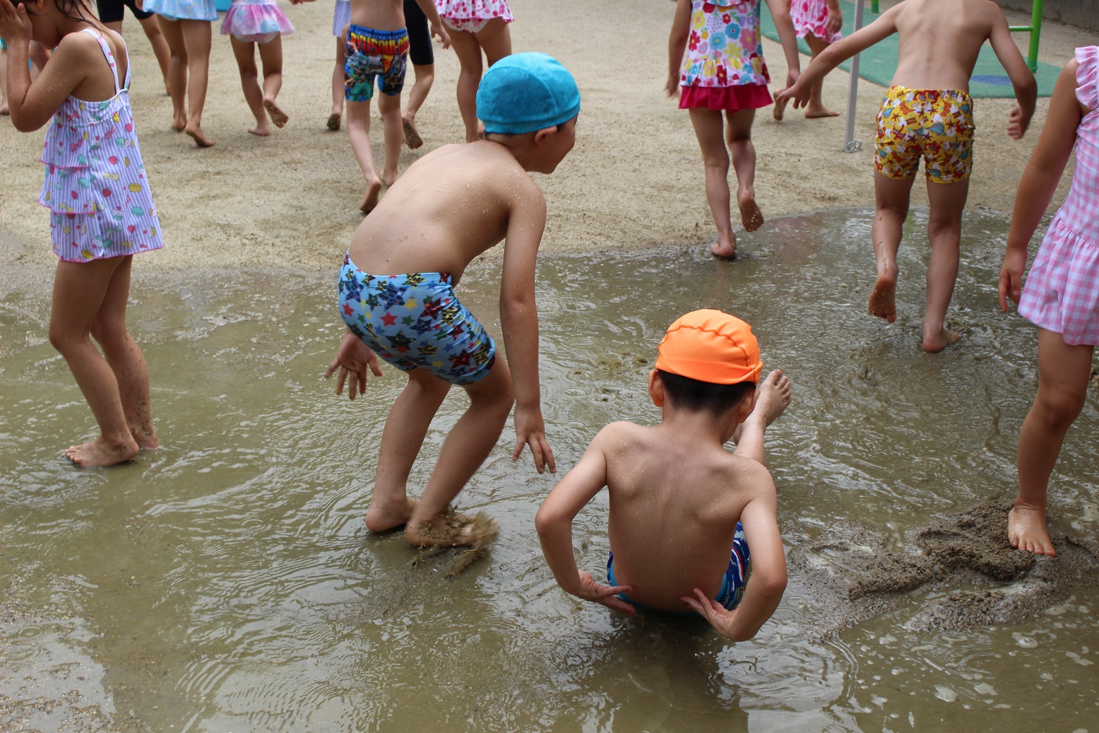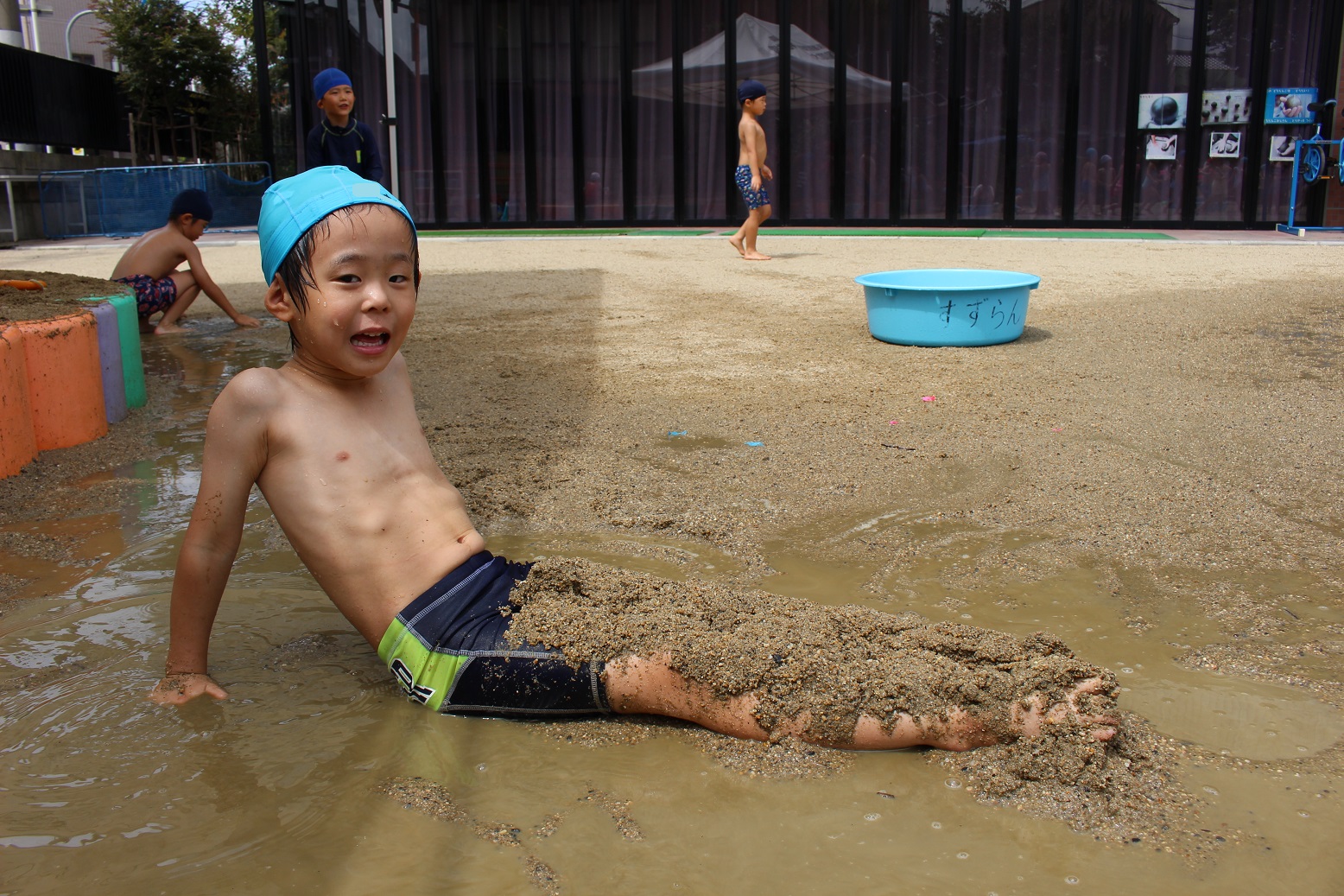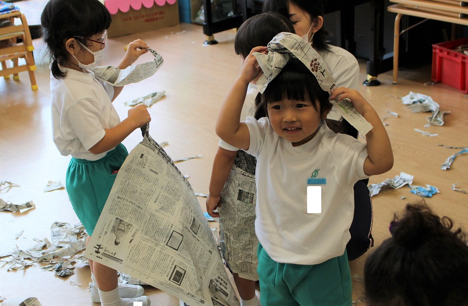 新聞をビリビリ破り、たくさん遊んだあとはプールの中へ♪