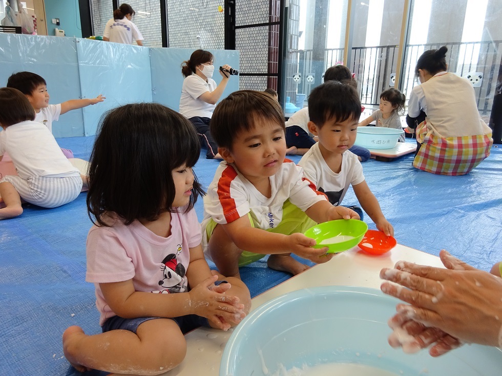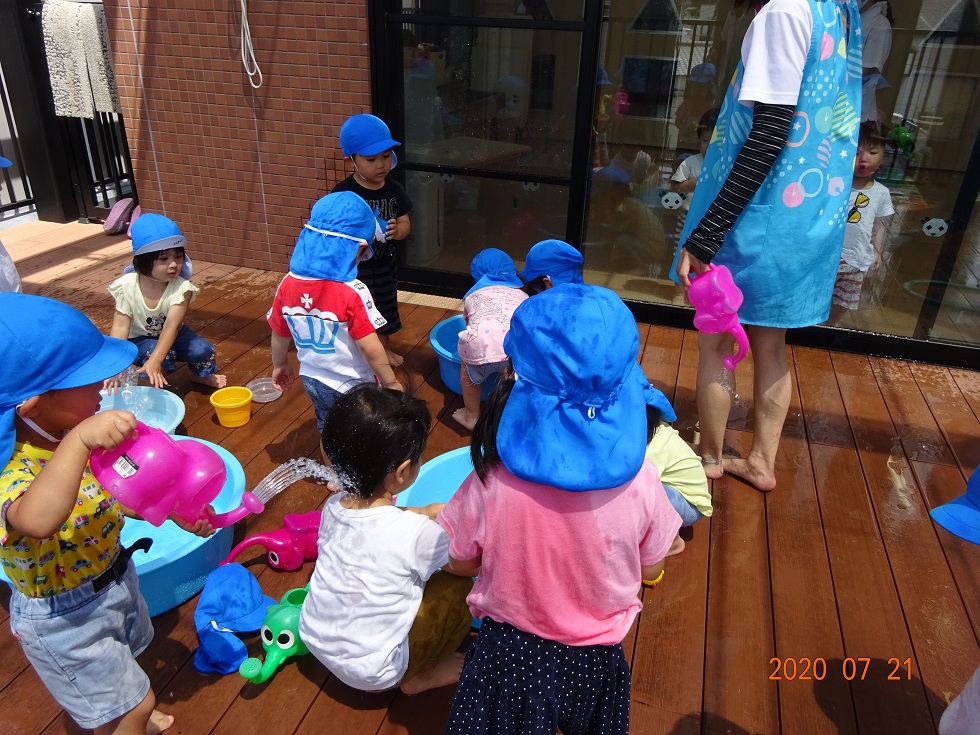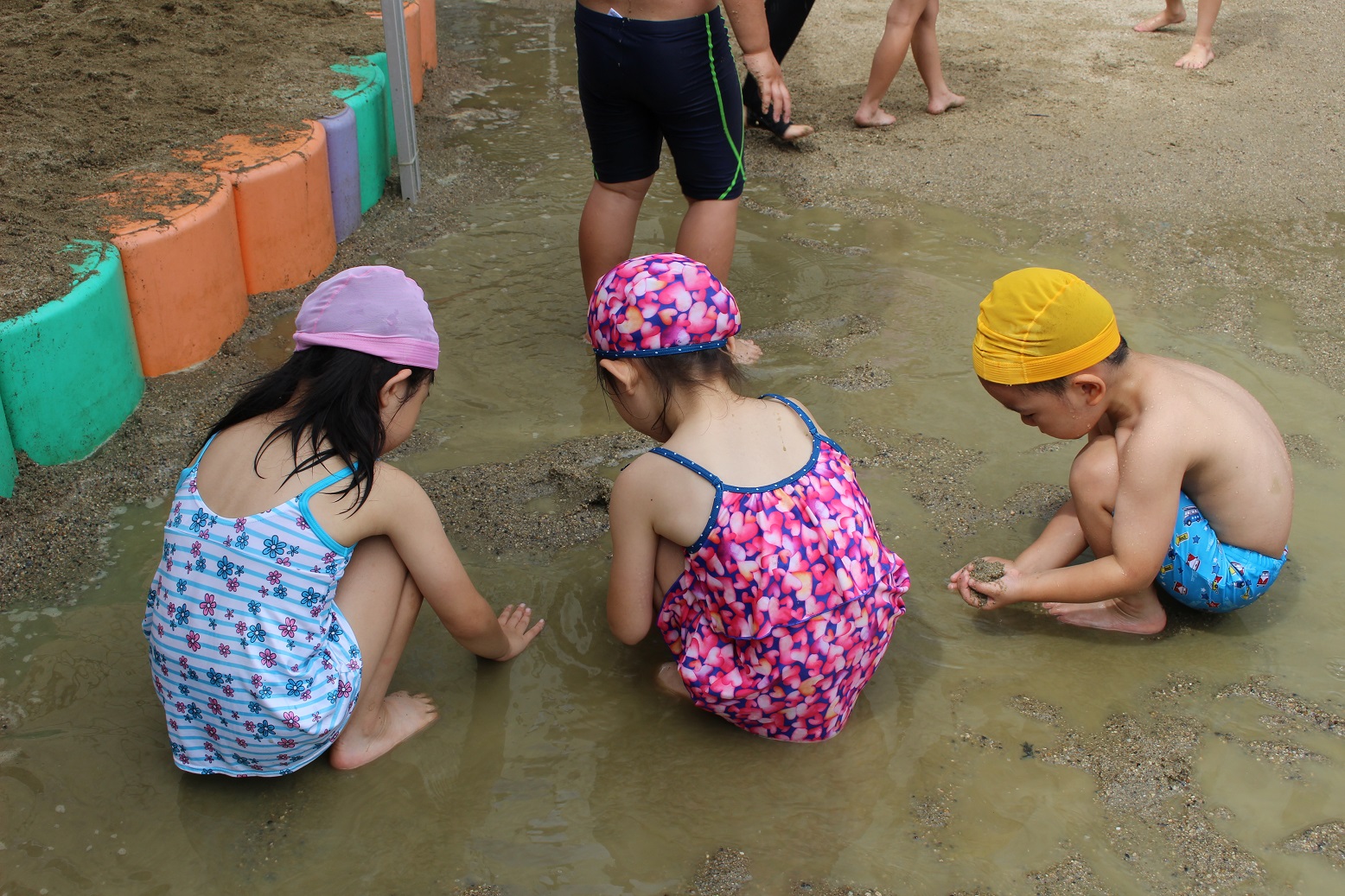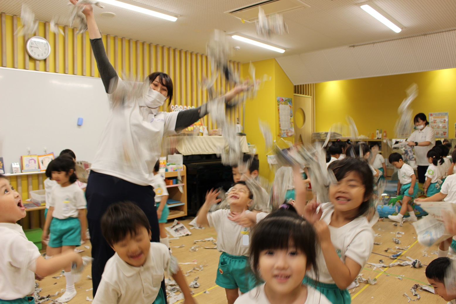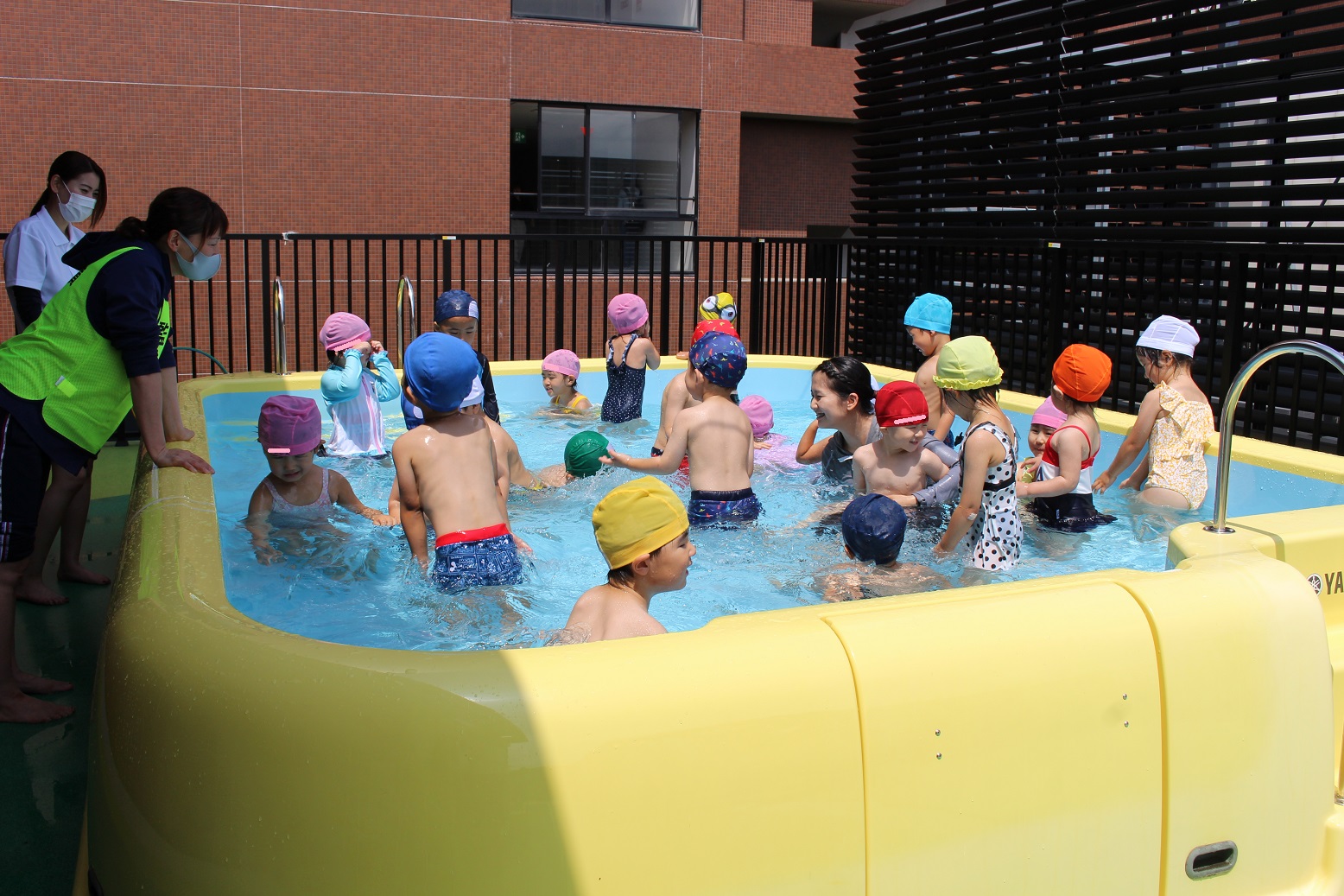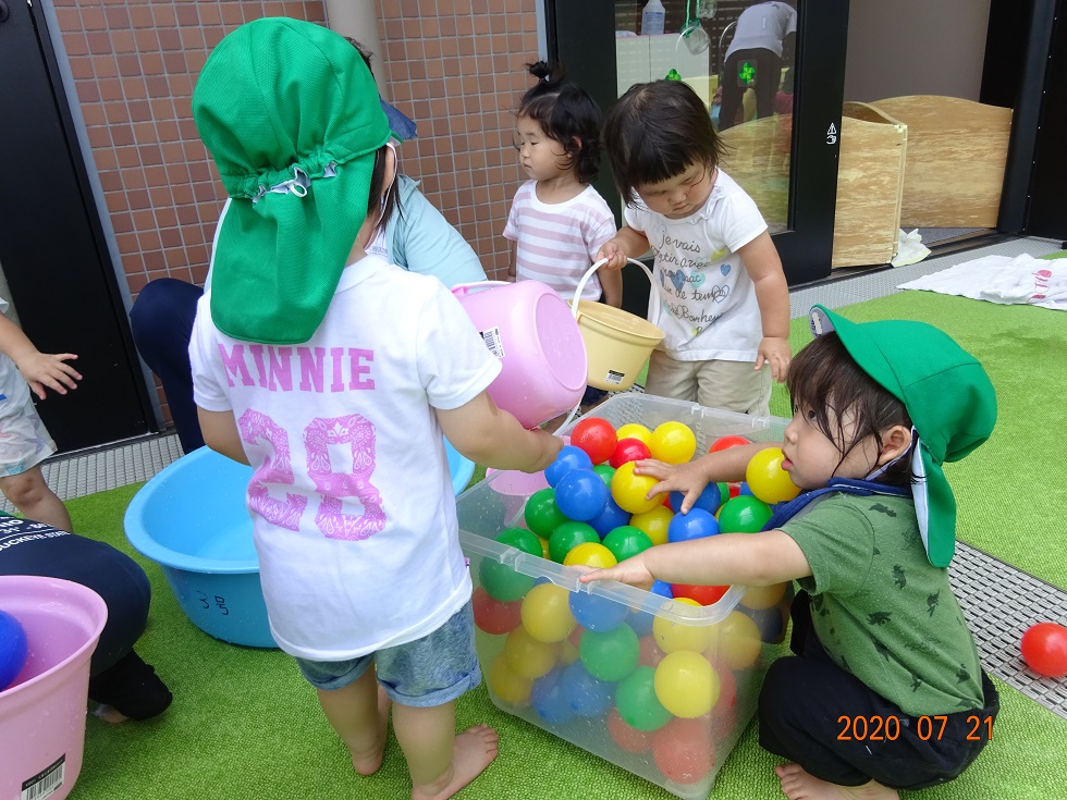 新聞をビリビリ破り、たくさん遊んだあとはプールの中へ♪
