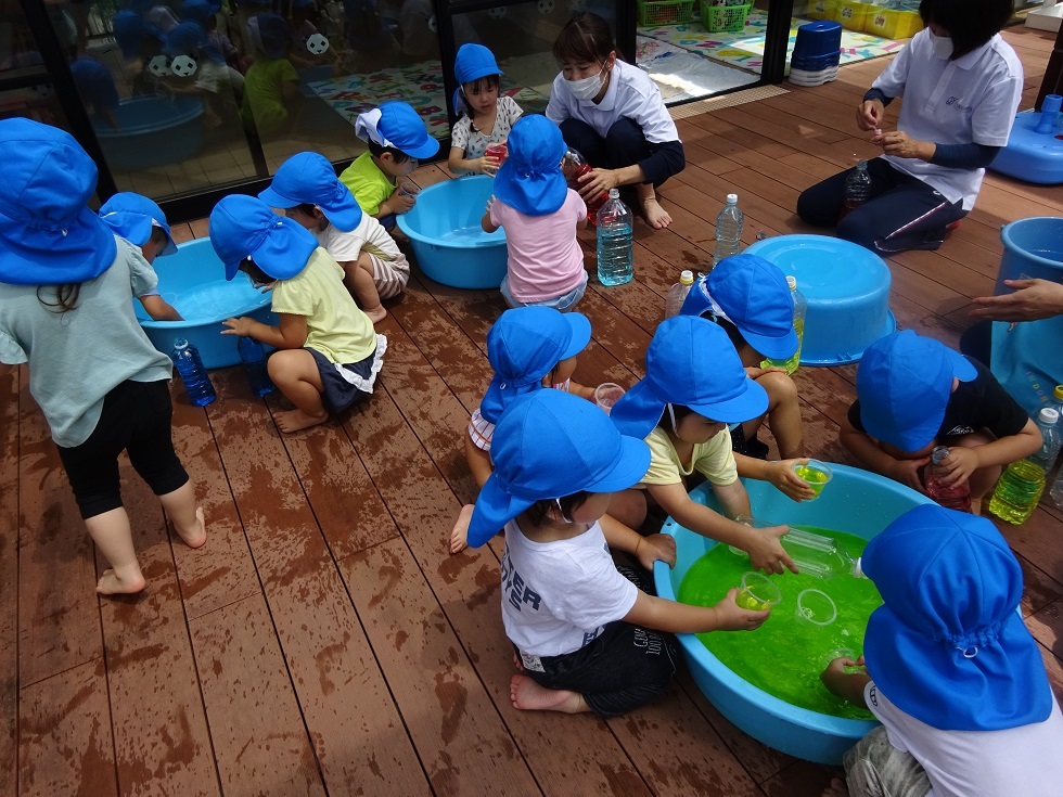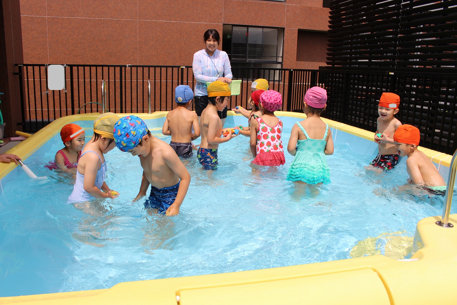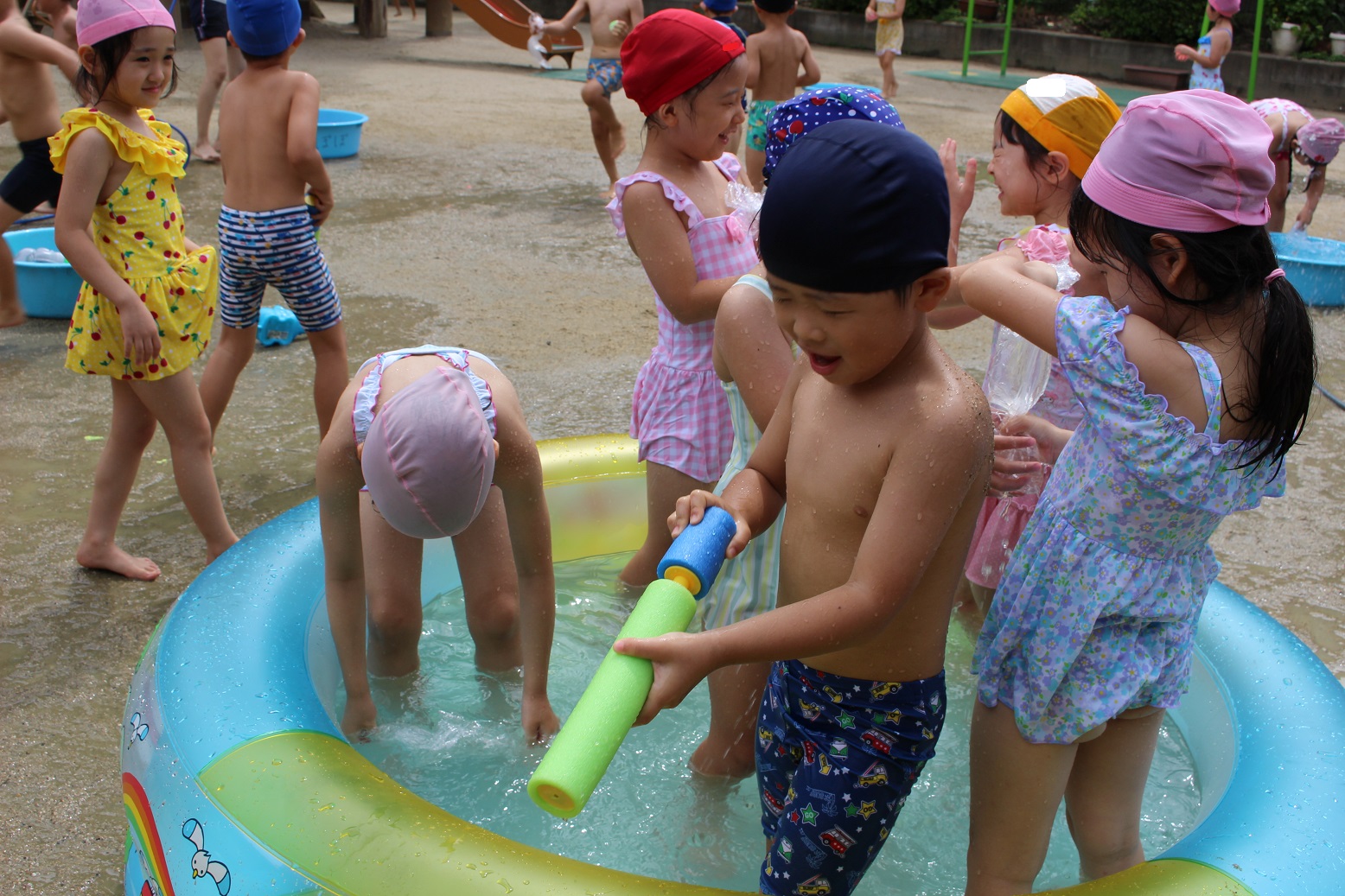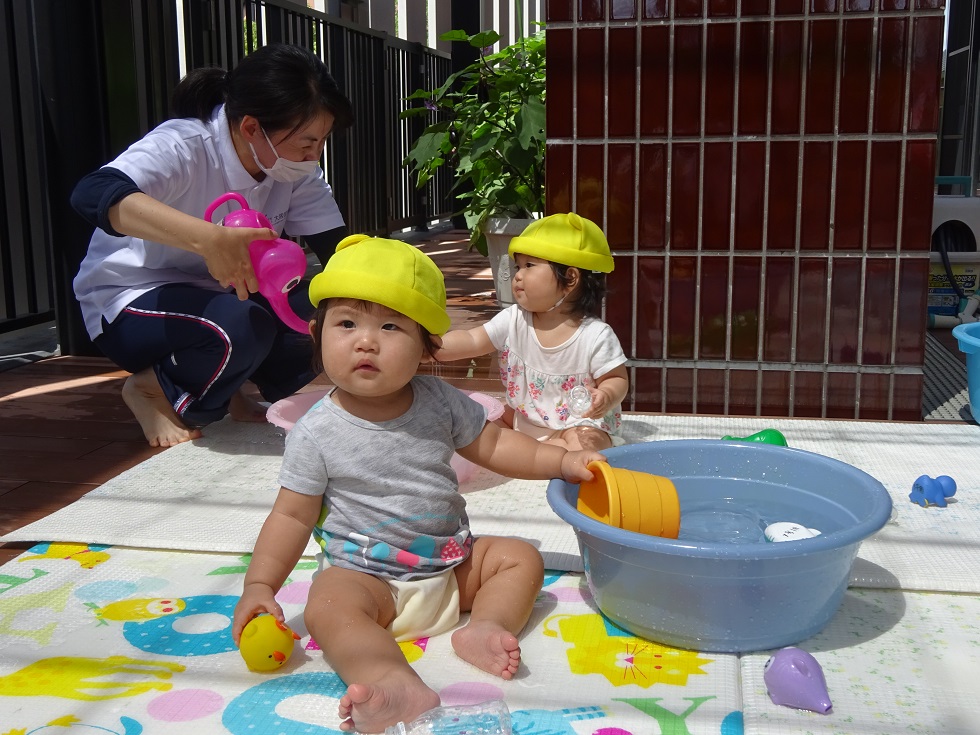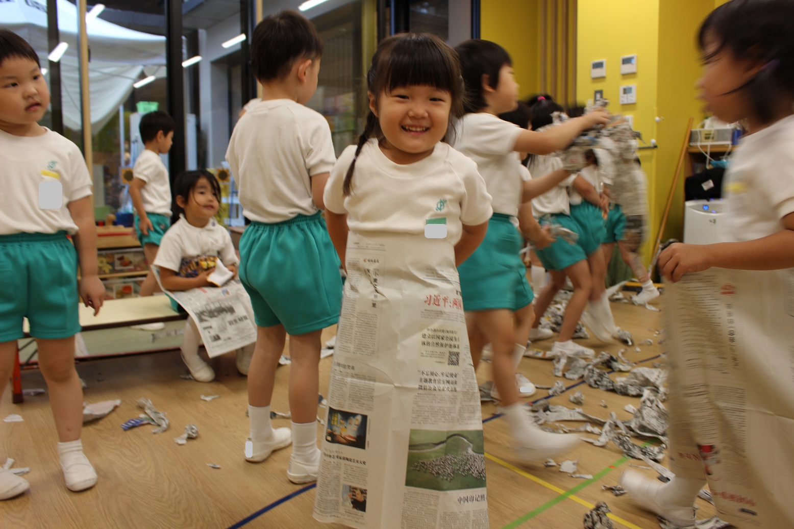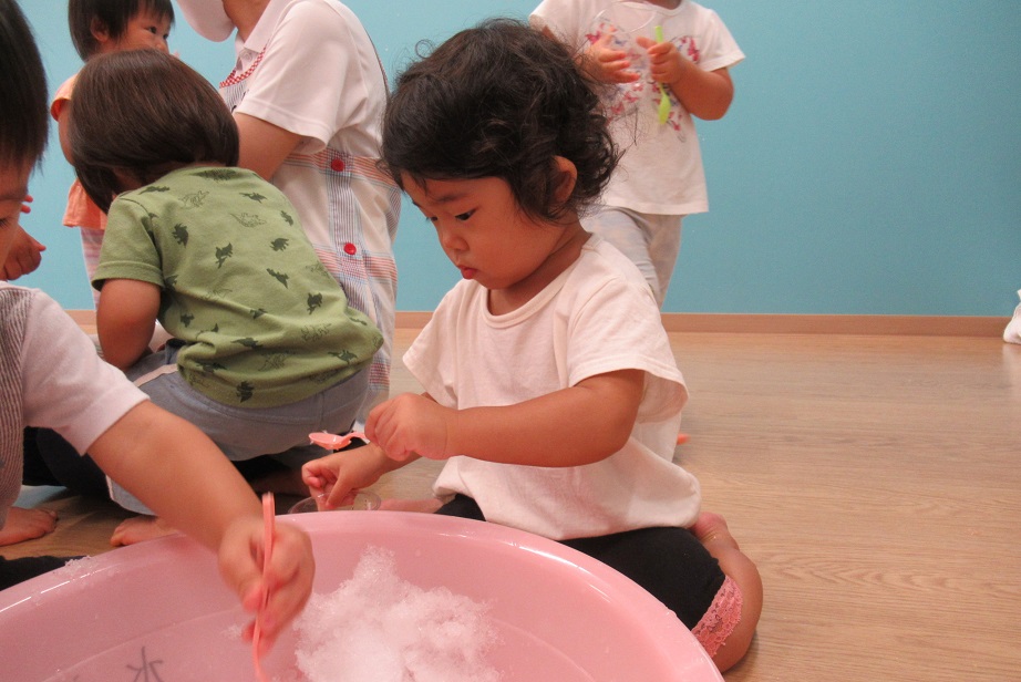 新聞をビリビリ破り、たくさん遊んだあとはプールの中へ♪