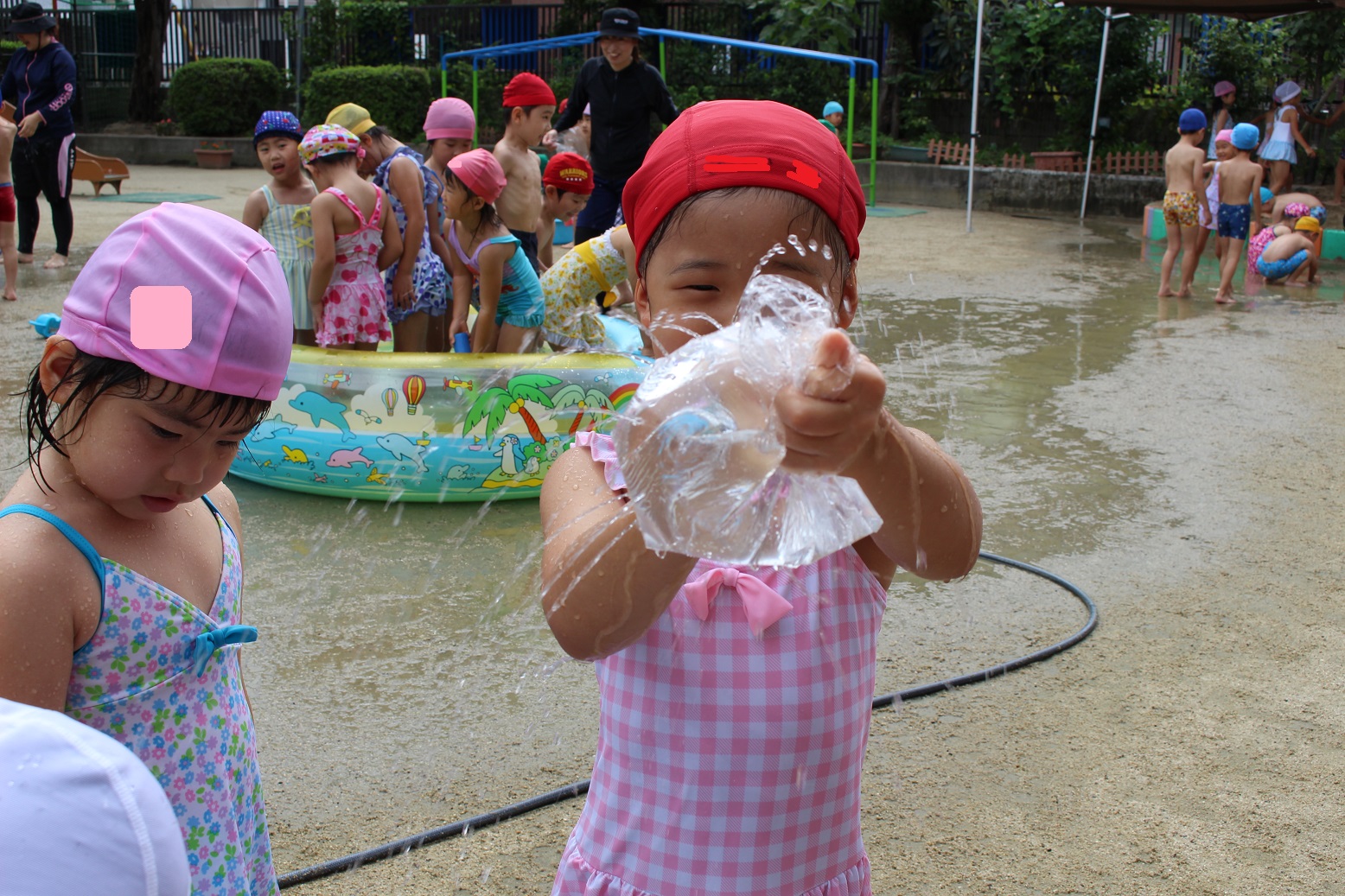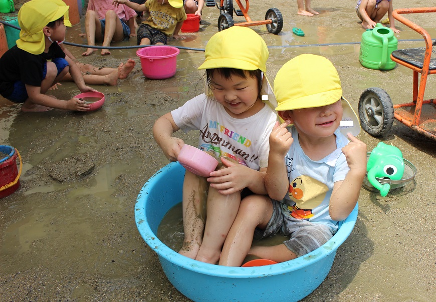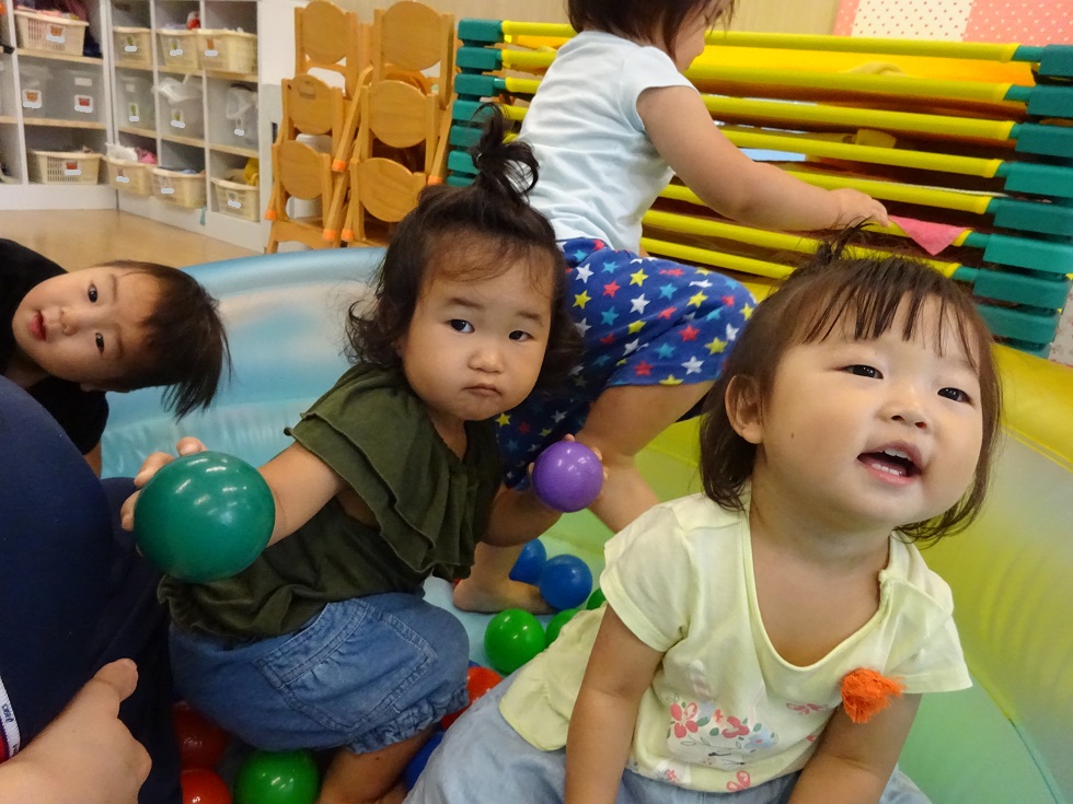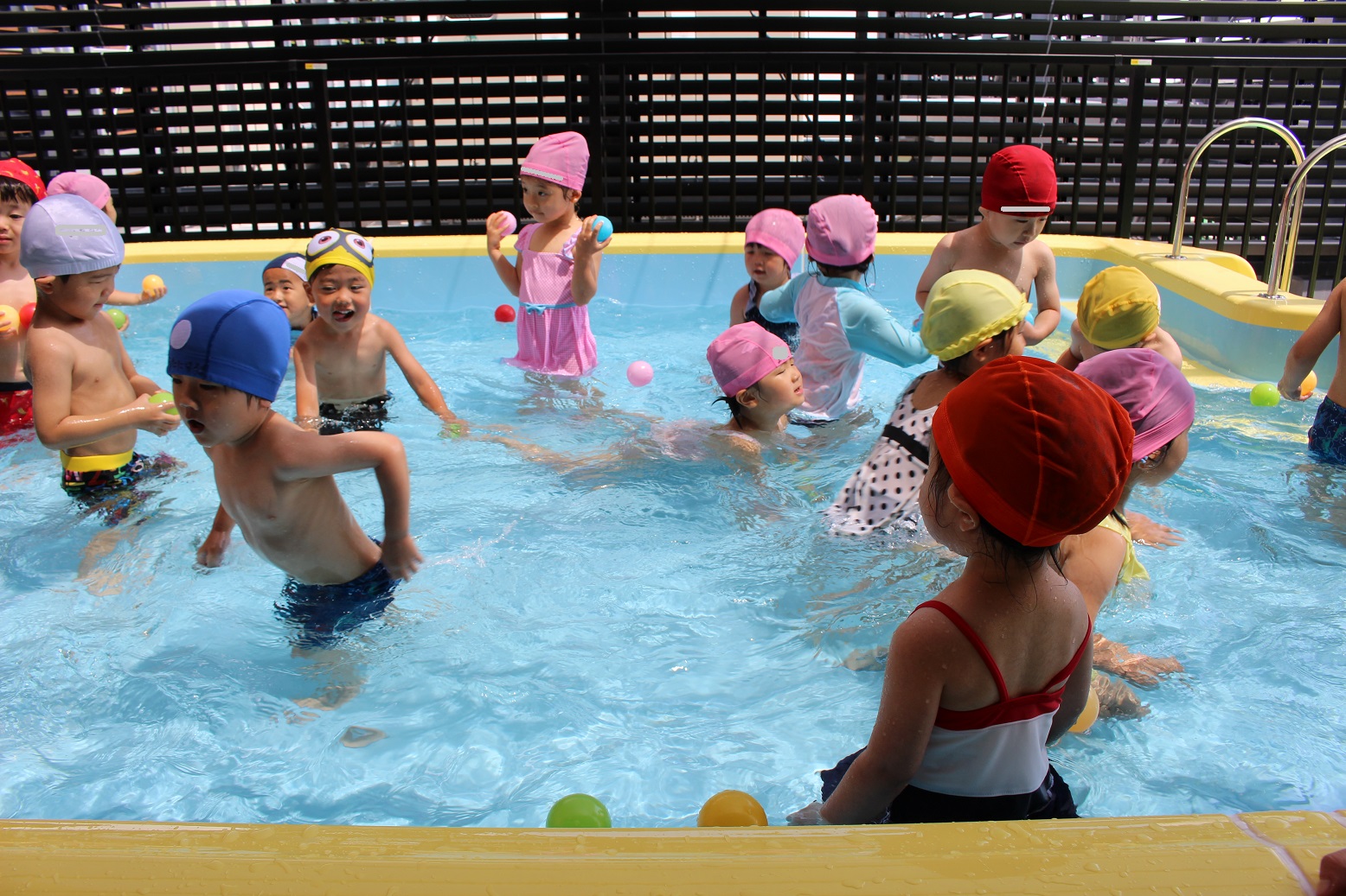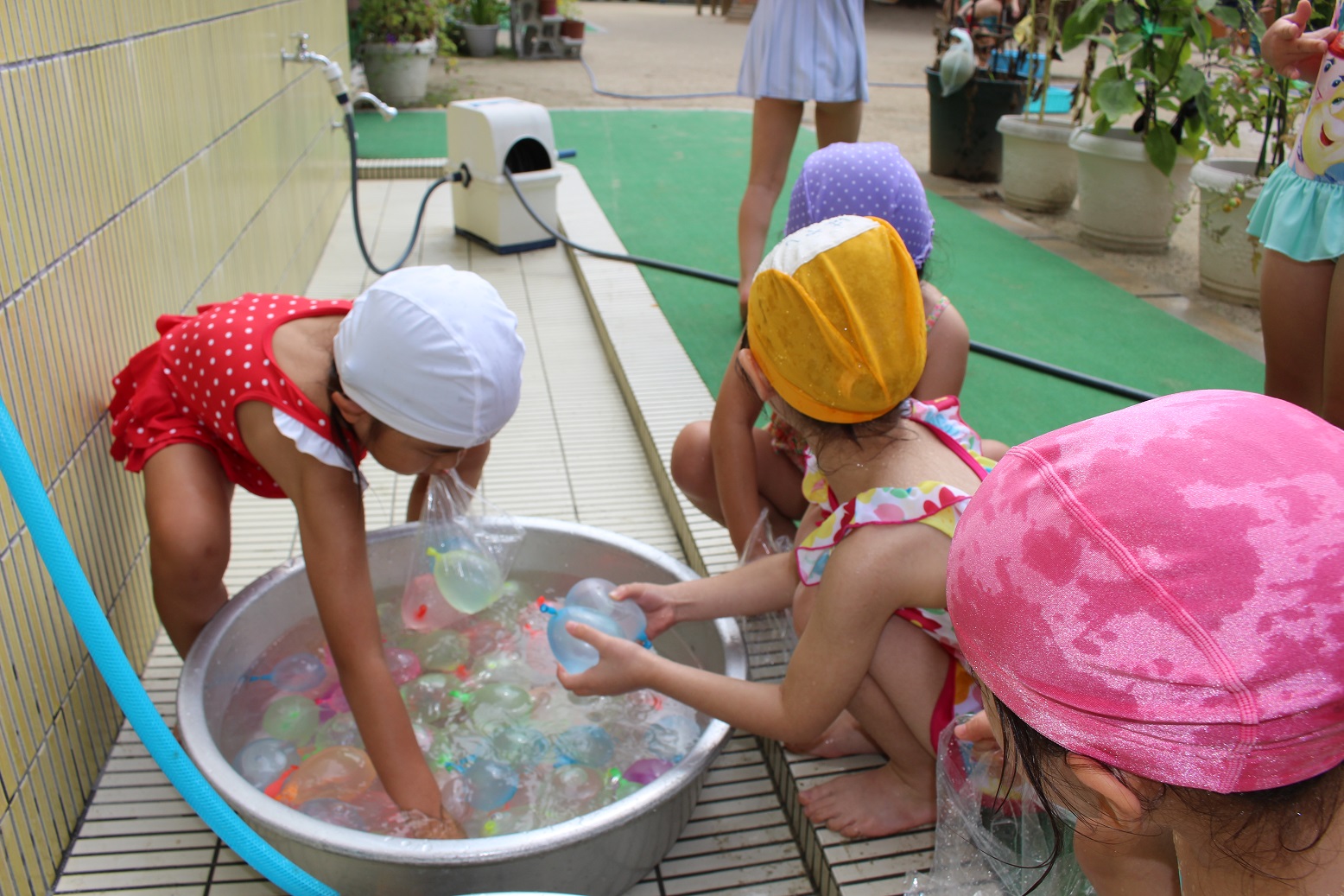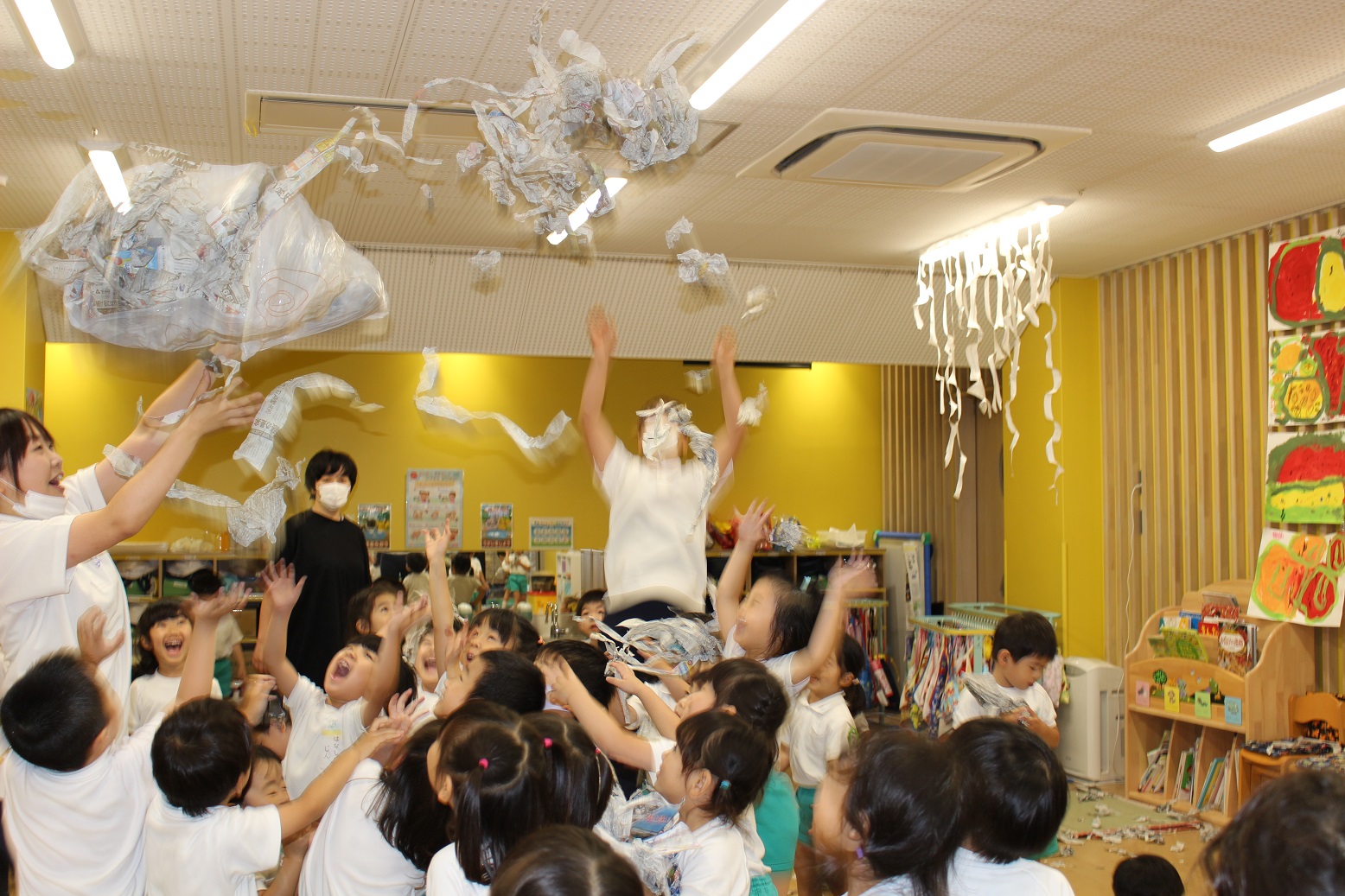 新聞をビリビリ破り、たくさん遊んだあとはプールの中へ♪
