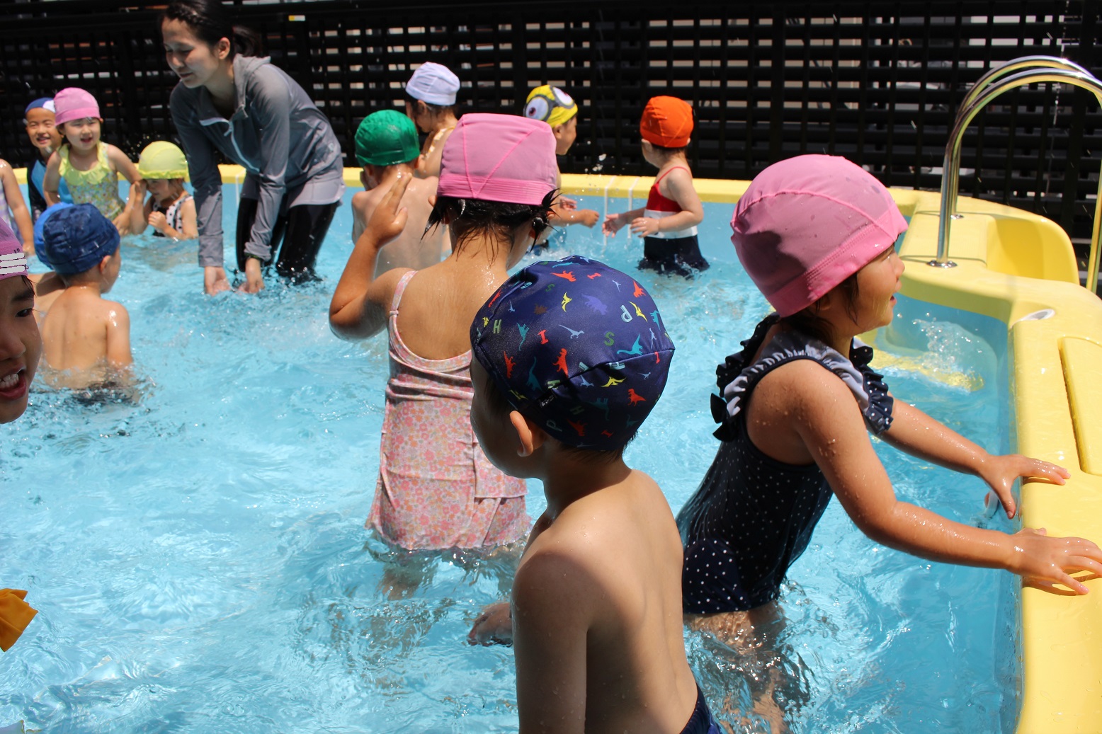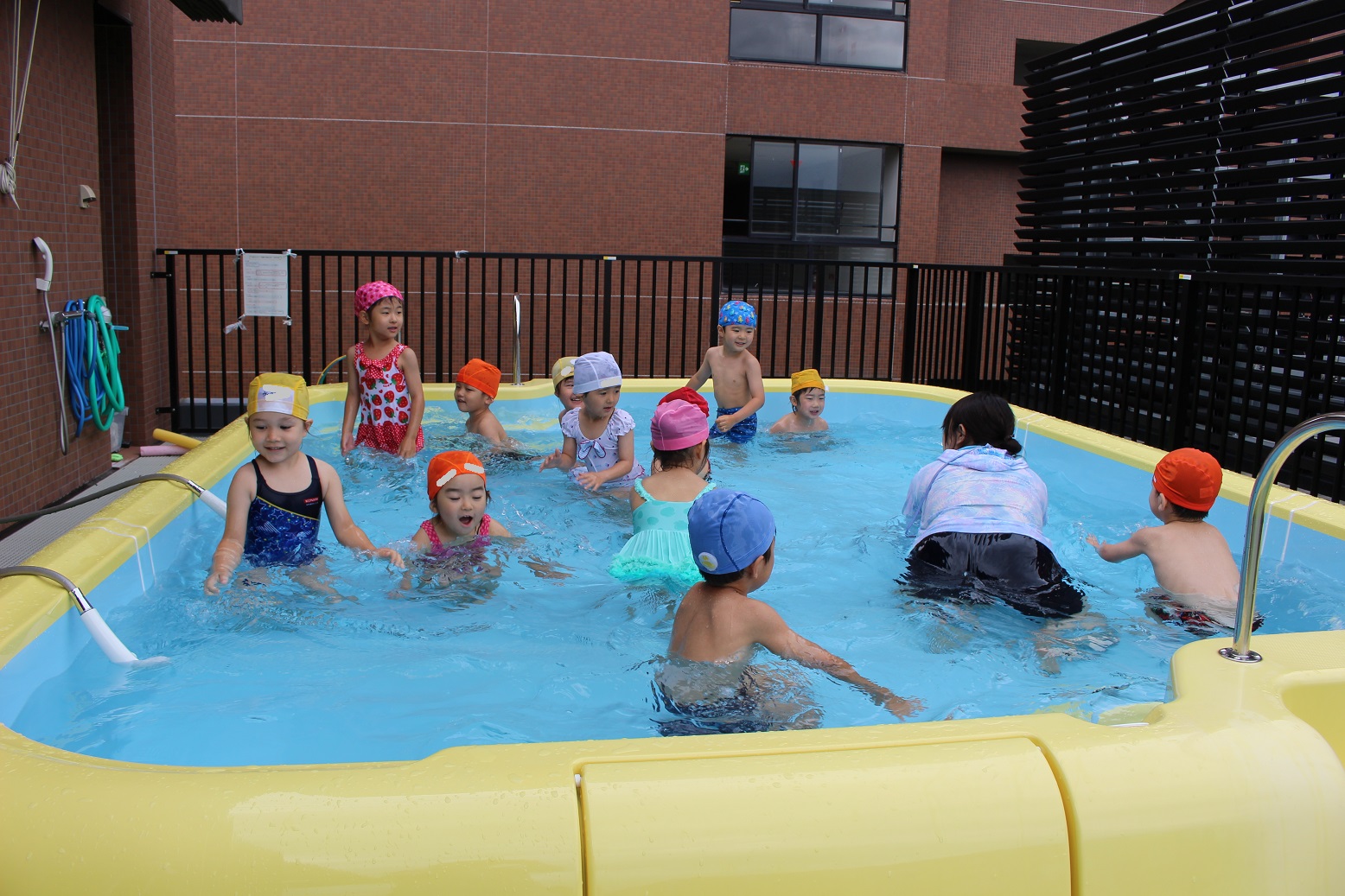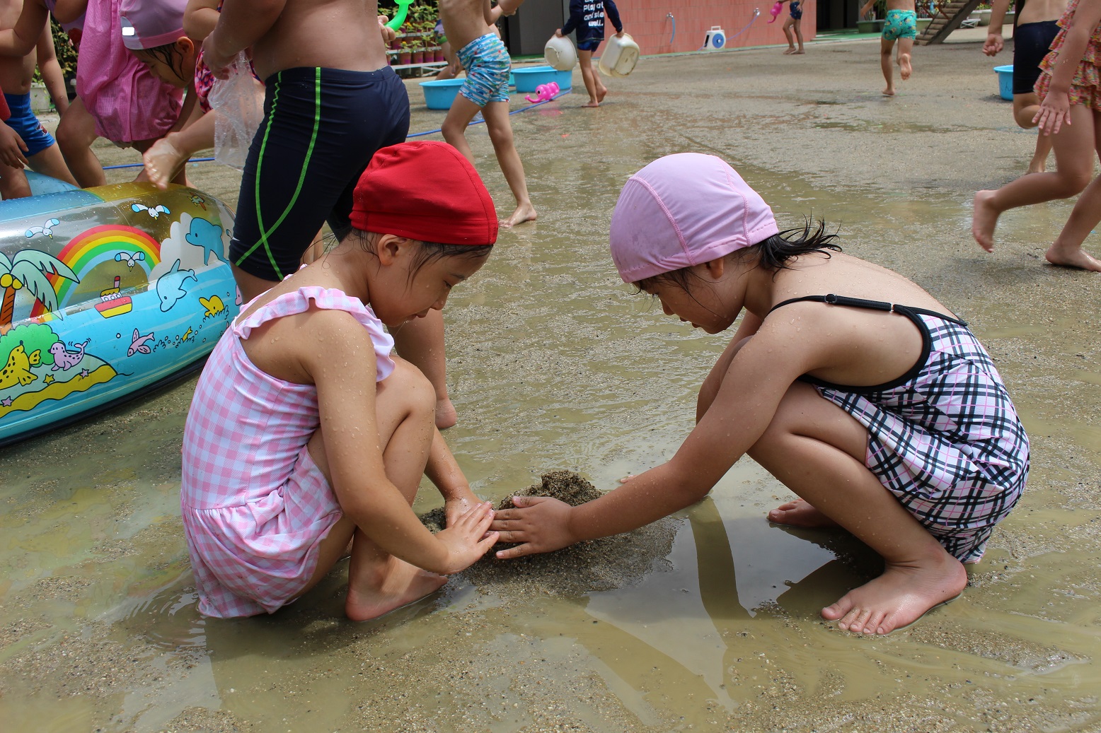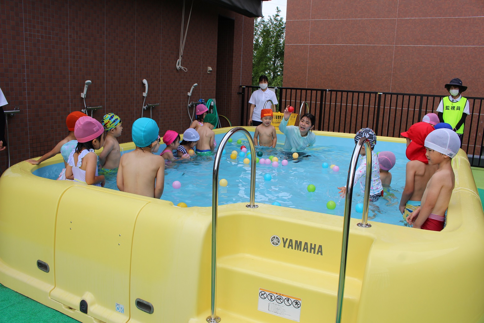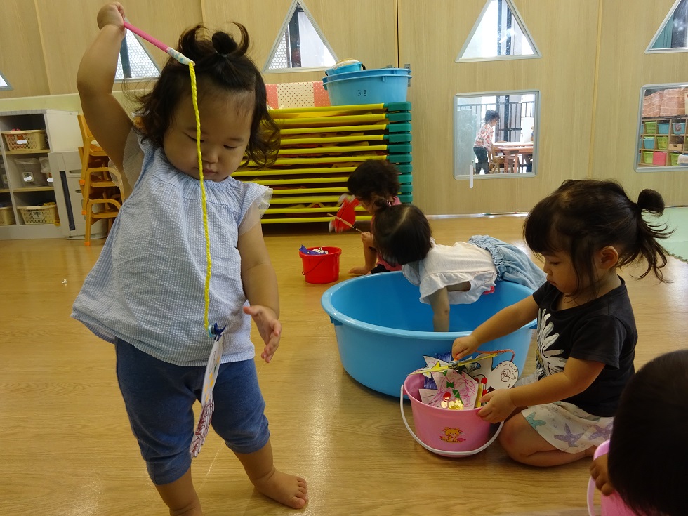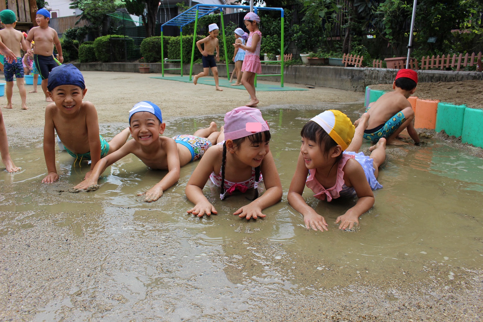 新聞をビリビリ破り、たくさん遊んだあとはプールの中へ♪