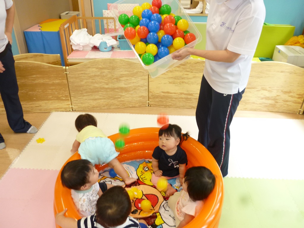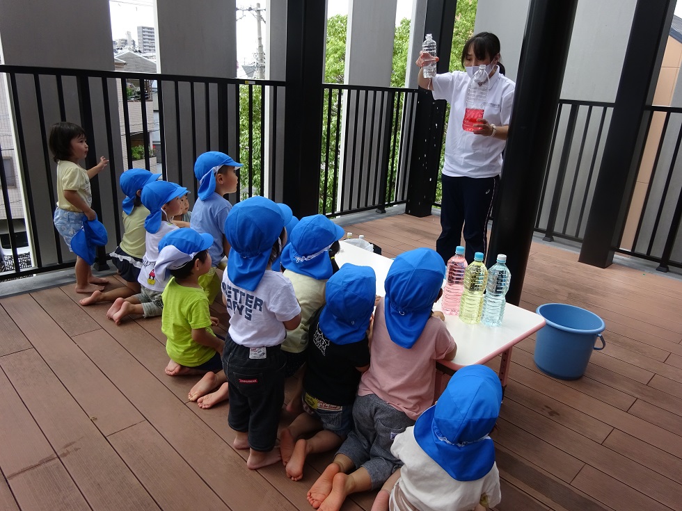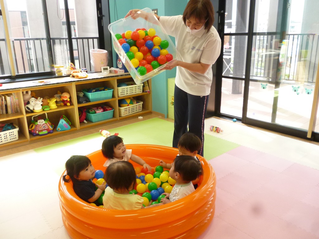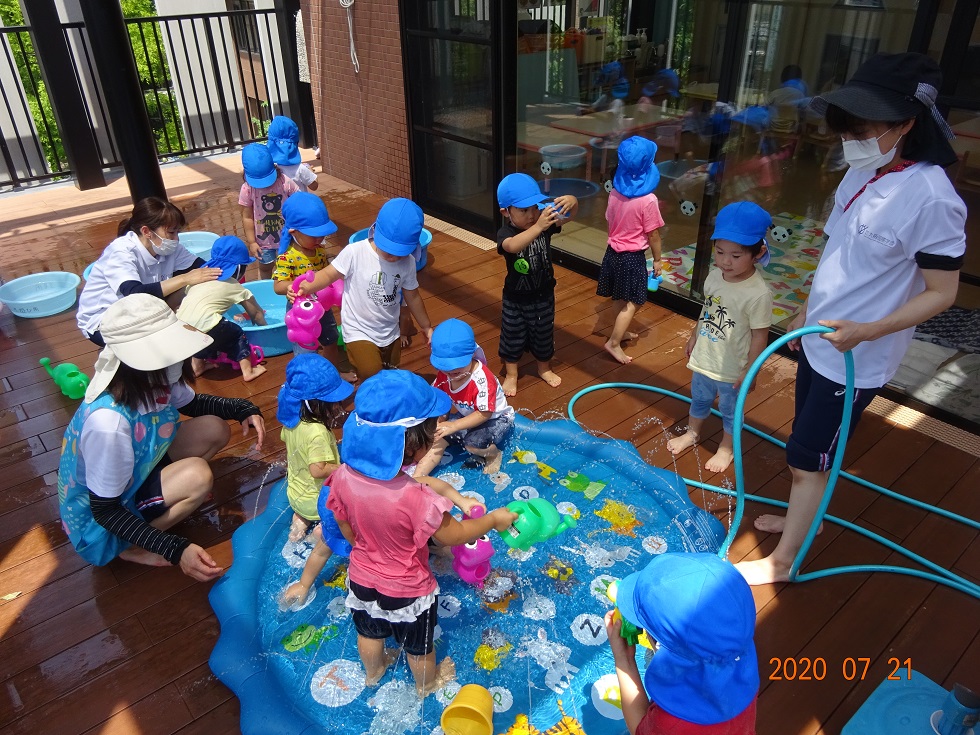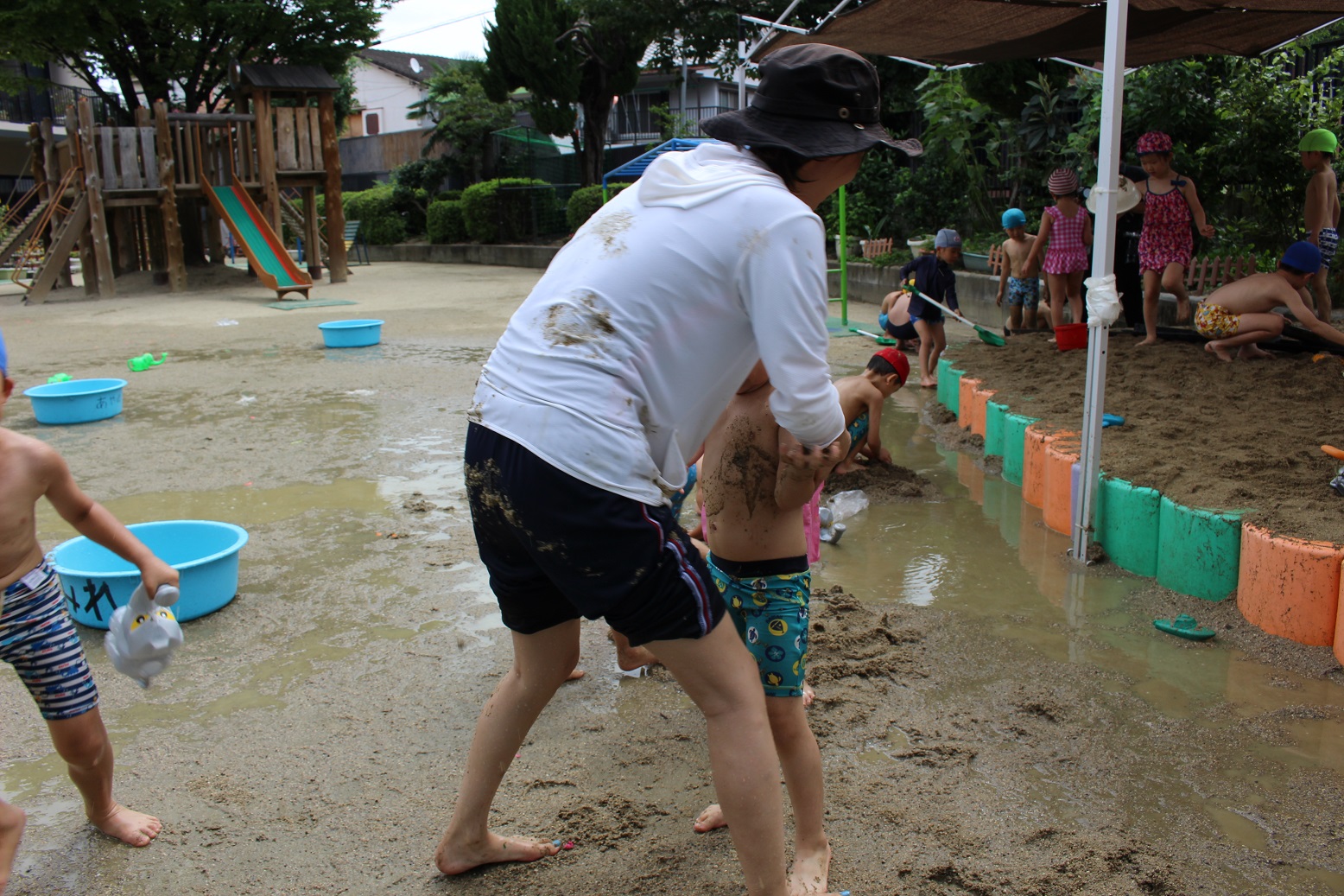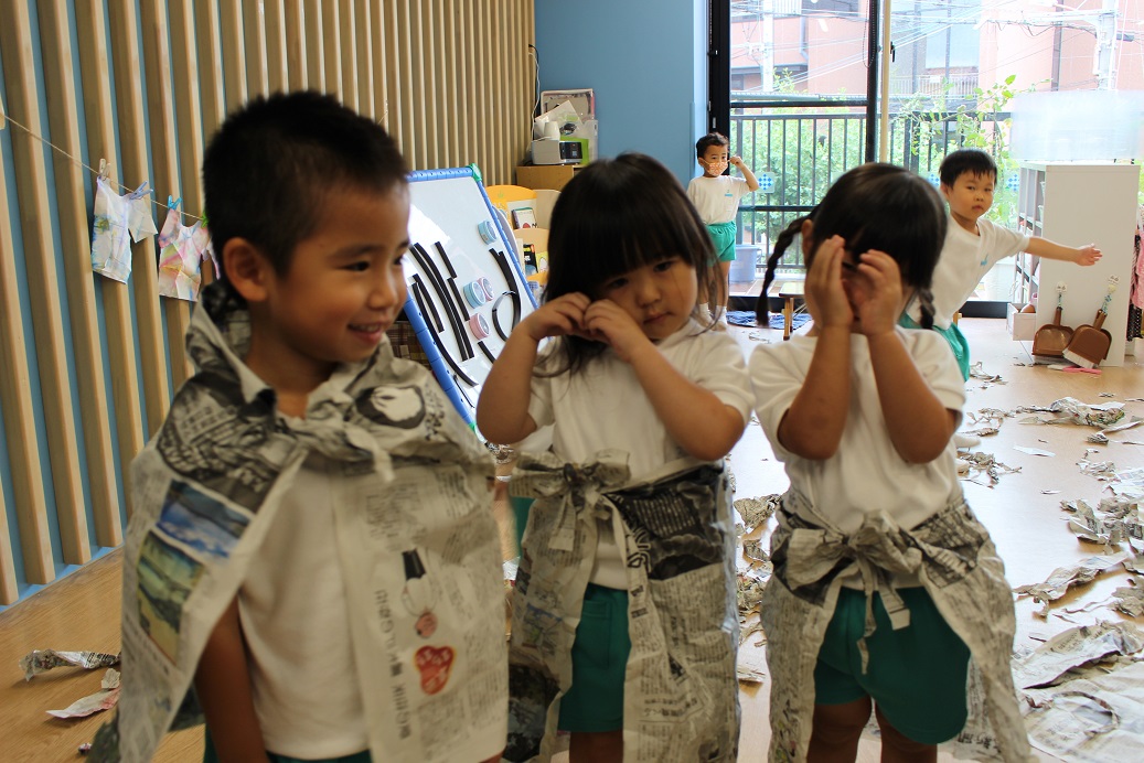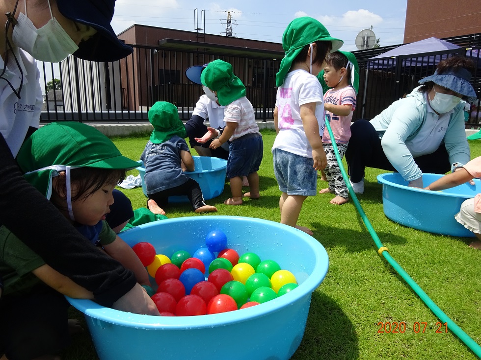 新聞をビリビリ破り、たくさん遊んだあとはプールの中へ♪