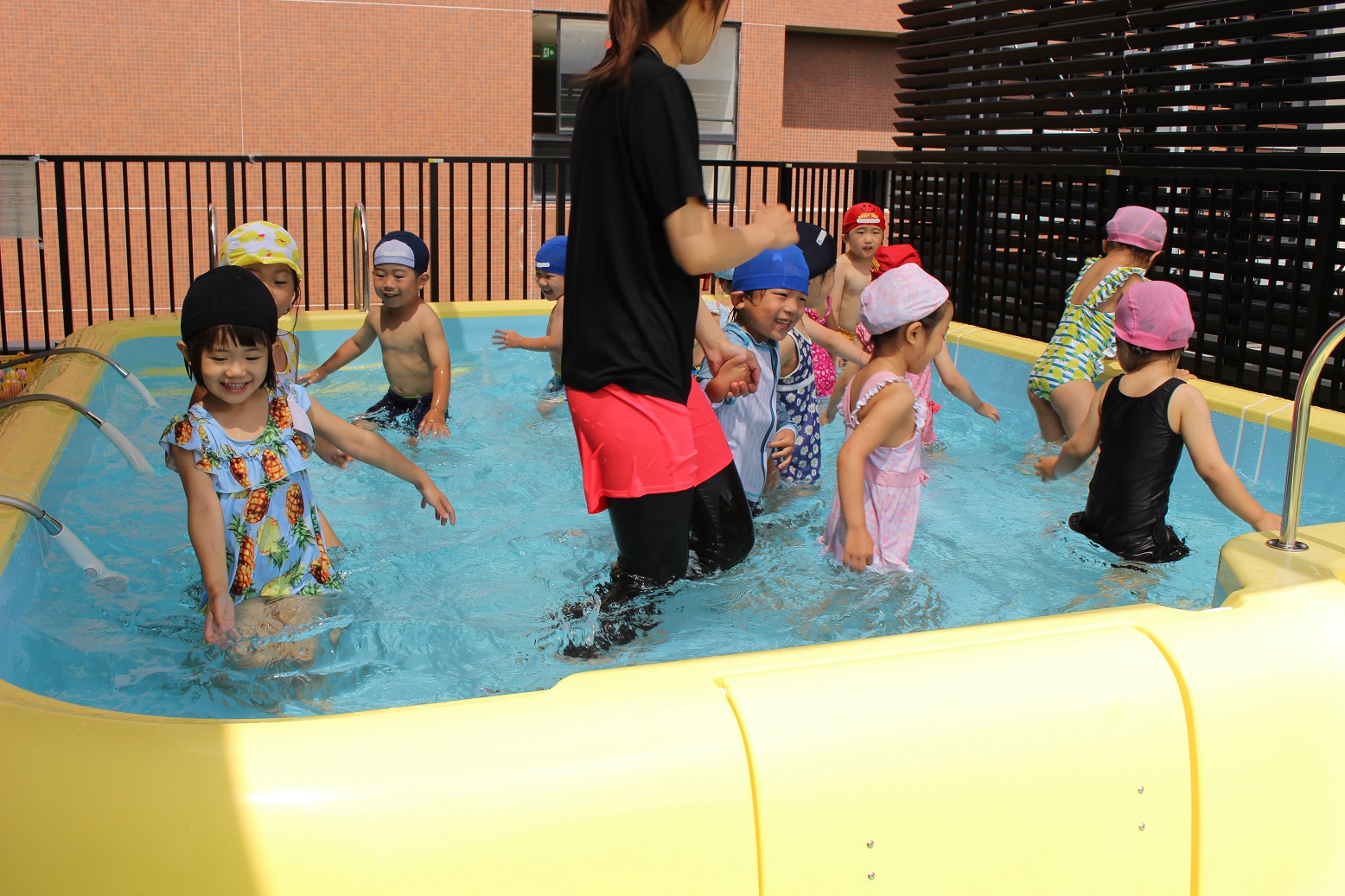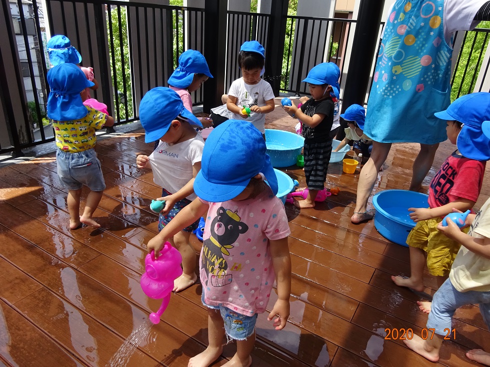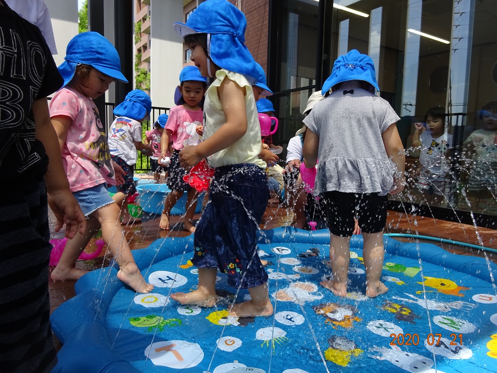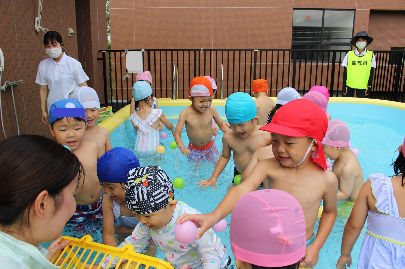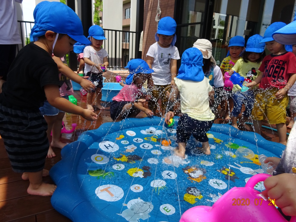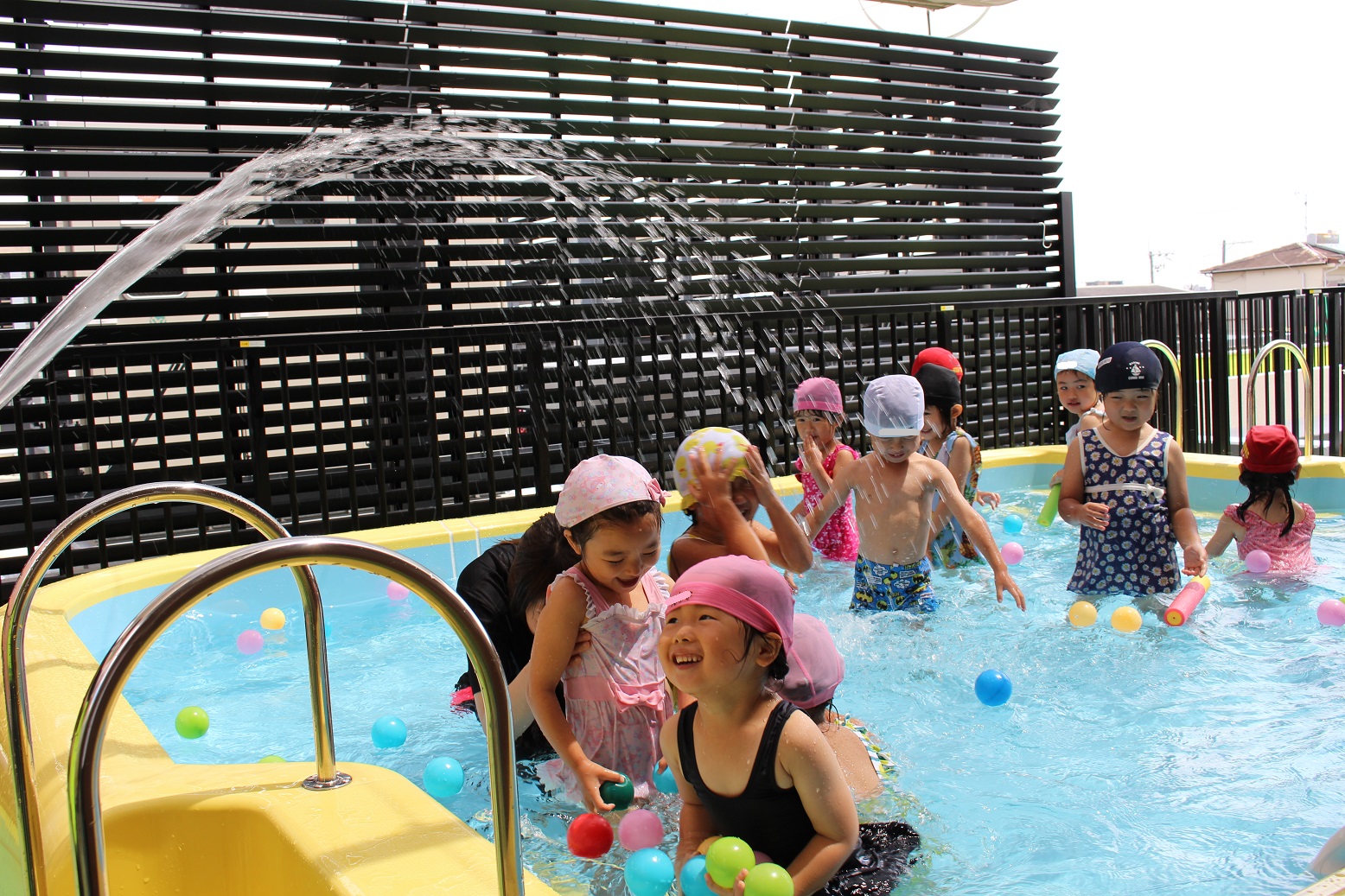 新聞をビリビリ破り、たくさん遊んだあとはプールの中へ♪