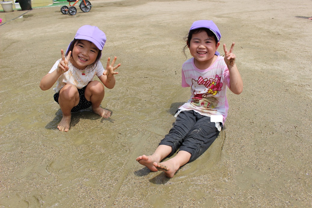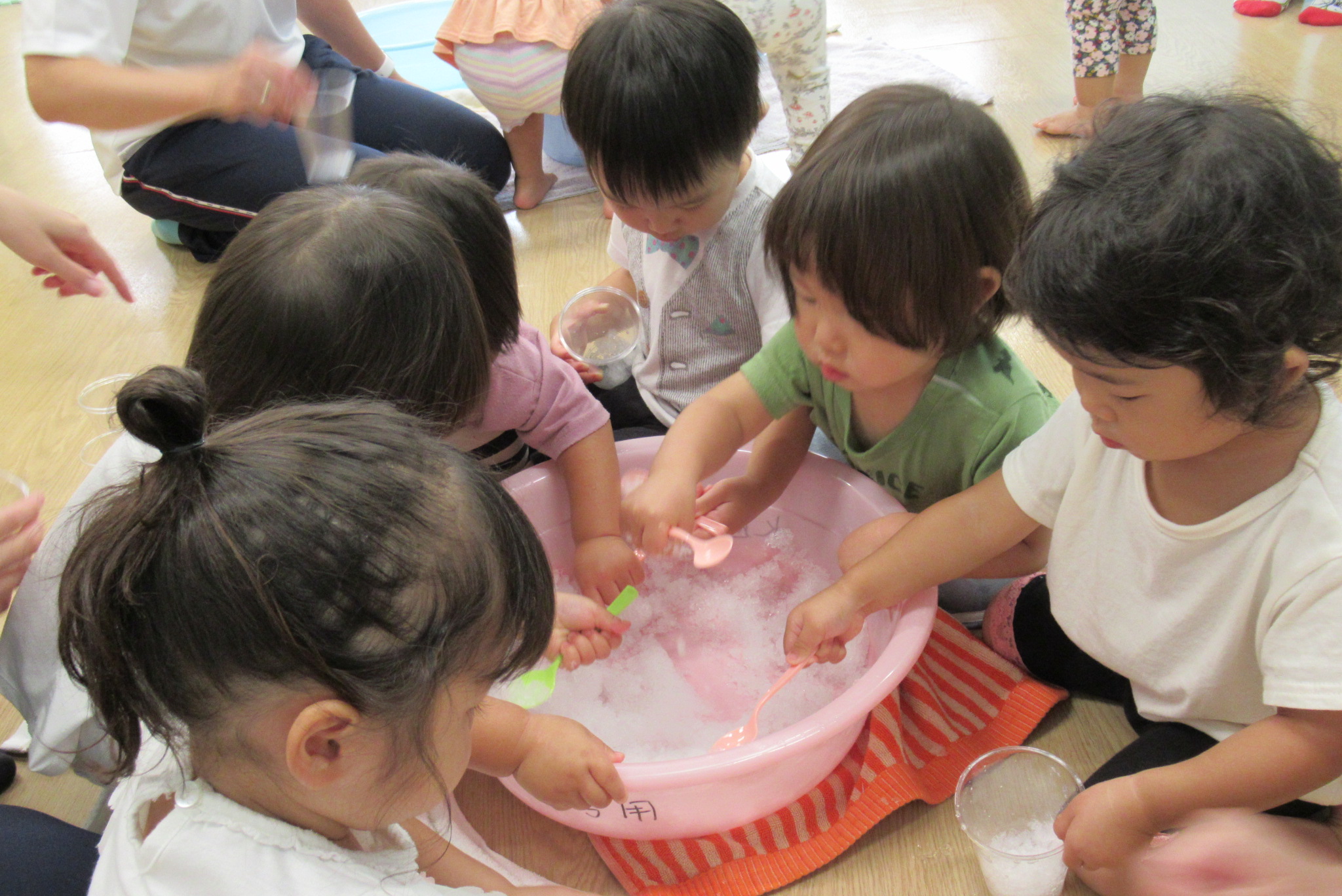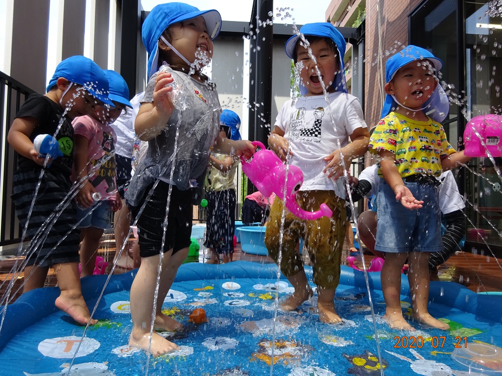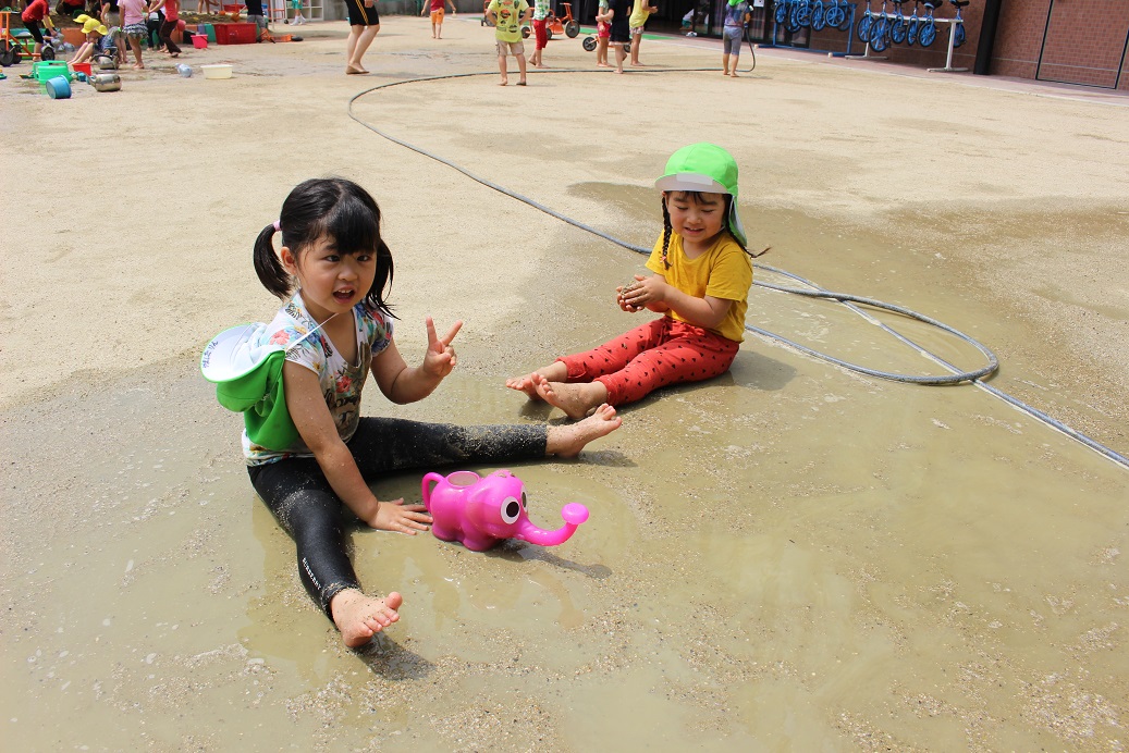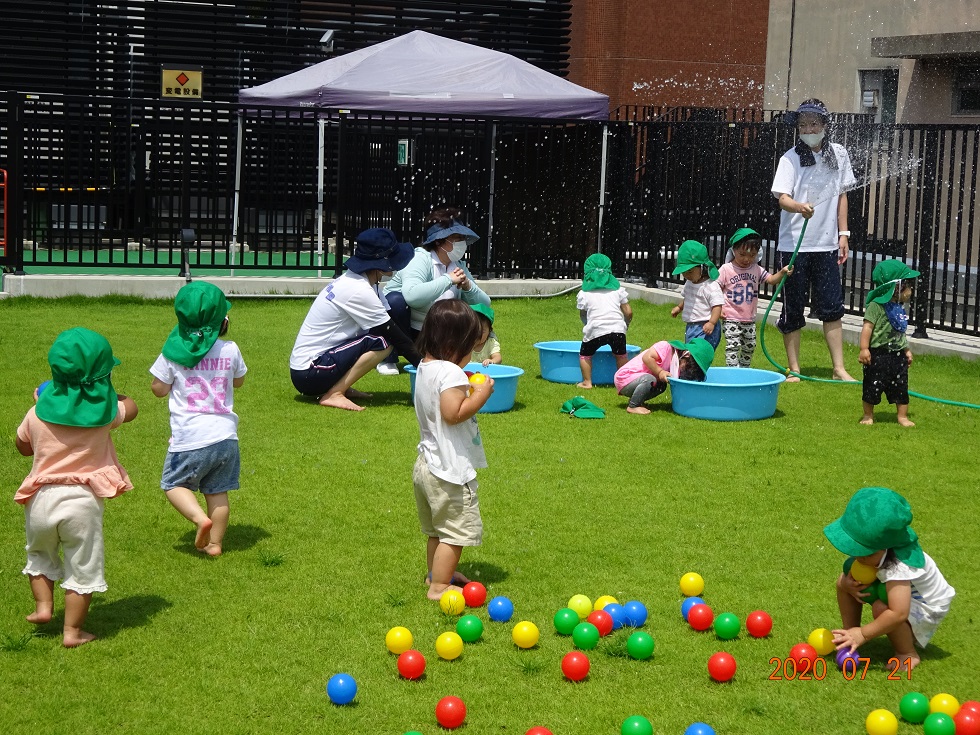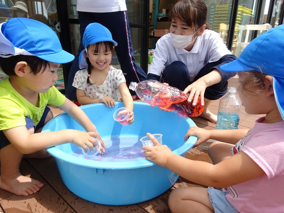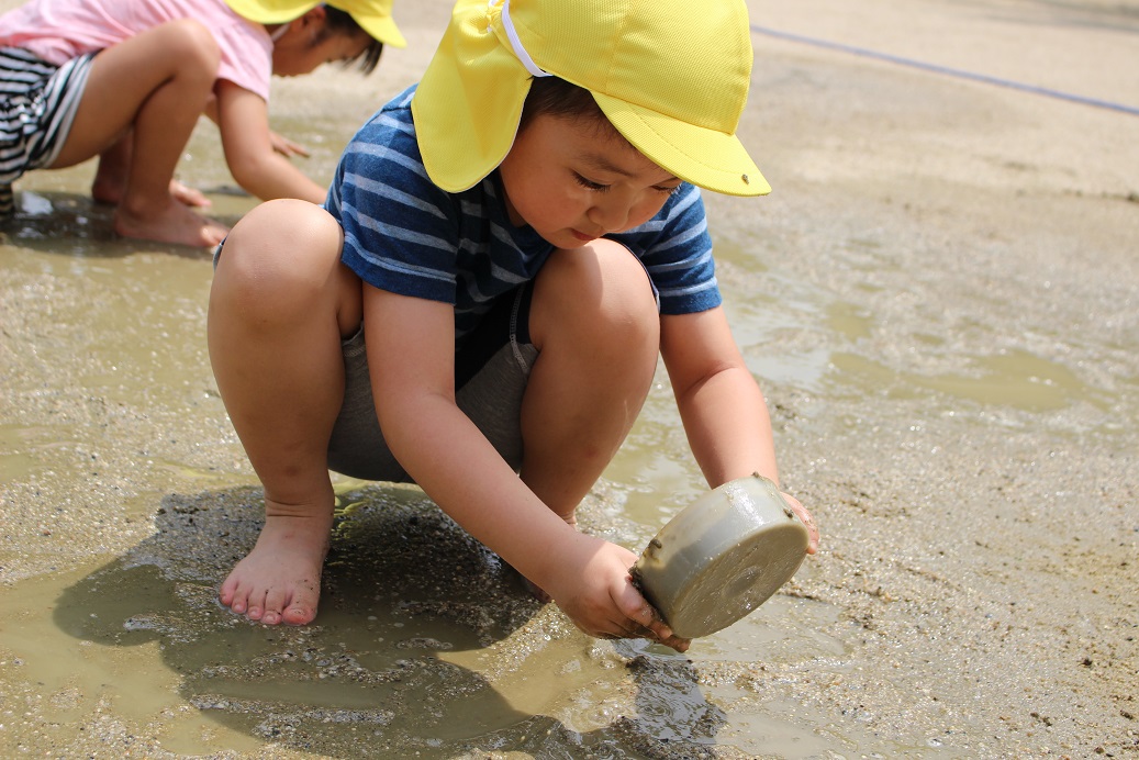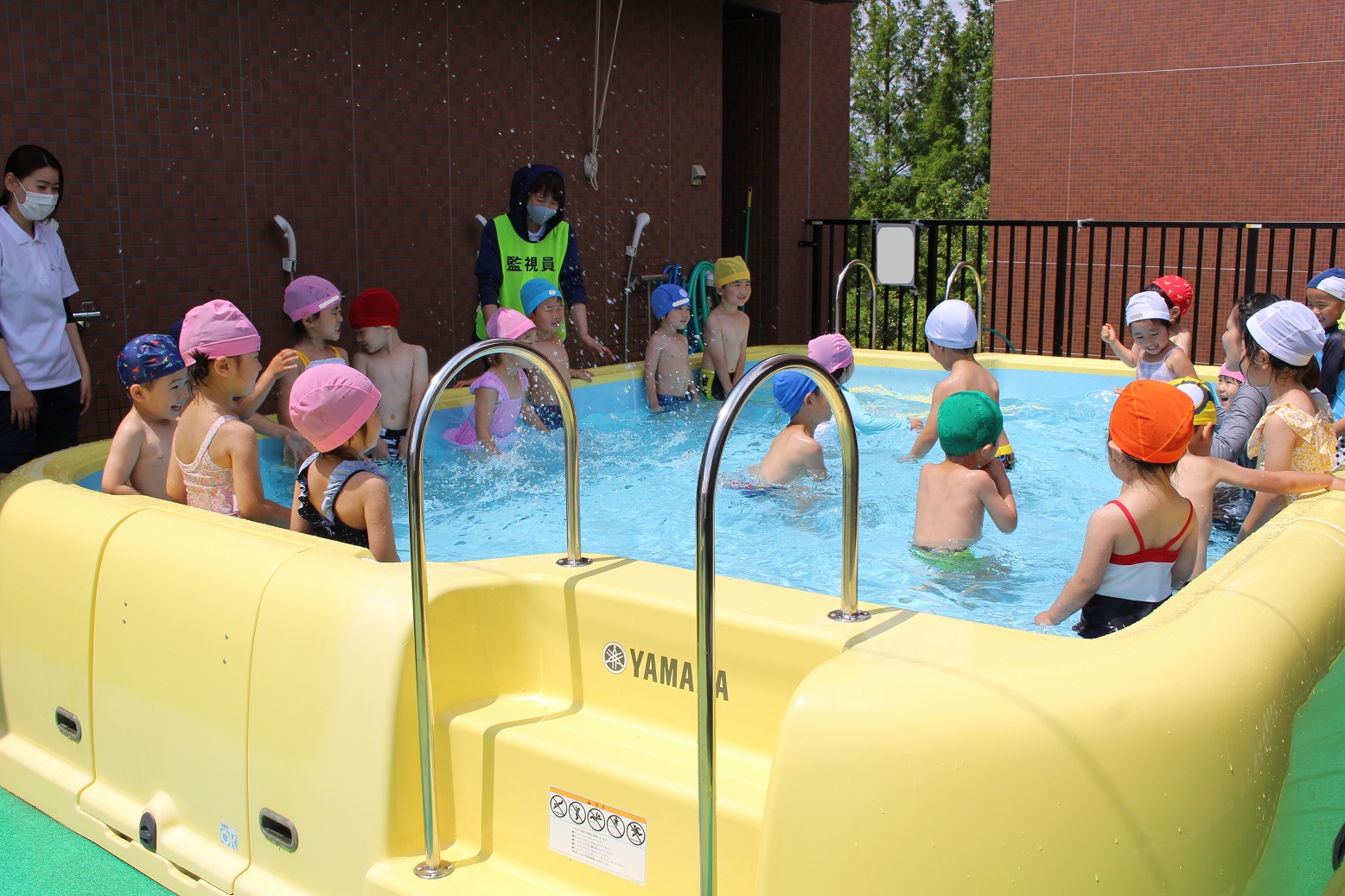 新聞をビリビリ破り、たくさん遊んだあとはプールの中へ♪
