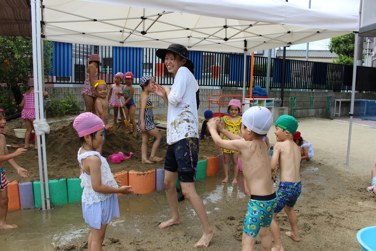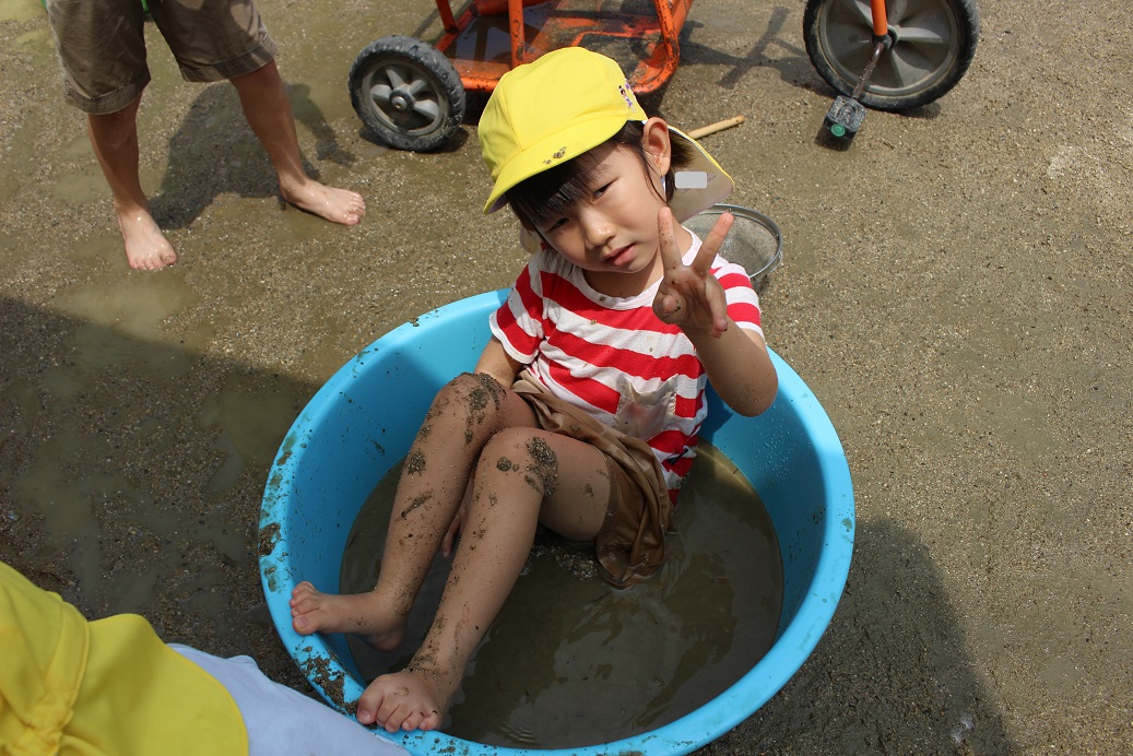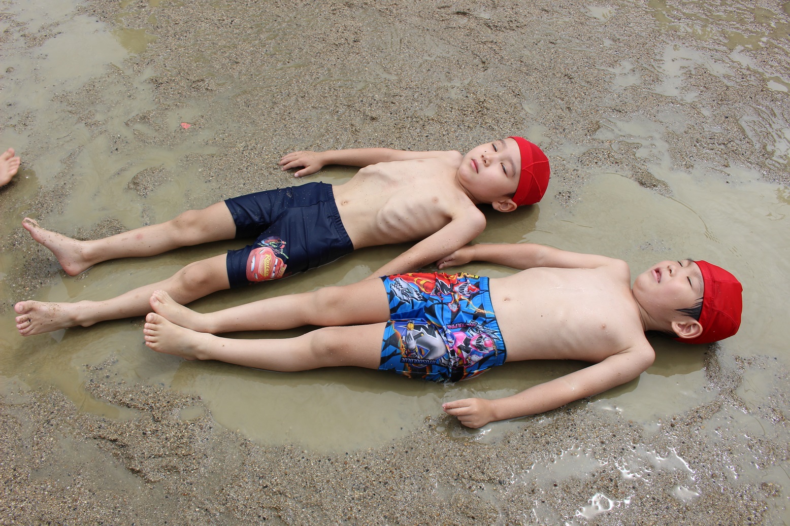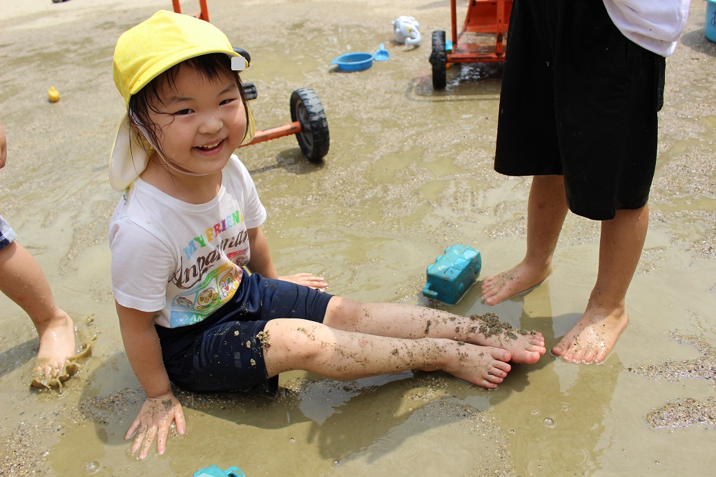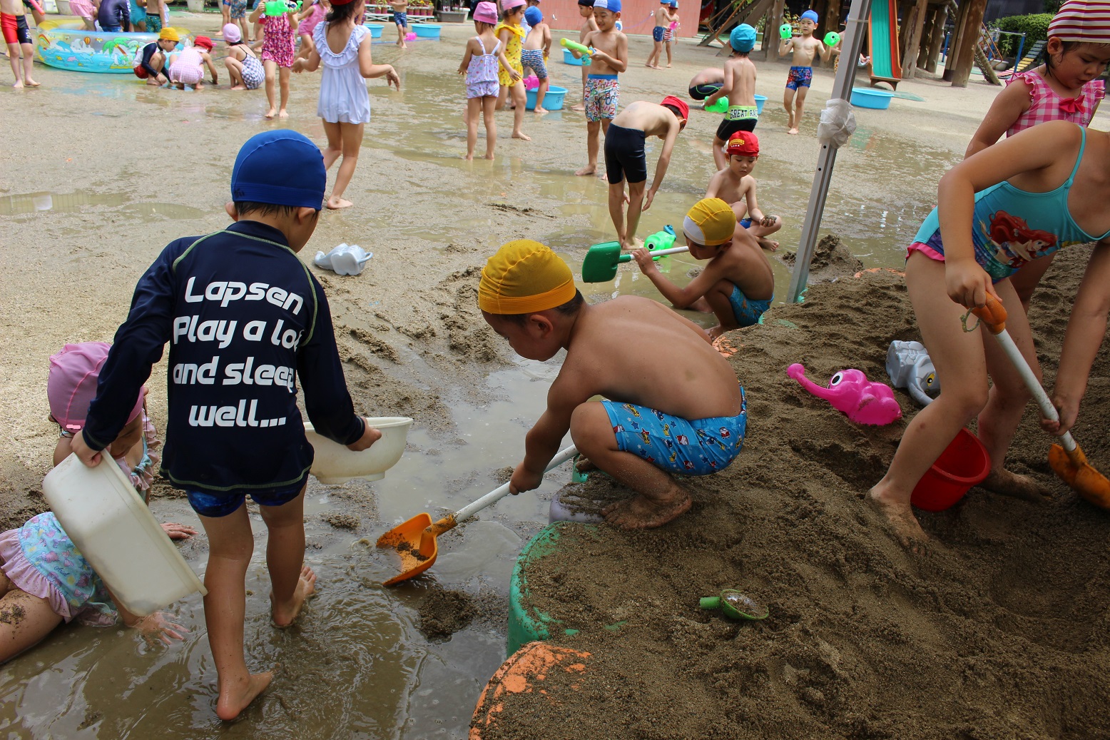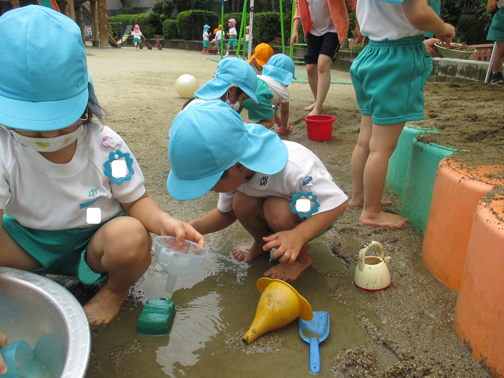 新聞をビリビリ破り、たくさん遊んだあとはプールの中へ♪