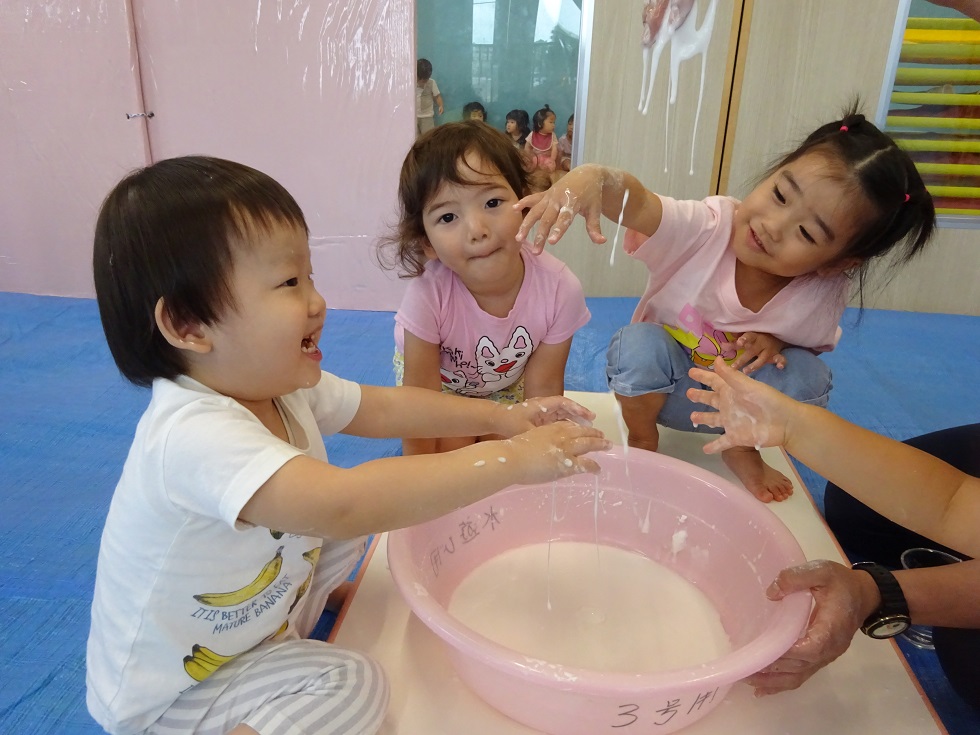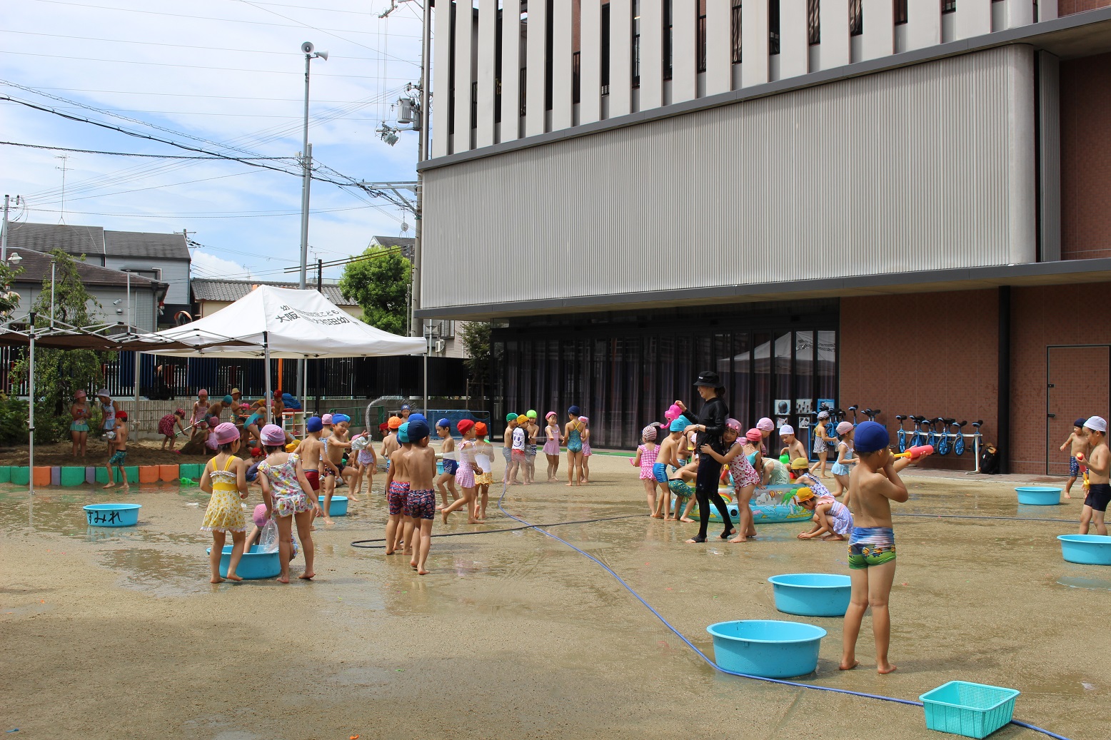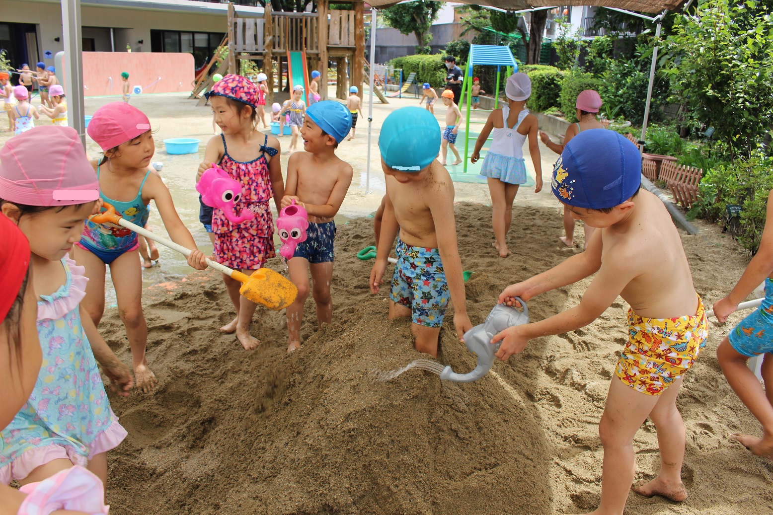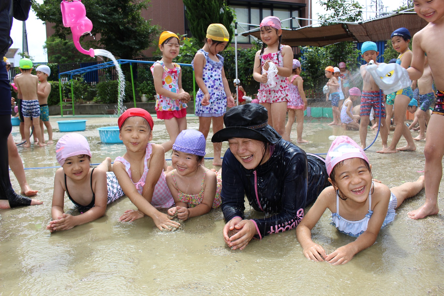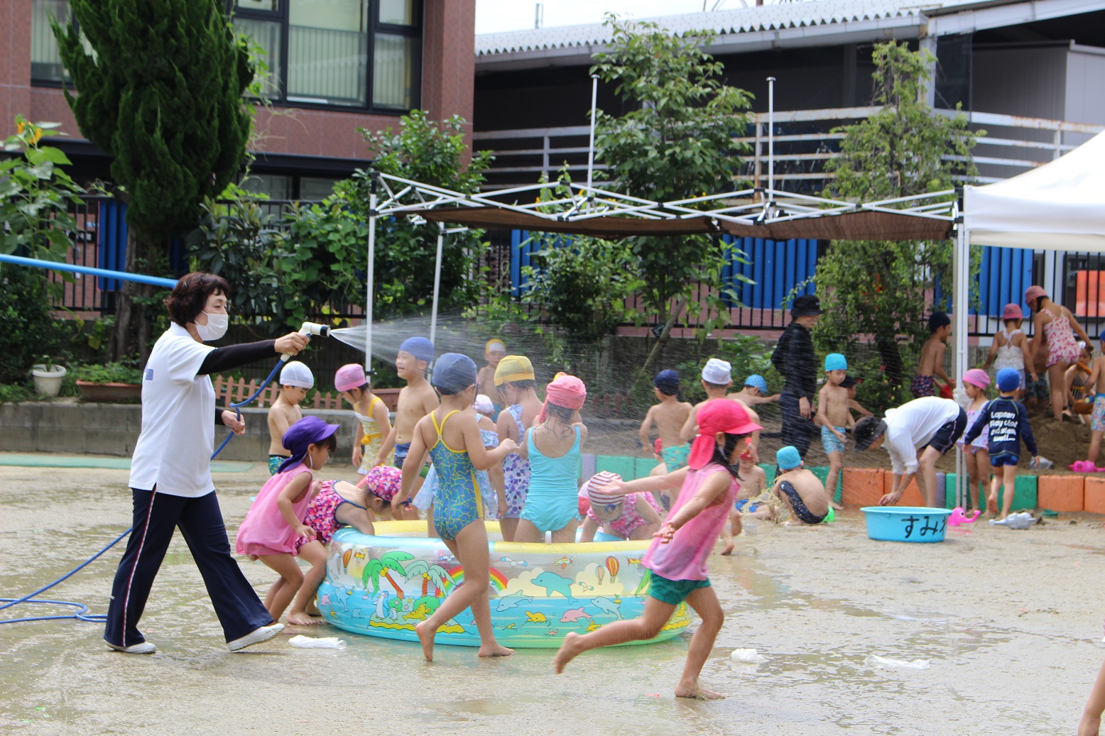 新聞をビリビリ破り、たくさん遊んだあとはプールの中へ♪