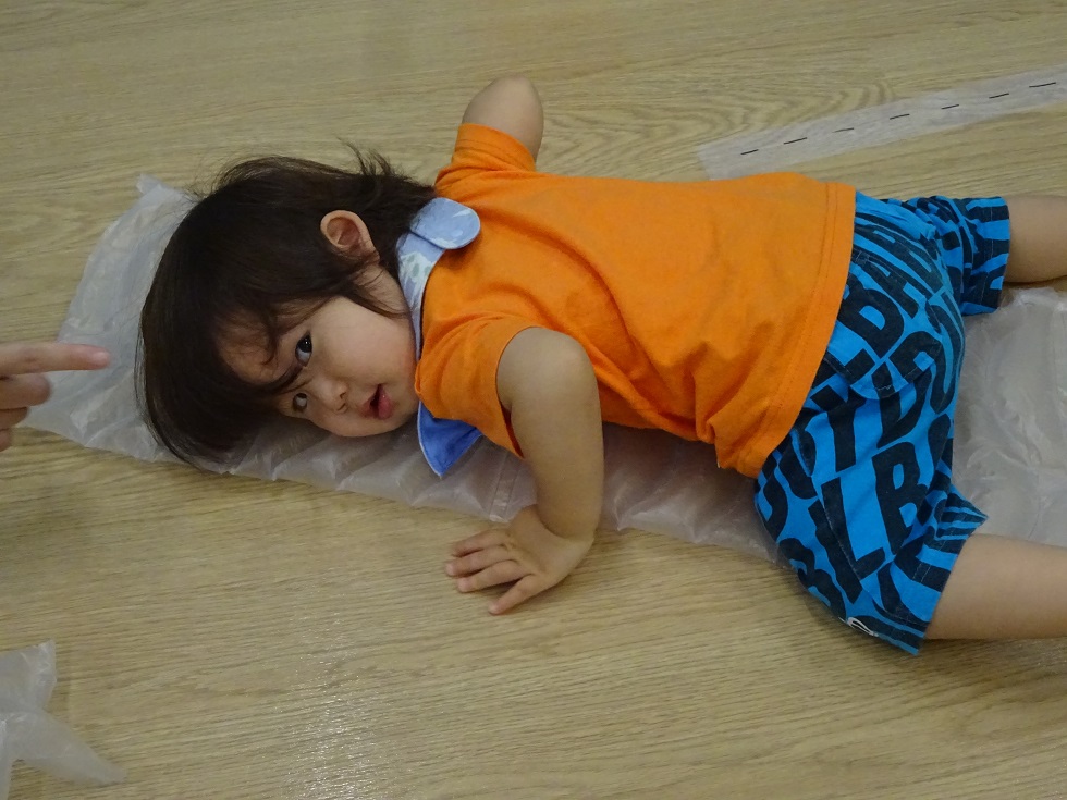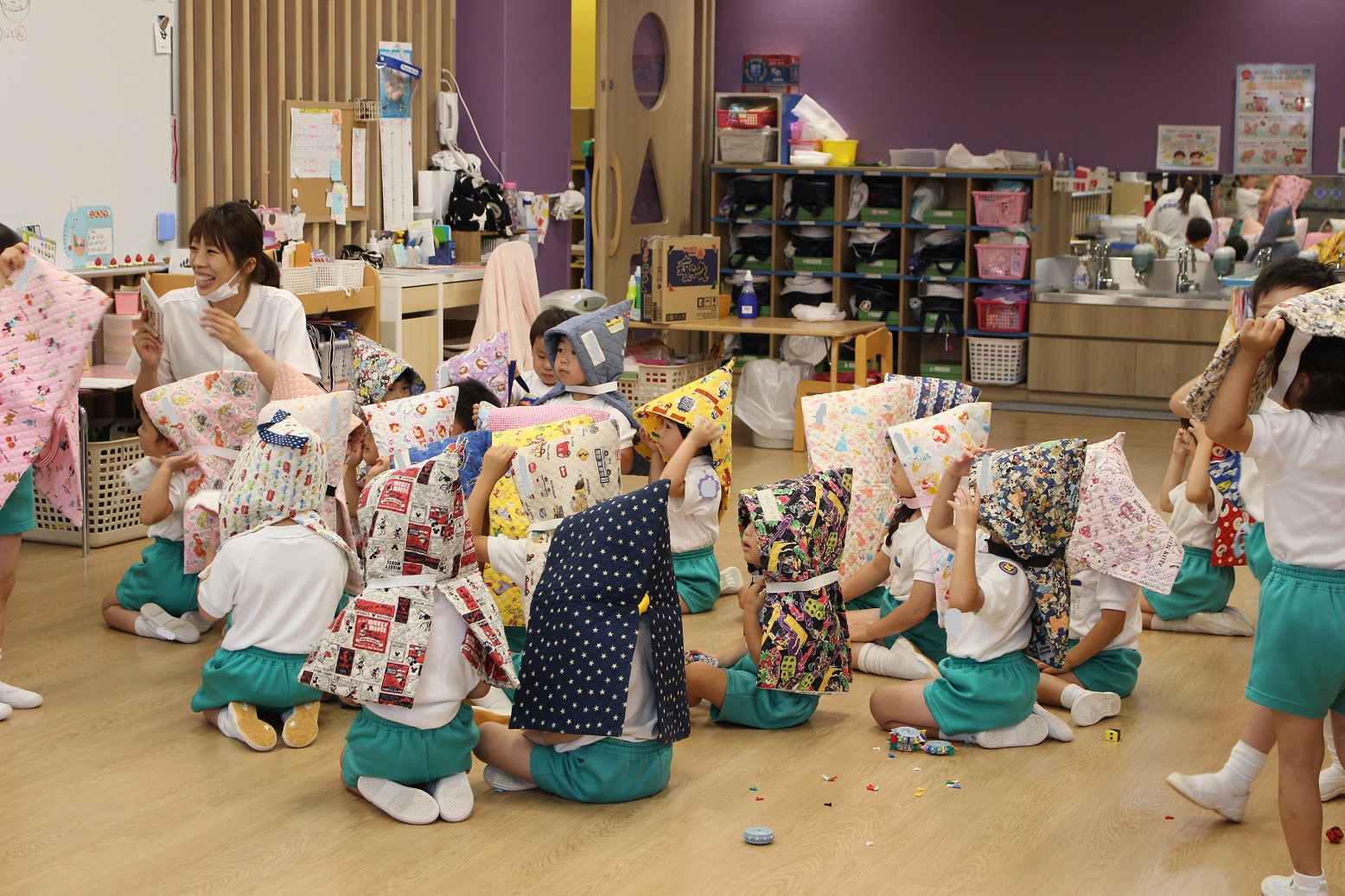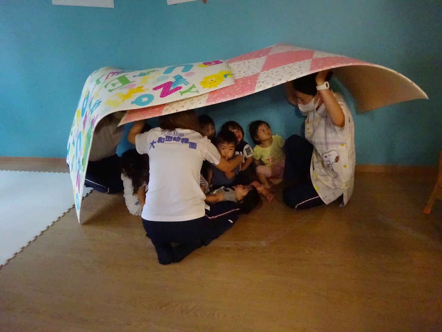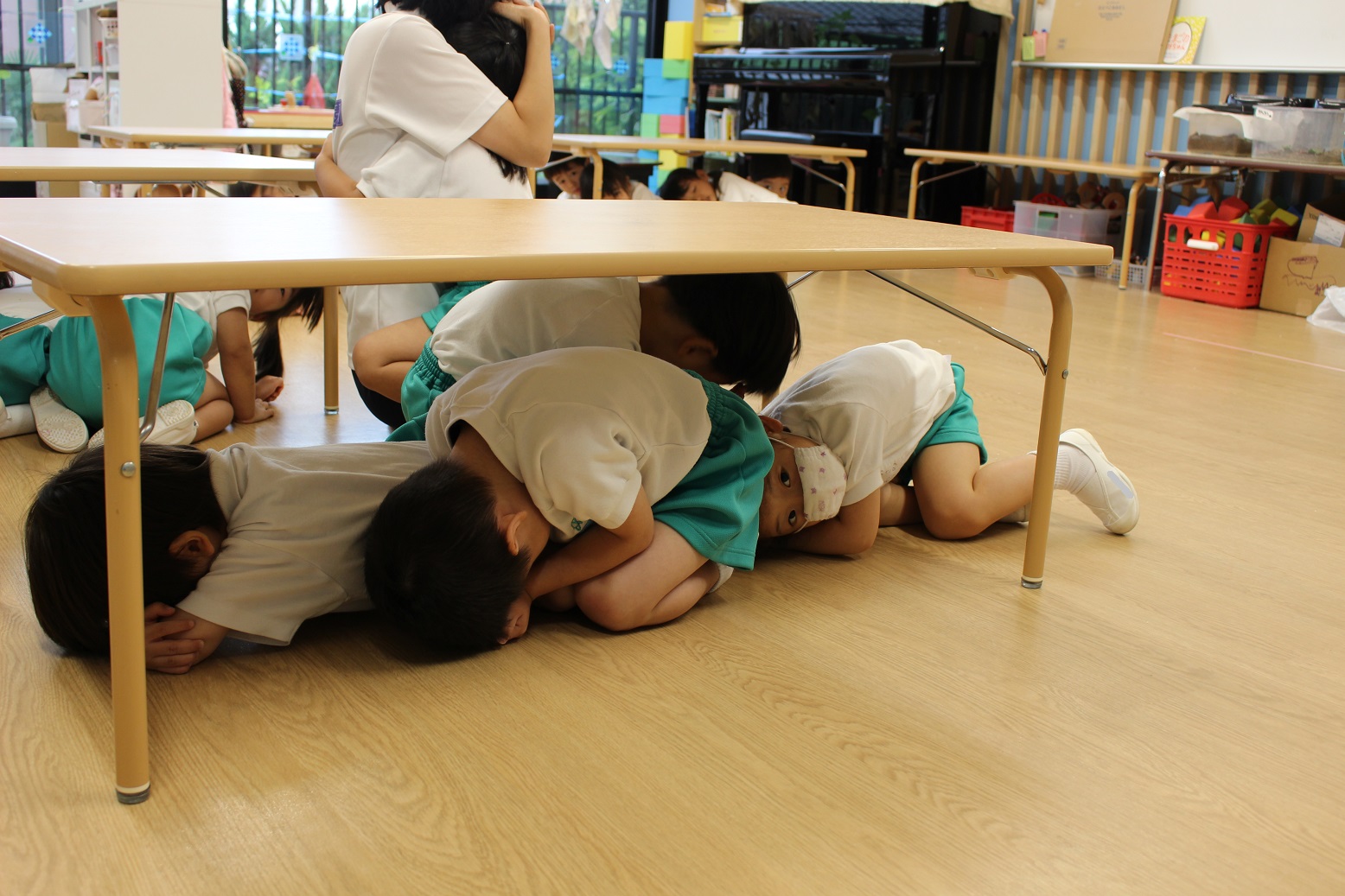 頭を隠したり、地震についての絵本を読んだりして、避難についての大切さを学んでいます。